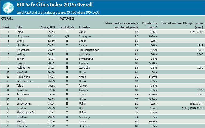 Phía châu Á không có đại diện nào lọt top này nhưng lại được vinh danh ở hạng mục khác với top 10 thành phố an toàn nhất thế giới cũng do The Economist công bố mới đây, dẫn đầu là Tokyo (Nhật Bản).