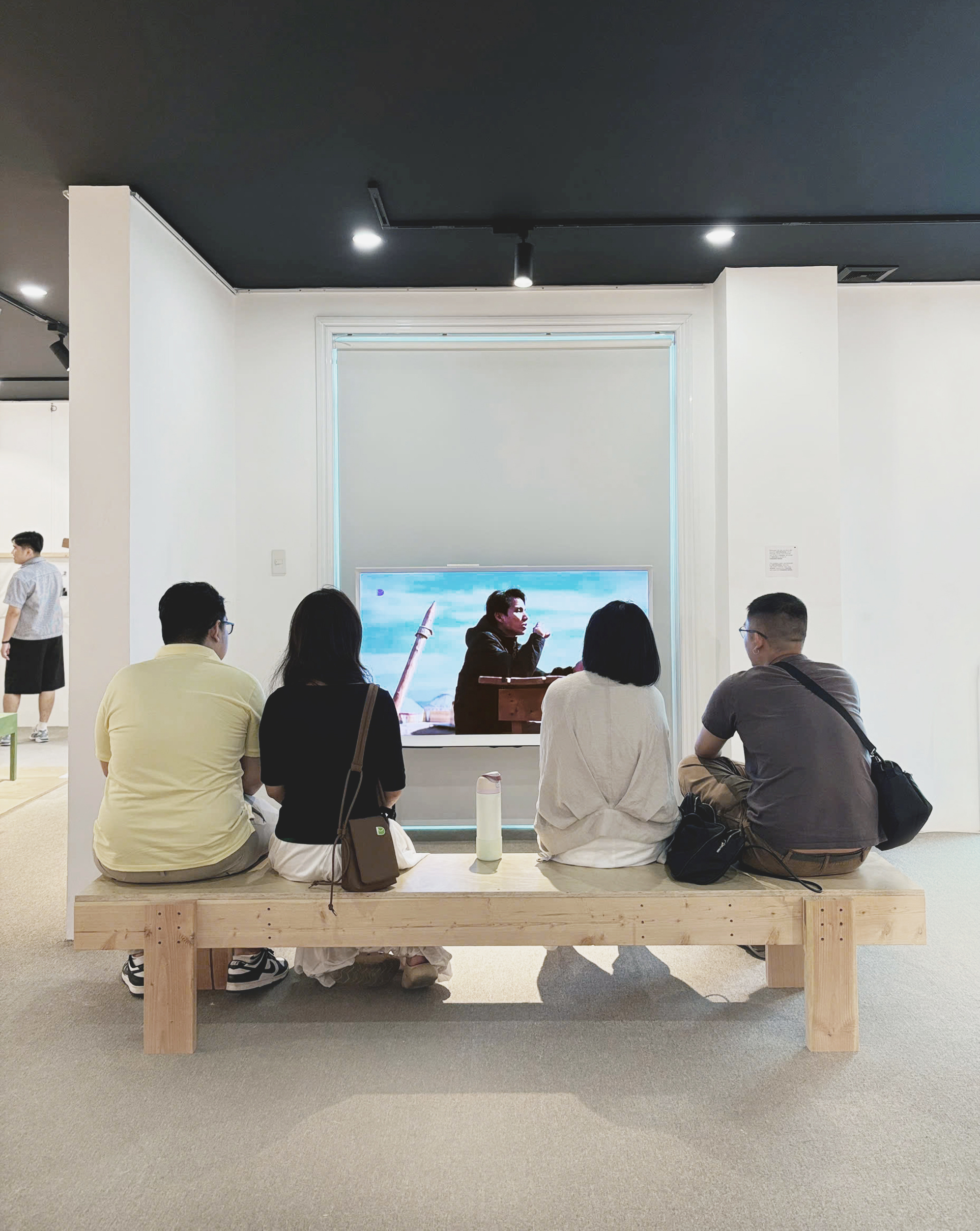 Ở tầng hai, nhịp điệu tiếp tục được phân đoạn bằng không gian chiếu phim tư liệu. Đây là một trong những khoảnh khắc giàu thông tin và chân thực nhất của toàn triển lãm: các kiến trúc sư, qua những chia sẻ súc tích, đưa người xem vào hành trình lên ý tưởng, khảo sát bối cảnh, vật liệu và phương pháp chế tác. Những câu chuyện về thử và sai, về giới hạn công nghệ, về những lần làm lại xuất hiện song song với những suy tư về ký ức, văn hóa và môi trường. Không gian này như một khoang trung chuyển, cân bằng năng lượng giữa bốn phòng triển lãm.