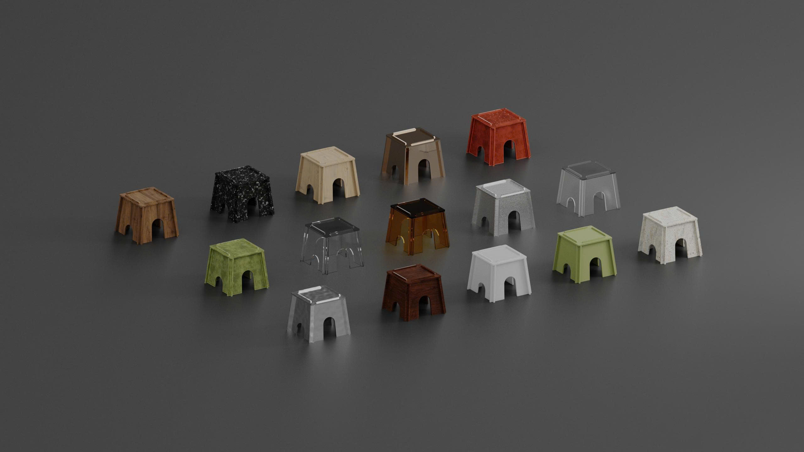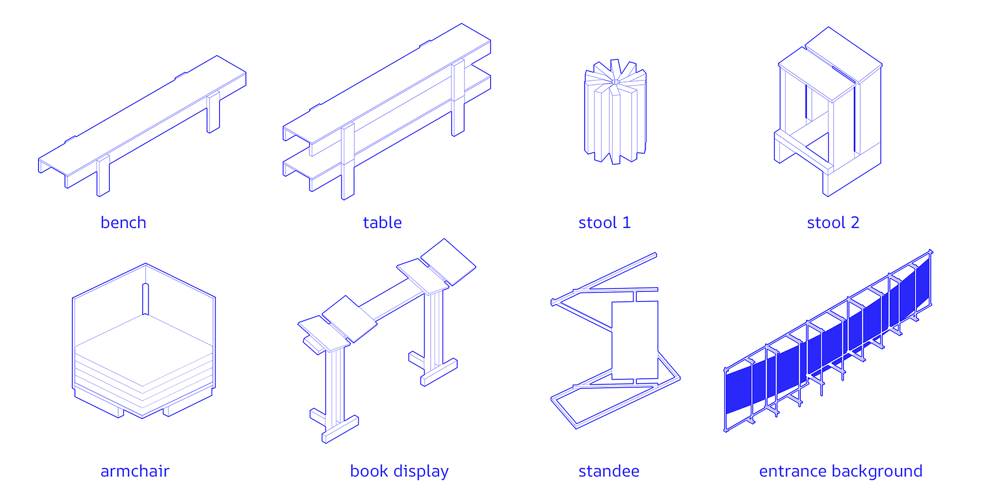 Thay vì lựa chọn các vật liệu công nghiệp mạnh mẽ, MoD quyết định sử dụng gỗ và vải xuyên suốt triển lãm: hai chất liệu vừa quen, vừa ấm áp, vừa không áp đặt thẩm mỹ lên tác phẩm. Gỗ mang lại chiều sâu vật lý và sự ổn định; vải điều tiết âm thanh, ánh sáng, bầu không khí. Lựa chọn này làm dịu sự cạnh tranh giữa kiến trúc biệt thự và hình hài ghế; đồng thời bổ sung độ thân thiện mà MoD muốn có để có thể tiếp cận với học sinh và đại chúng.