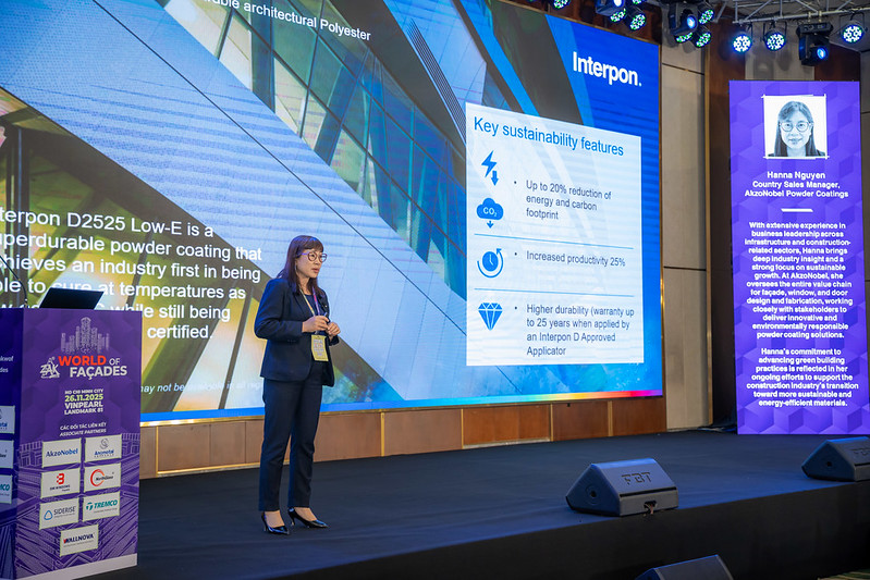 Trong bài tham luận chính, bà Nguyễn Thị Thanh Hà (Hanna Nguyễn) – Giám đốc Kinh doanh Quốc gia tại Việt Nam, Philippines và Campuchia – đã chia sẻ các xu hướng mới nhất và dữ liệu thực tế về vật liệu nhẹ trong xây dựng hiện đại, đồng thời giới thiệu sơn bột tĩnh điện như một giải pháp mô phỏng hiệu suất cao của các vật liệu tự nhiên. Bà cũng tái khẳng định cam kết của AkzoNobel đối với sự bền vững thông qua các giải pháp hỗ trợ toàn diện của Interpon giúp thương hiệu, đối tác, nhà cung cấp và khách hàng cùng hiện thực hóa tầm nhìn chung về phát triển bền vững.