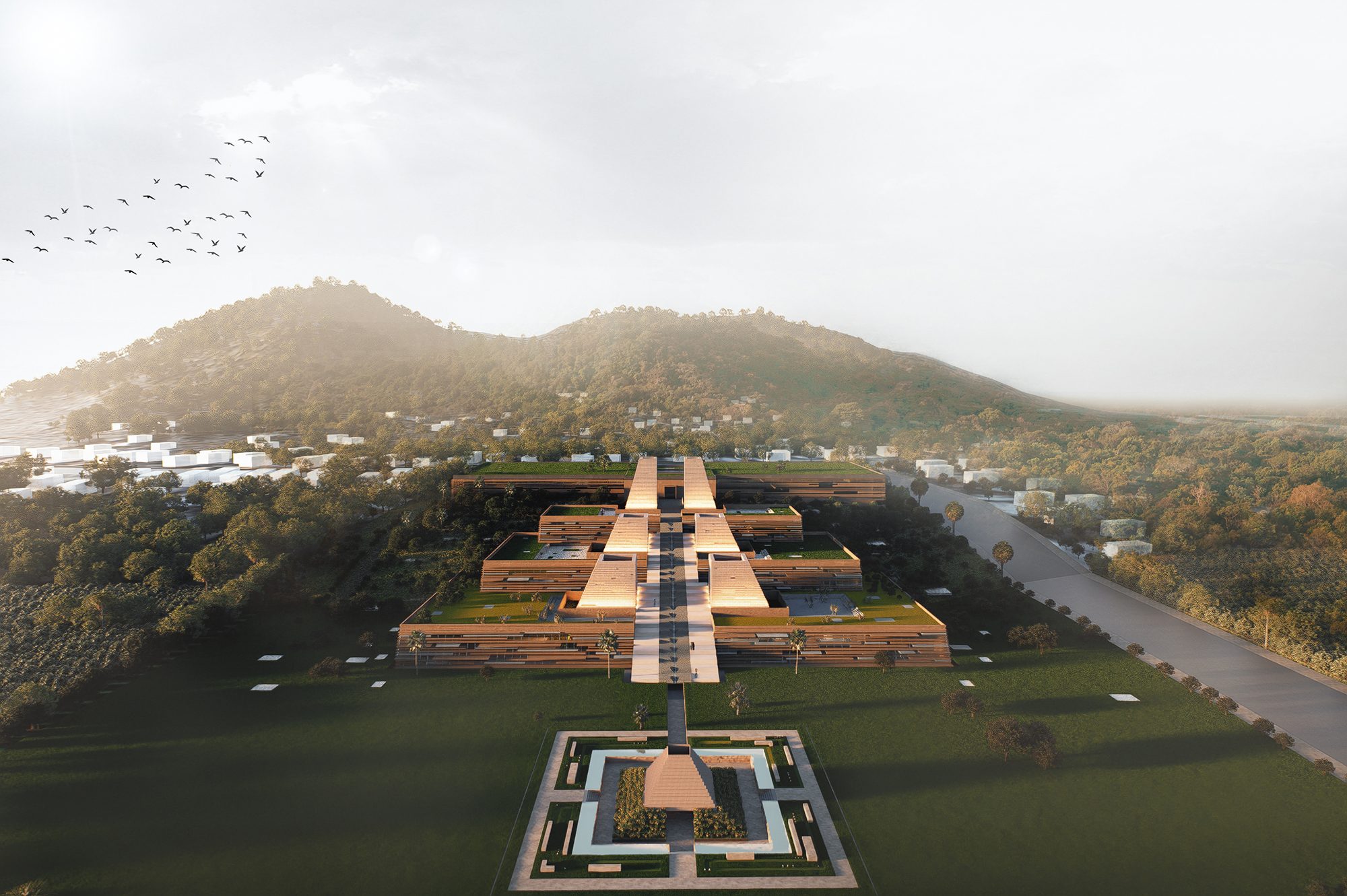 - Sử dụng hệ thống mái xanh và tường đất rammed-earth kết hợp đá Ba Thê – vật liệu bản địa có khả năng điều tiết nhiệt tốt.