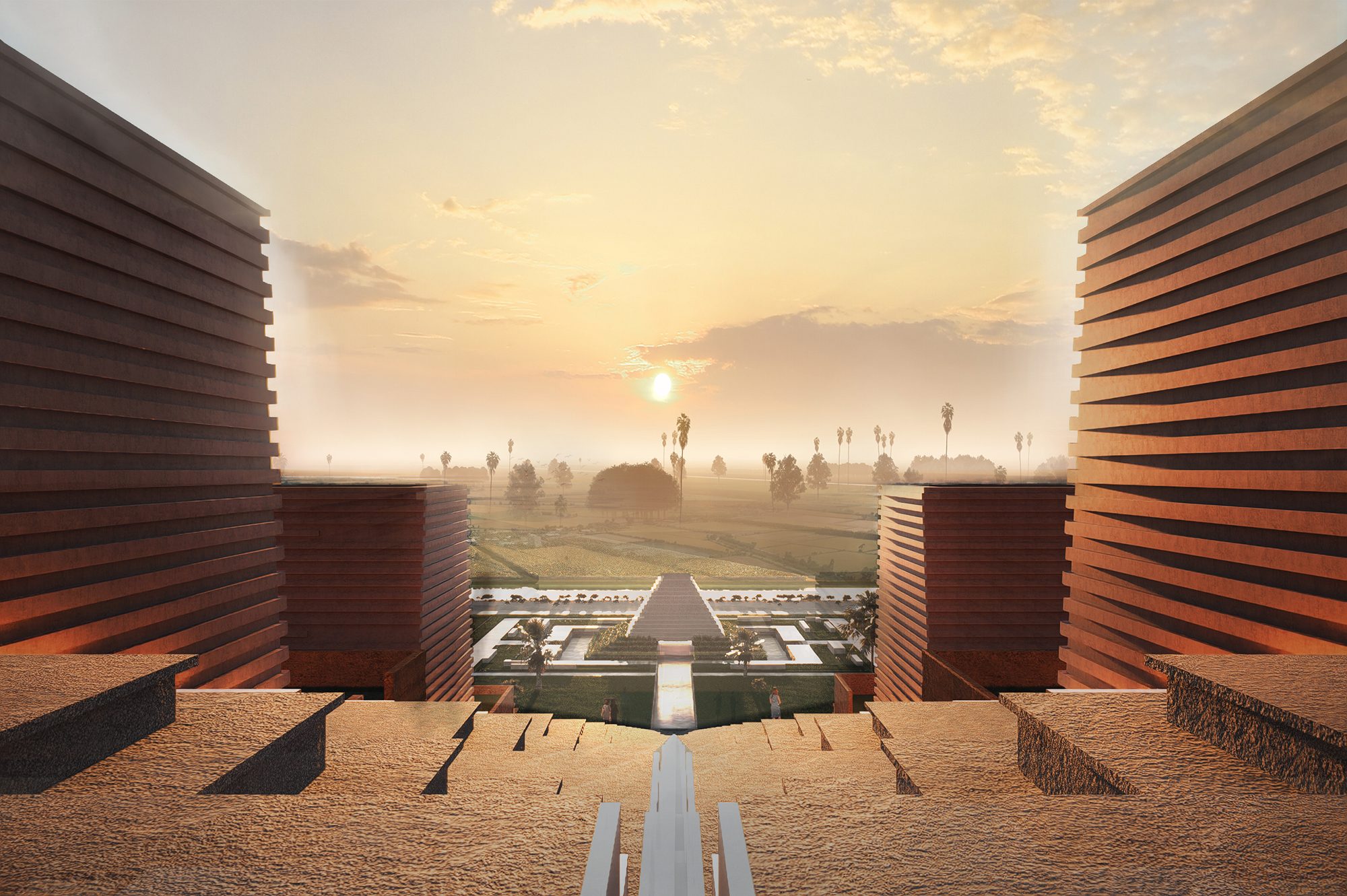 Từ điểm cao trên mái, du khách có thể nhìn ra toàn cảnh đồng bằng Óc Eo; điểm kết là quảng trường “Temple of Steps” – một không gian tâm linh kết nối Trời và Đất.