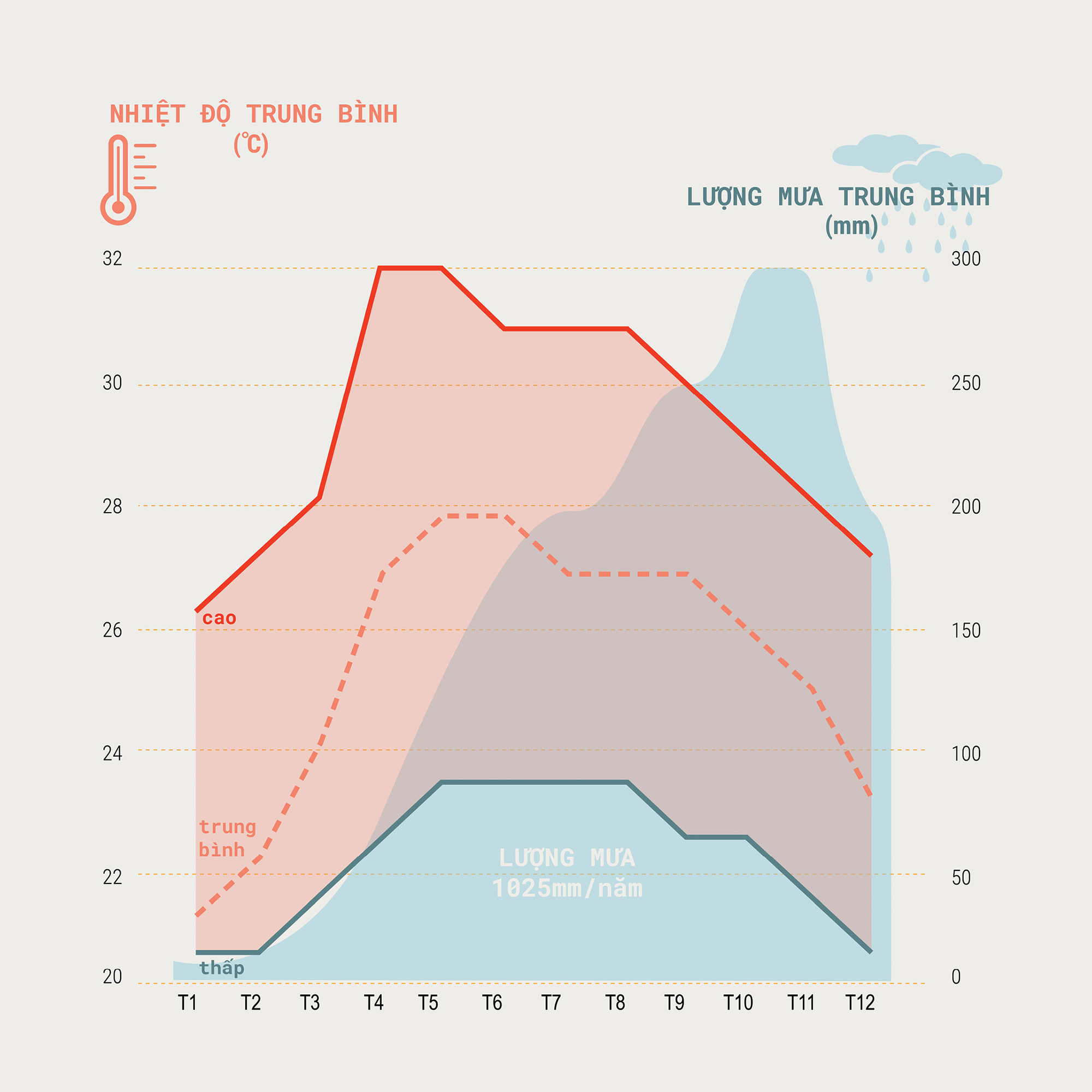 Lượng nắng trung bình khu vực cao (2.500-2.600 giờ nắng/năm; tương đương 200 giờ/tháng; 6,7 giờ/ngày) kết hợp với độ ẩm thấp tạo ra không khí khô nóng khi di chuyển ngoài trời nhất là vào buổi trưa. Gió chủ yếu là gió mùa và gió tín phong, thổi mạnh mang không khí khô từ biển Nha Trang vào.