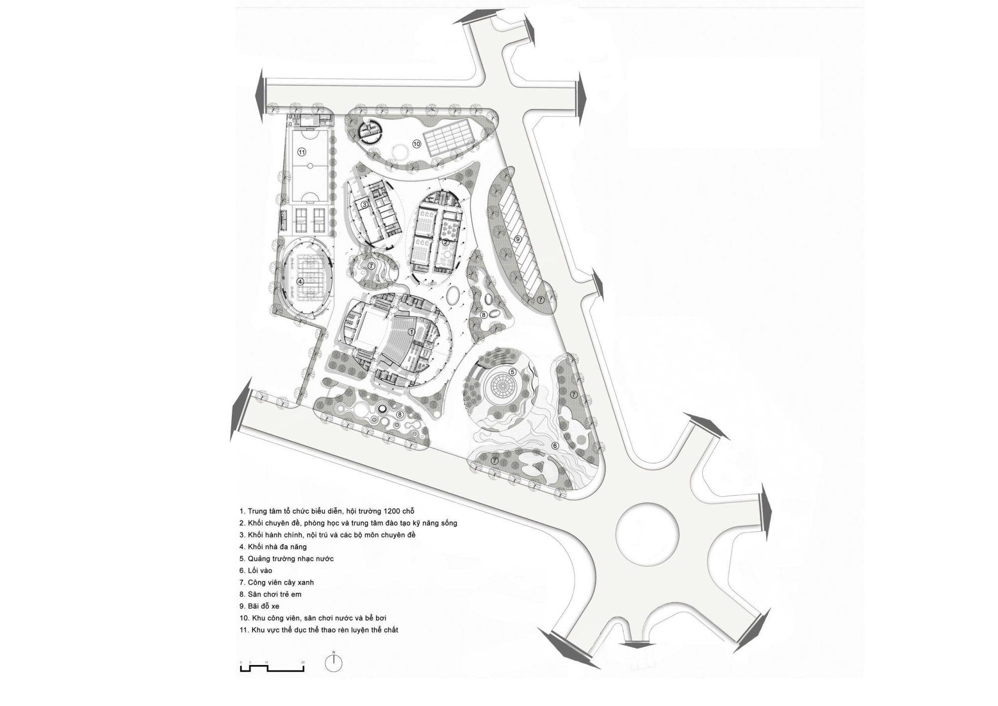 Hình dáng các khối của công trình là tập hợp liên hoàn các khối elip tạo tính chuyển động, nét uyển chuyển phong phú về không gian biểu hiện cho tính năng động tương tác của thiếu nhi. Đặc biệt, hình khối công trình cũng tạo cảm giác không gò cứng đối với một đô thị hiện đại ngày nay.