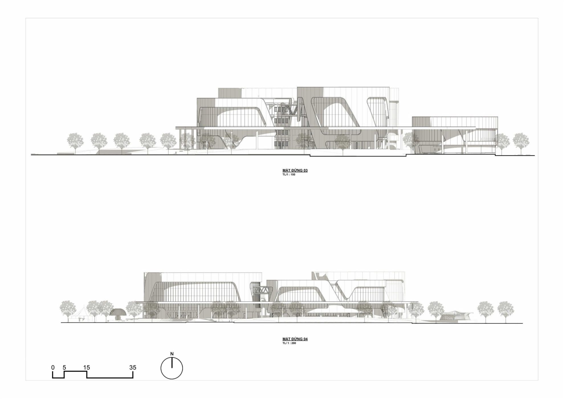 Hệ thống mặt dựng công trình 2 lớp vỏ tạo hệ thống cách nhiệt thông gió làm mát không giản sử dụng các phòng bên trong. Điểm khó khăn bởi hệ thống tấm facade phải thi công cong 2 phương vừa theo hình chu vi Elip phương ngang các khối nhà vừa uốn lượn phương dọc bởi hệ kết cấu thép nhô ra 80cm của lớp vỏ.