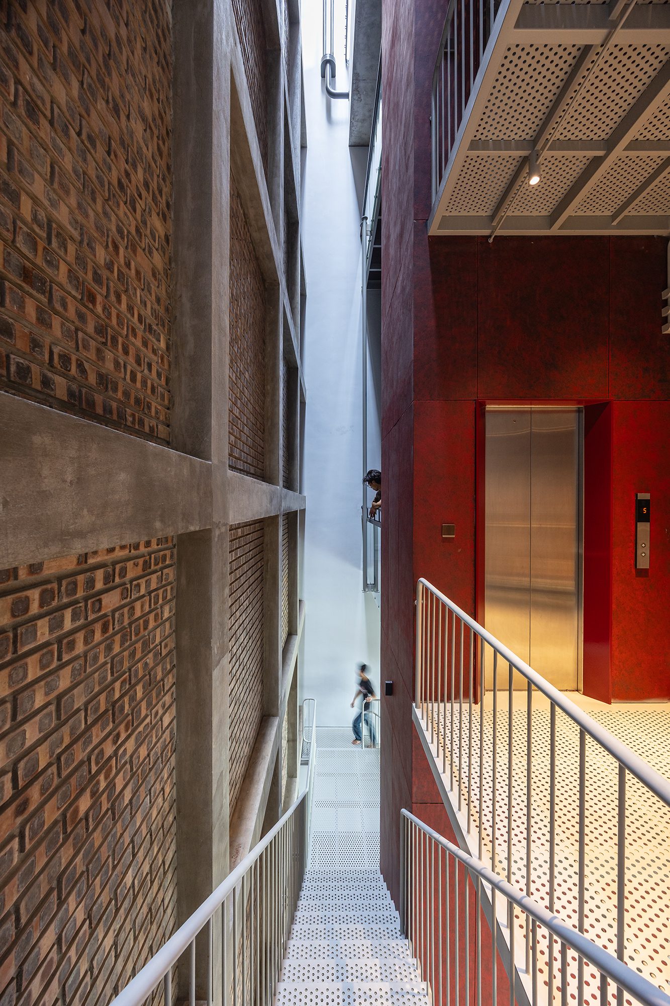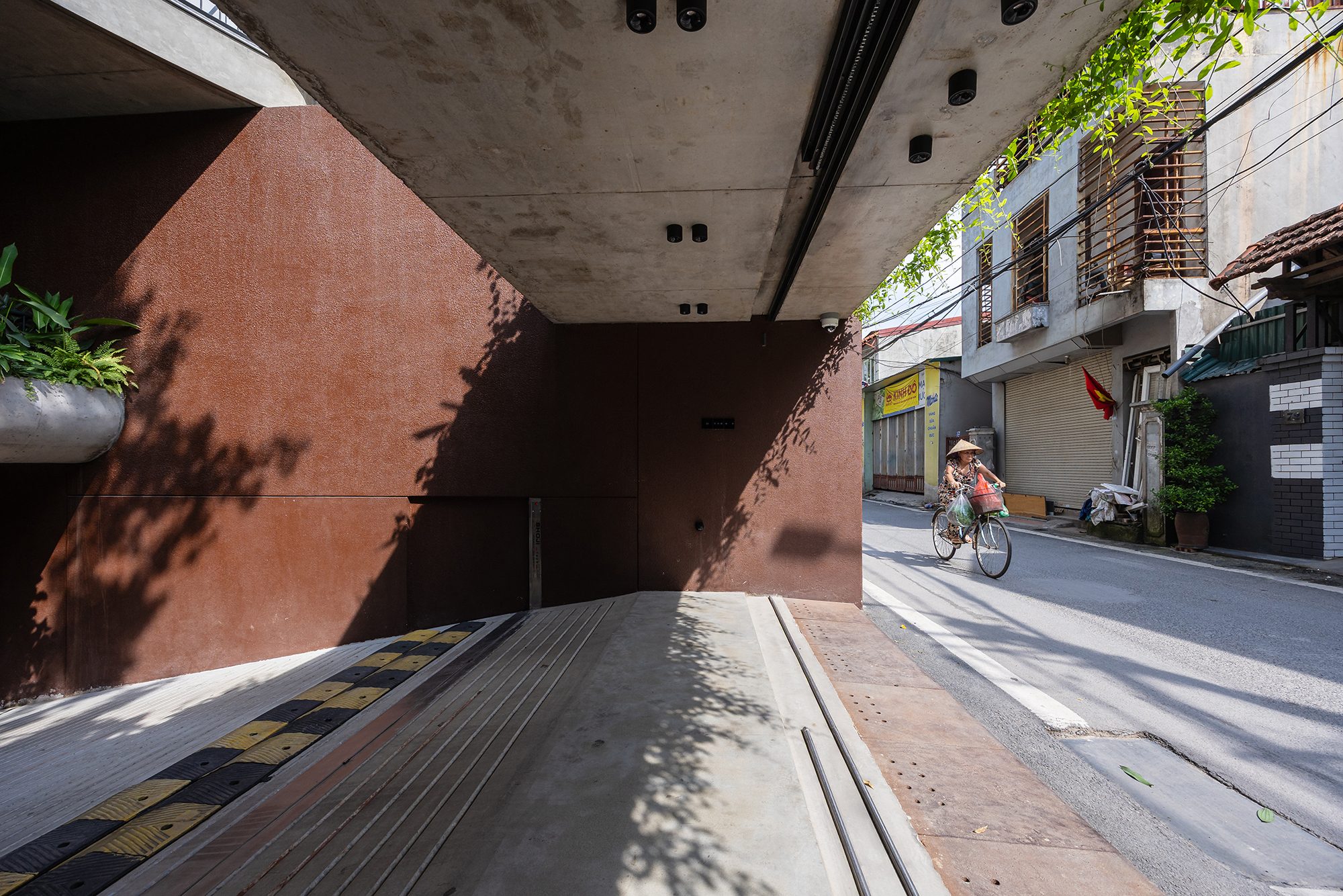 Để tiếp cận tới các chức năng quan trọng kể trên cần đi qua khu vực cổng, tại đó các luồng giao thông được kết nối qua lớp hành lang với sự biến hóa đa dạng. Đây là nơi ánh sáng, tỉ lệ, độ đặc – rỗng được xử lý tinh tế để mỗi bước đi đều mang lại một trải nghiệm mới.