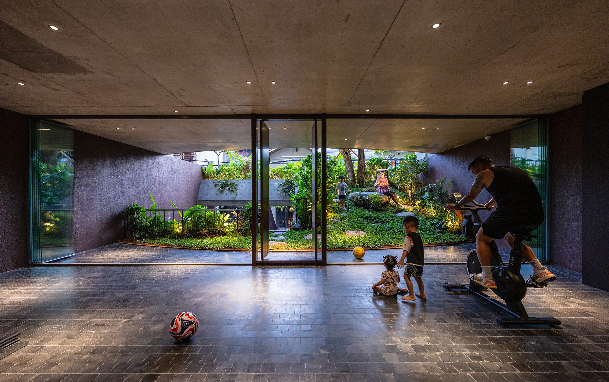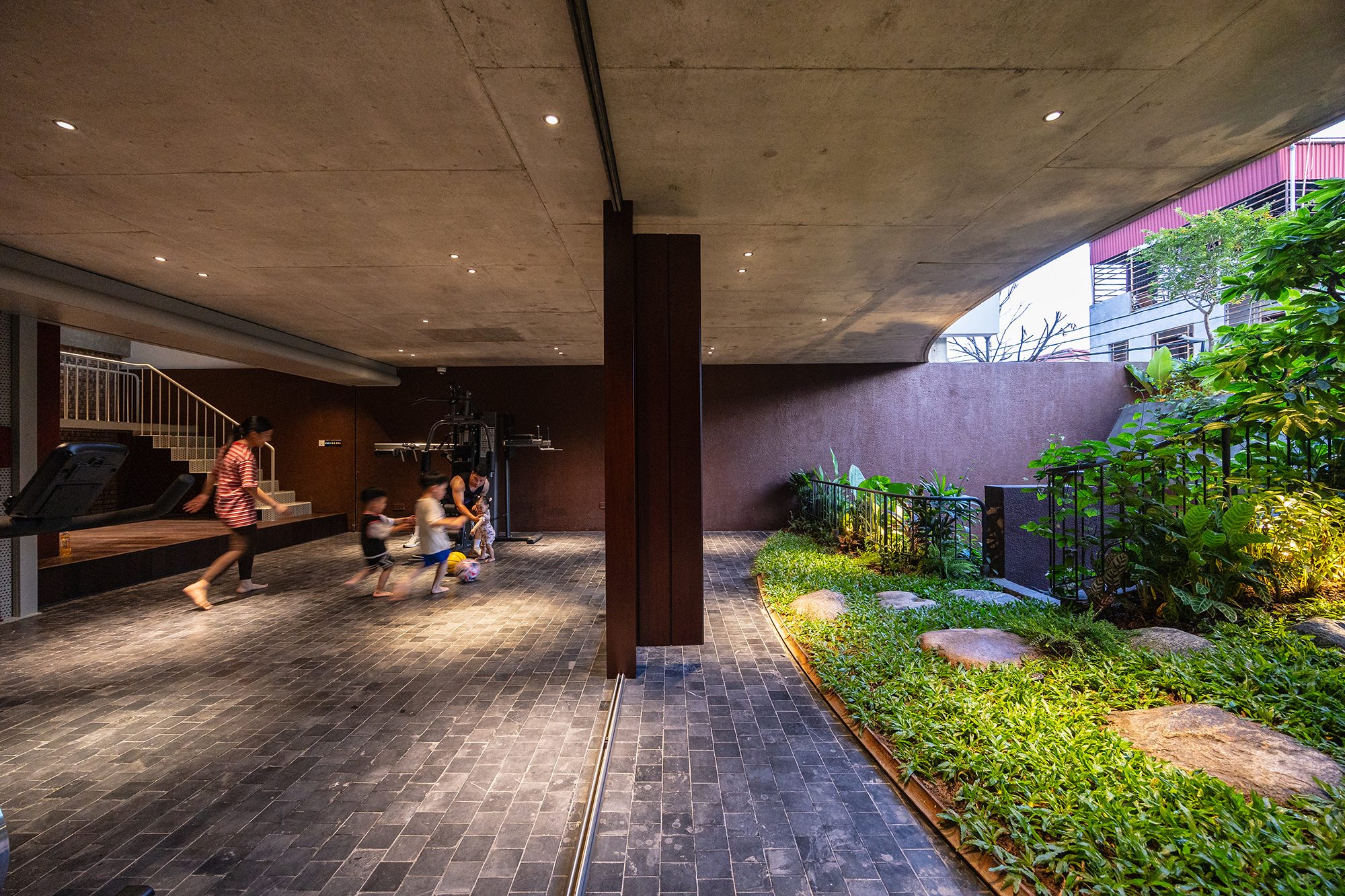 Tầng 1 là không gian mở kết hợp thềm hiên gỗ được tái hiện như một khoảng sân đúng nghĩa gợi nhớ đến nếp sống truyền thống Việt Nam, nơi trẻ nhỏ có thể vui chơi và gần gũi thiên nhiên. Đồng thời cũng là khu vực thể thao chung để những giờ phút tập luyện cũng trở thành thời gian gắn kết giữa người lớn tuổi, bố mẹ và con cái…