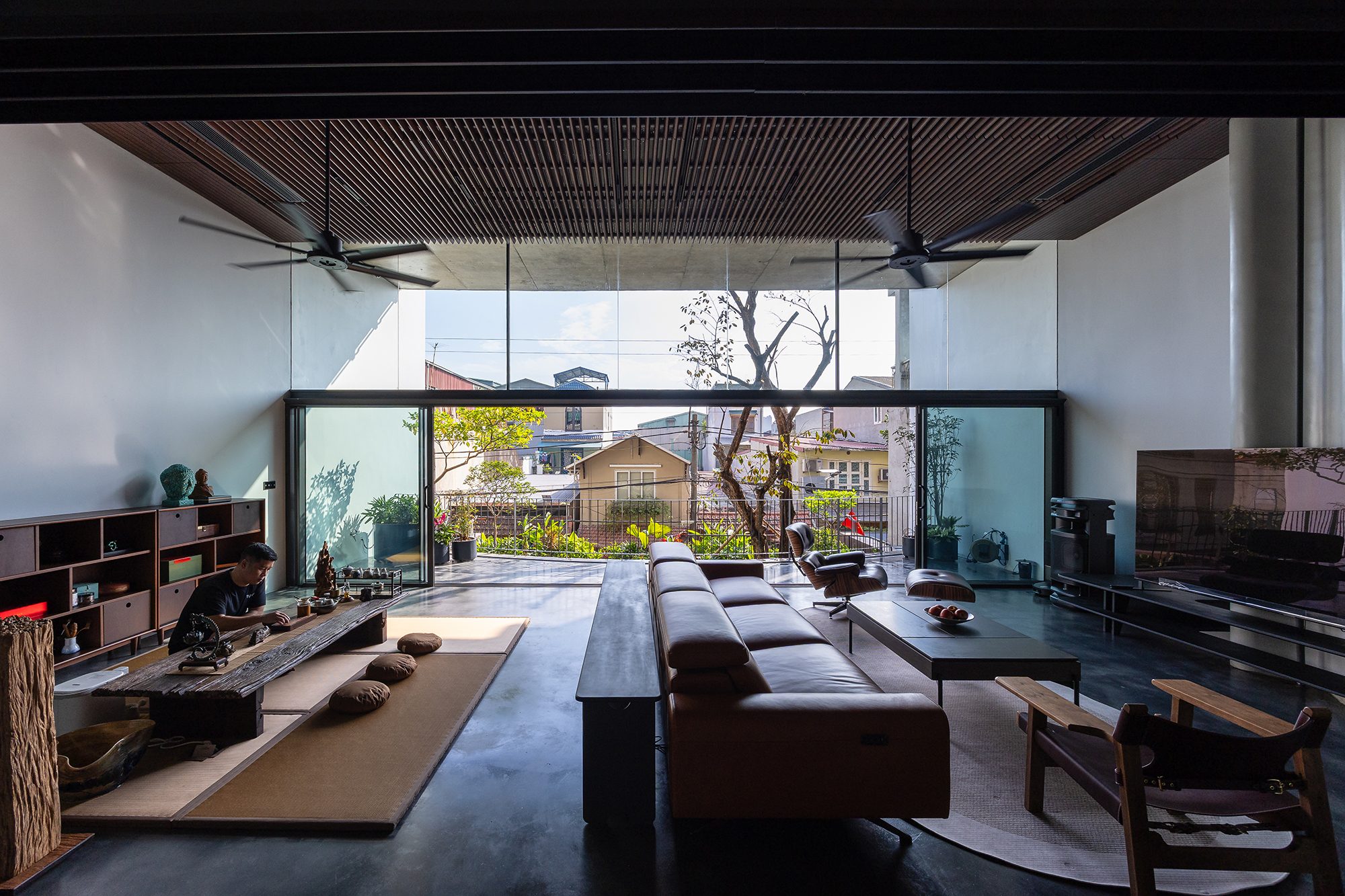Khu vực này có trần cao 4m tạo không gian thoáng đạt, xuyên suốt nhưng vẫn có sự ngăn cách nhẹ nhàng với khu thông tầng và khoảng không phía trước bằng hai vách kính lớn có khả năng đóng mở linh hoạt. Cùng độ lùi thềm hiên hợp lý, ánh sáng và gió được lưu thông liên tục, giữ cho bầu không khí bên trong luôn trong lành, chan hòa cùng môi trường xung quanh.