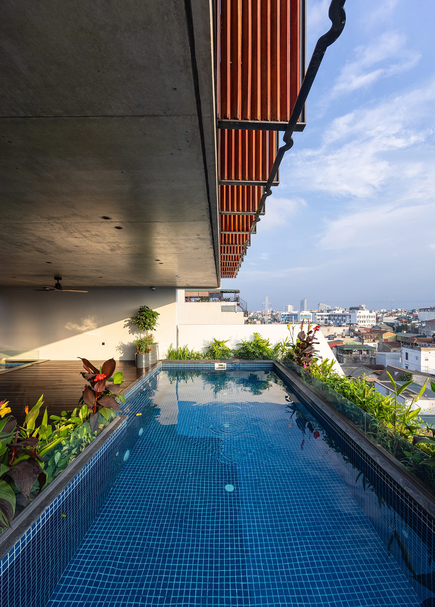 Khu vực tầng 6 mở ra một không gian sinh hoạt chung khác theo yêu cầu của gia chủ gồm bể bơi lớn phía trước được bao bọc bởi dải cây xanh, tạo sự riêng tư mà vẫn hòa hợp cùng thiên nhiên. Phía sau sát thông tầng là bể vầy nhỏ dành cho trẻ, liền mạch cùng khoảng sàn gỗ ngoài trời.