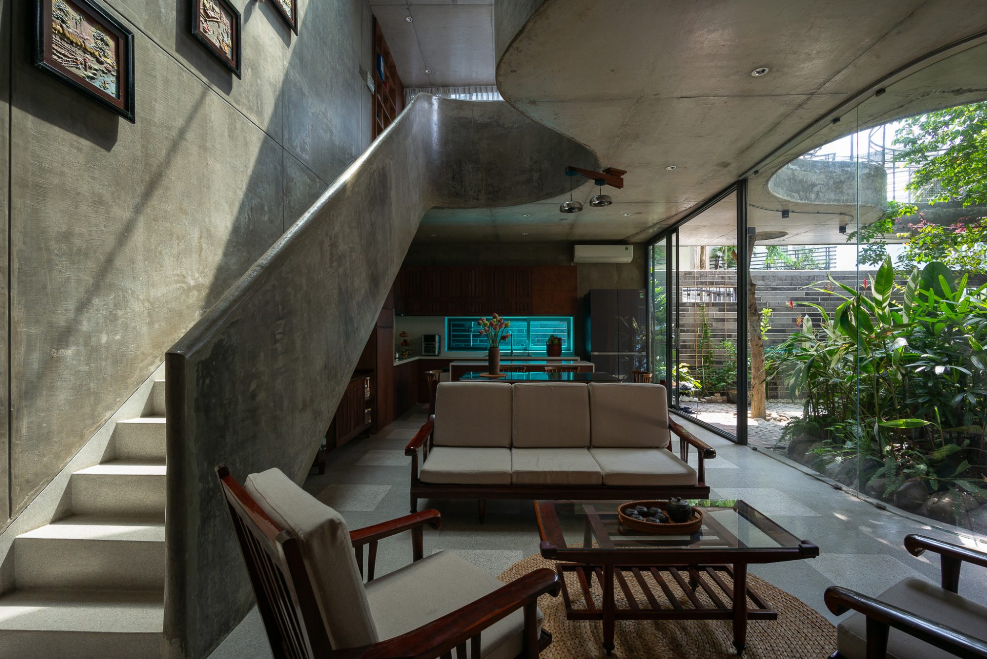 Tối ưu hóa diện tích hạn chế: Khu đất có chiều sâu hạn chế, mỗi sàn khoảng 40m2, nhưng khoảng lùi quy hoạch lại lớn – điều này làm tăng thách thức về diện tích sử dụng. Để tránh cảm giác chật chội và tăng cường thông gió, các bức tường đặc được giảm thiểu. Thay vào đó, các khối gỗ tạo nên không gian riêng tư, trong khi các tấm kính lớn được sử dụng để mở ra tầm nhìn hướng ra khu vườn và đón ánh sáng tự nhiên vào ban ngày. Sự thô ráp của vật liệu (đá núi lửa, đá mài, xi măng đánh bóng, v.v.), kết hợp với tông màu trầm chủ đạo, tạo nên sự mát mẻ, đồng thời tăng thêm vẻ sang trọng cho công trình.