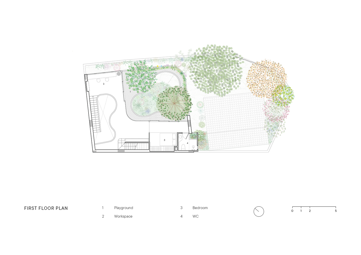 Công trình như một “công viên thu nhỏ”. Một ngôi mộ ở trung tâm được tái hiện như một lõi xanh cho dự án, được bao quanh bởi nhiều lớp cây xanh. Không gian mở này trở thành khu vực ngoài trời chung, nơi người lớn có thể thưởng thức trà, tập thể dục hoặc thư giãn, trong khi trẻ em có không gian chạy nhảy, vui chơi và khám phá.