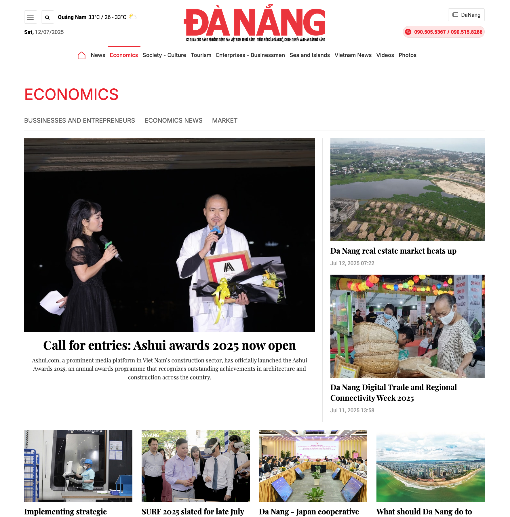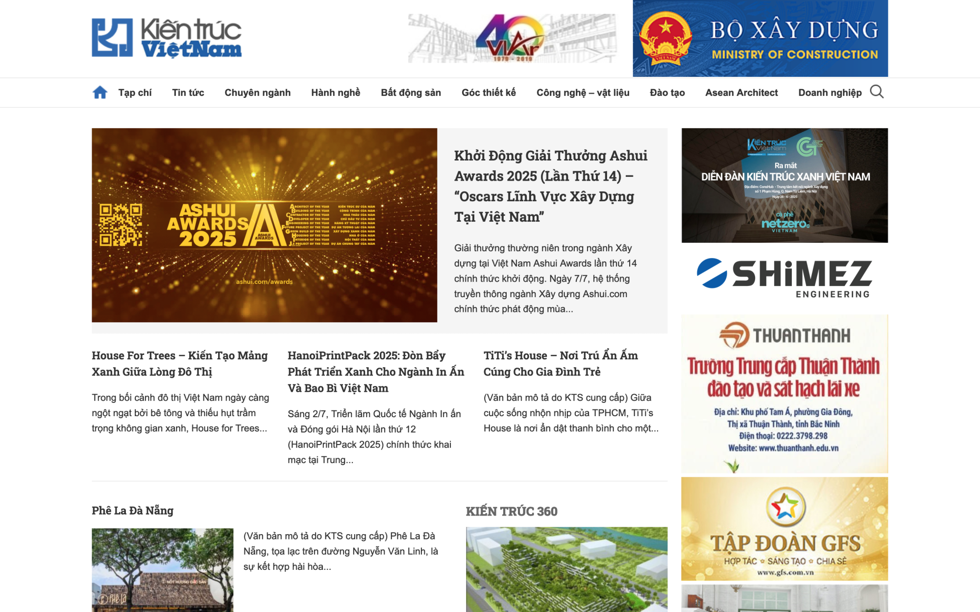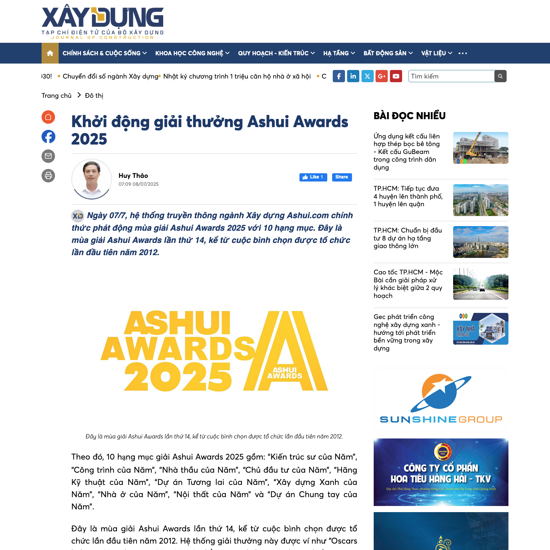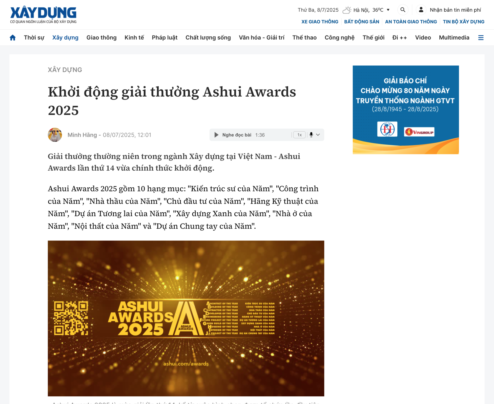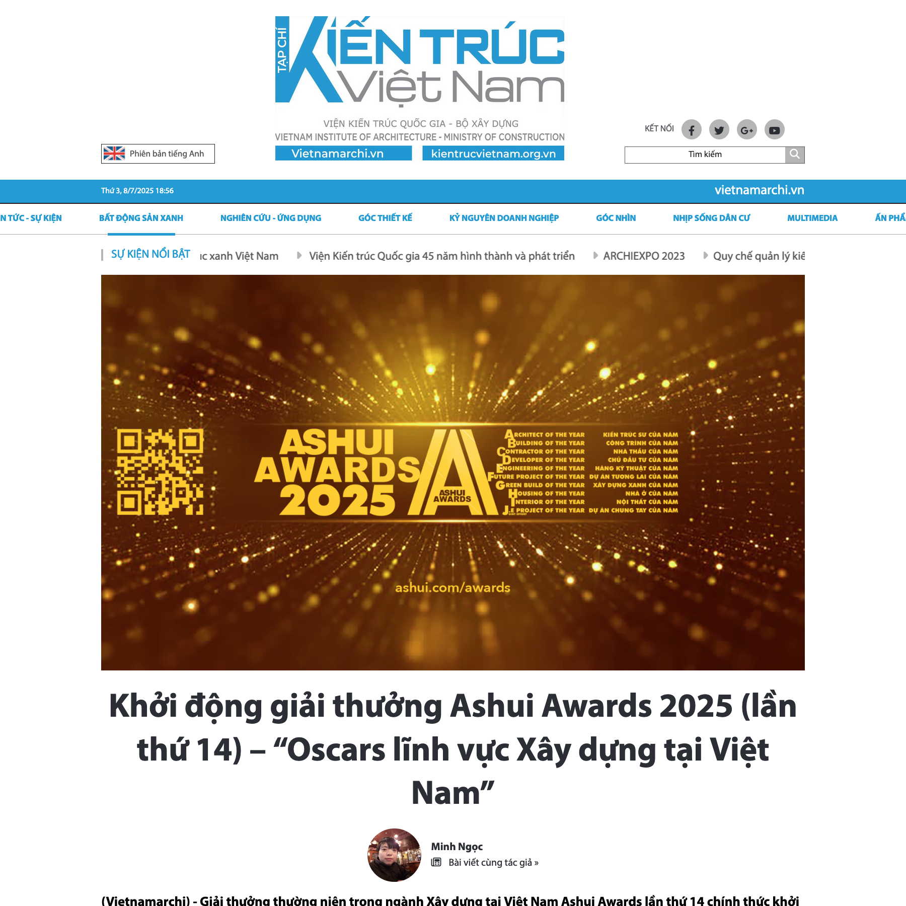 Ashui.com [07/07/2025]: https://ashui.com/khoi-dong-ashui-awards-2025-lan-thu-14/ Tạp chí Xây dựng [08/07/2025]: https://tapchixaydung.vn/khoi-dong-giai-thuong-ashui-awards-2025–20201224000031668.html Báo Xây dựng [08/07/2025]: https://baoxaydung.vn/khoi-dong-giai-thuong-ashui-awards-2025-19225070810412637.htm Tạp chí Kiến trúc & Đời sống [08/07/2025]: https://ktds.vn/khoi-dong-giai-thuong-ashui-awards-2025-(lan-thu-14)-%E2%80%93-%E2%80%9Coscars-linh-vuc-xay-dung-tai-viet-nam%E2%80%9D Tạp chí Kiến trúc Việt Nam [08/07/2025]: https://kientrucvietnam.org.vn/khoi-dong-giai-thuong-ashui-awards-2025-lan-thu-14-oscars-linh-vuc-xay-dung-tai-viet-nam/ Tạp chí điện tử Kiến trúc Việt Nam [08/07/2025]: https://vietnamarchi.vn/khoi-dong-giai-thuong-ashui-awards-2025-lan-thu-14-oscars-linh-vuc-xay-dung-tai-viet-nam–3074.html An ninh Thủ đô [09/07/2025]: https://www.anninhthudo.vn/khoi-dong-giai-thuong-ashui-awards-2025-oscars-cua-linh-vuc-xay-dung-tai-viet-nam-post616998.antd Báo Đà Nẵng [09/07/2025]: https://baodanang.vn/phat-dong-giai-thuong-ashui-awards-2025-3265313.html Tạp chí Kiến trúc [10/07/2025]: https://www.tapchikientruc.com.vn/tin-tuc/ashui-awards-2025-khoi-dong-lan-thu-14.html Báo Đà Nẵng – phiên bản tiếng Anh [12/07/2025]: https://en.baodanang.vn/call-for-entries-ashui-awards-2025-now-open-3265532.html Thời báo Kinh tế Sài Gòn [05/9/2025]: https://thesaigontimes.vn/lan-toa-xu-huong-xanh-trong-kien-truc-xay-dung-tai-ashui-awards-2025/ [tiếp tục cập nhật…]