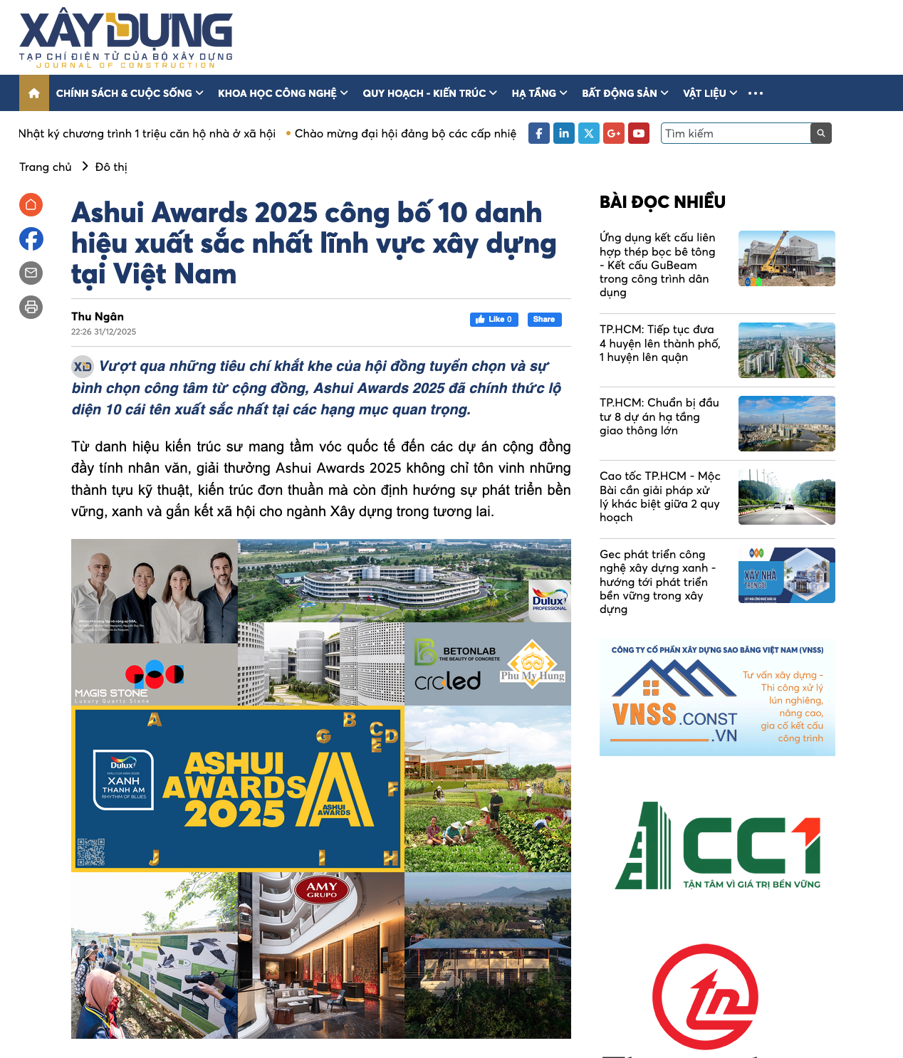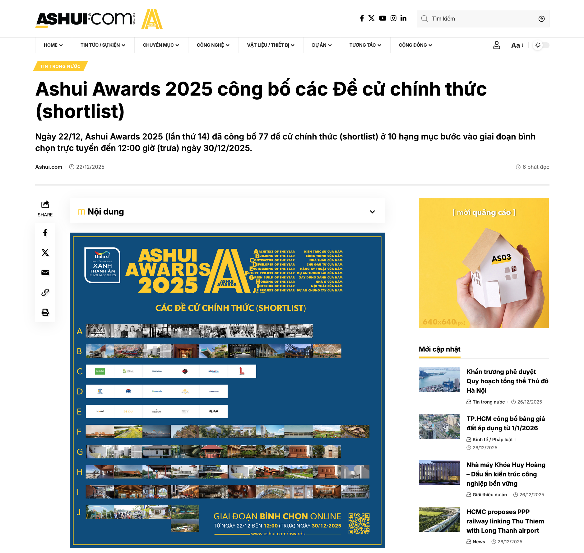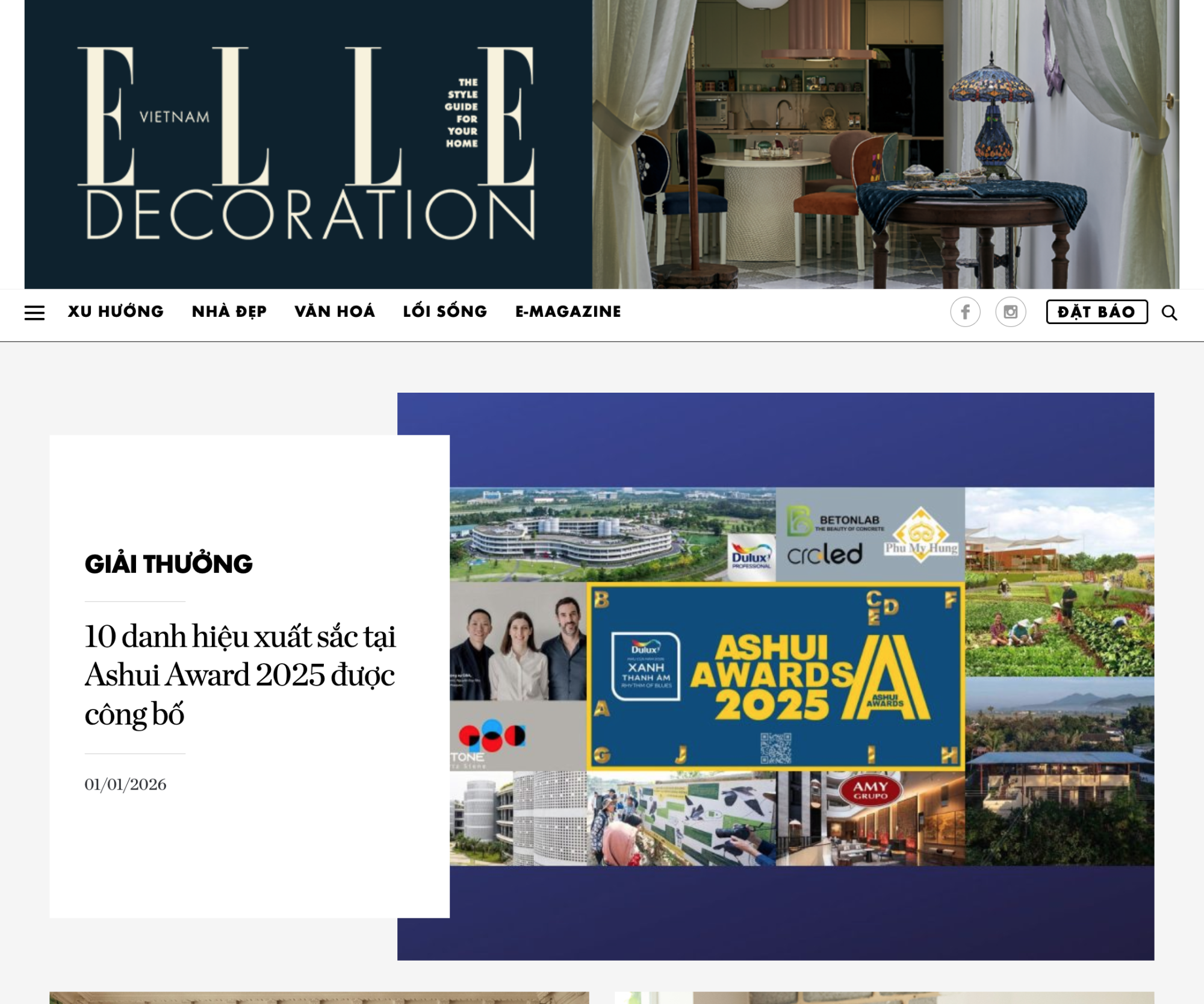 Ashui.com [07/07/2025]: https://ashui.com/khoi-dong-ashui-awards-2025-lan-thu-14/ Tạp chí Xây dựng [08/07/2025]: https://tapchixaydung.vn/khoi-dong-giai-thuong-ashui-awards-2025–20201224000031668.html Báo Xây dựng [08/07/2025]: https://baoxaydung.vn/khoi-dong-giai-thuong-ashui-awards-2025-19225070810412637.htm Tạp chí Kiến trúc & Đời sống [08/07/2025]: https://ktds.vn/khoi-dong-giai-thuong-ashui-awards-2025-(lan-thu-14)-%E2%80%93-%E2%80%9Coscars-linh-vuc-xay-dung-tai-viet-nam%E2%80%9D Tạp chí Kiến trúc Việt Nam [08/07/2025]: https://kientrucvietnam.org.vn/khoi-dong-giai-thuong-ashui-awards-2025-lan-thu-14-oscars-linh-vuc-xay-dung-tai-viet-nam/ Tạp chí điện tử Kiến trúc Việt Nam [08/07/2025]: https://vietnamarchi.vn/khoi-dong-giai-thuong-ashui-awards-2025-lan-thu-14-oscars-linh-vuc-xay-dung-tai-viet-nam–3074.html An ninh Thủ đô [09/07/2025]: https://www.anninhthudo.vn/khoi-dong-giai-thuong-ashui-awards-2025-oscars-cua-linh-vuc-xay-dung-tai-viet-nam-post616998.antd Báo Đà Nẵng [09/07/2025]: https://baodanang.vn/phat-dong-giai-thuong-ashui-awards-2025-3265313.html Tạp chí Kiến trúc [10/07/2025]: https://www.tapchikientruc.com.vn/tin-tuc/ashui-awards-2025-khoi-dong-lan-thu-14.html Báo Đà Nẵng – phiên bản tiếng Anh [12/07/2025]: https://en.baodanang.vn/call-for-entries-ashui-awards-2025-now-open-3265532.html Thời báo Kinh tế Sài Gòn [05/9/2025]: https://thesaigontimes.vn/lan-toa-xu-huong-xanh-trong-kien-truc-xay-dung-tai-ashui-awards-2025/ Ashui.com [22/12/2025]: https://ashui.com/ashui-awards-2025-cong-bo-cac-de-cu-chinh-thuc-shortlist/ Ashui.com [31/12/2025]: https://ashui.com/cong-bo-ket-qua-ashui-awards-2025-lan-thu-14/ Báo Xây dựng [31/12/2025]: https://baoxaydung.vn/g8a-architects-thang-lon-tai-ashui-awards-2025-192251231160130262.htm Tạp chí Xây dựng [31/12/2025]: https://tapchixaydung.vn/ashui-awards-2025-cong-bo-10-danh-hieu-xuat-sac-nhat-linh-vuc-xay-dung-tai-viet-nam-20201224000035653.html ELLE Decoration Vietnam [01/01/2026]: https://www.elledecoration.vn/trends/edida/cong-bo-danh-hieu-xuat-sac-ashui-awards-2025 Báo Xây dựng [06/01/2026]: https://baoxaydung.vn/du-an-lang-vo-cuc-xanh-nhu-the-nao-192260106143404459.htm Reatimes.VN [08/01/2026]: https://reatimes.vn/viet-nam-co-lang-vo-cuc-so-huu-kien-truc-thap-tang-doc-dao-toa-lac-tai-thung-lung-silicon-mien-bac-202260107163312354.htm [tiếp tục cập nhật…]