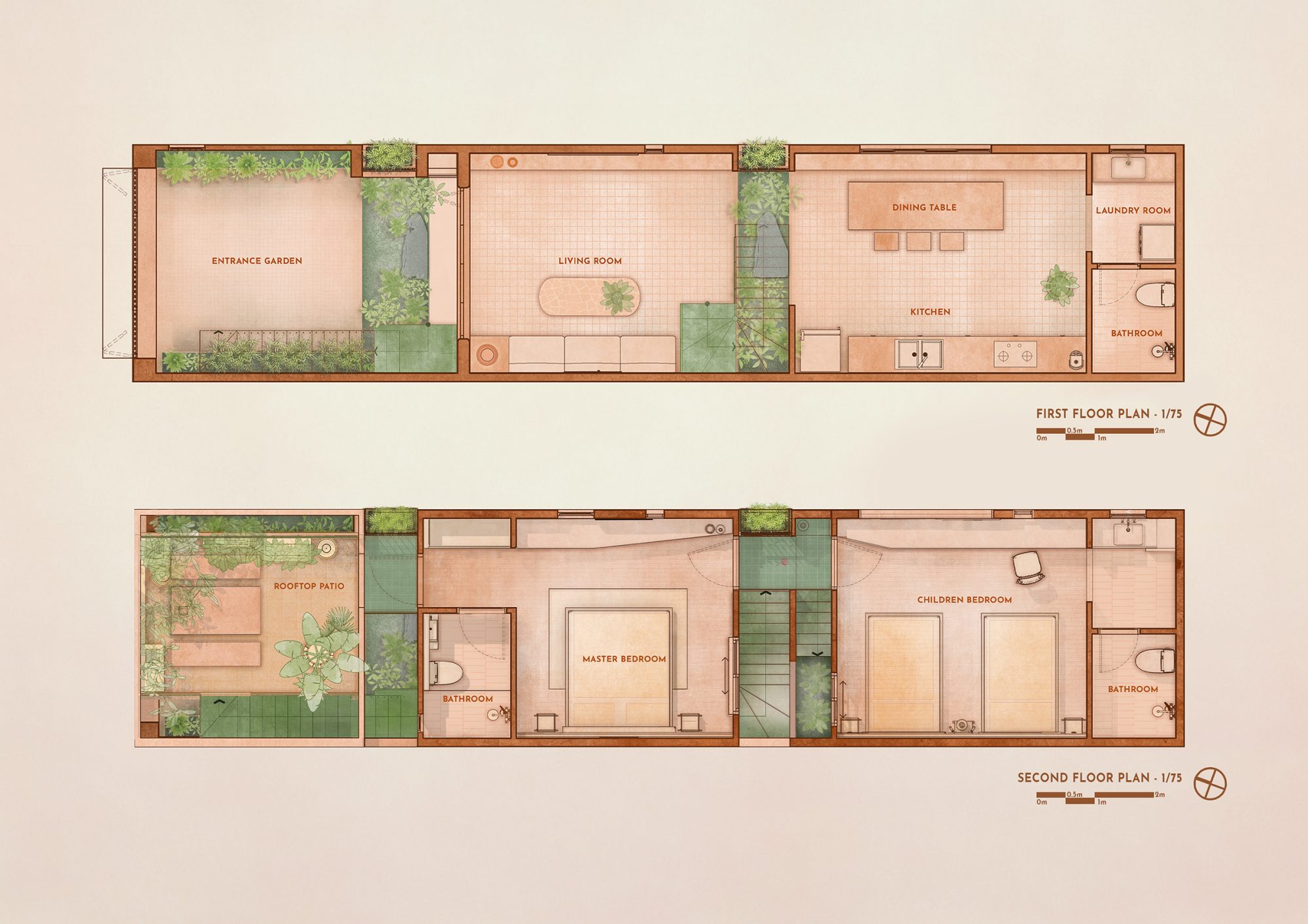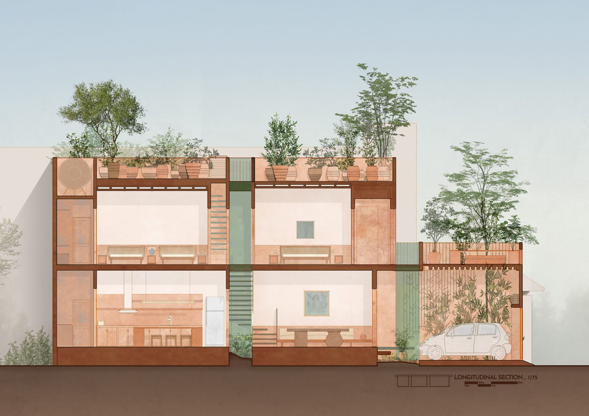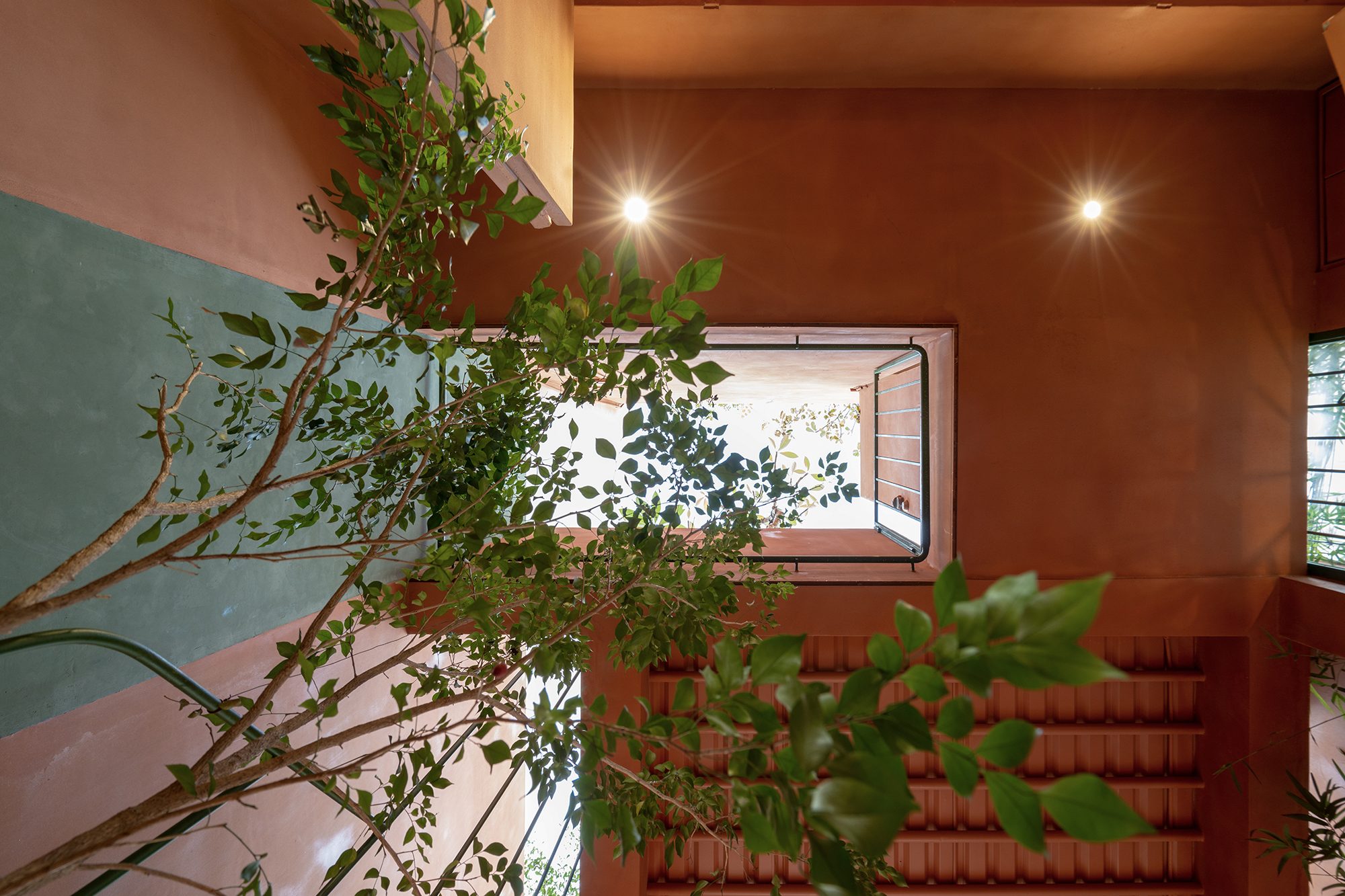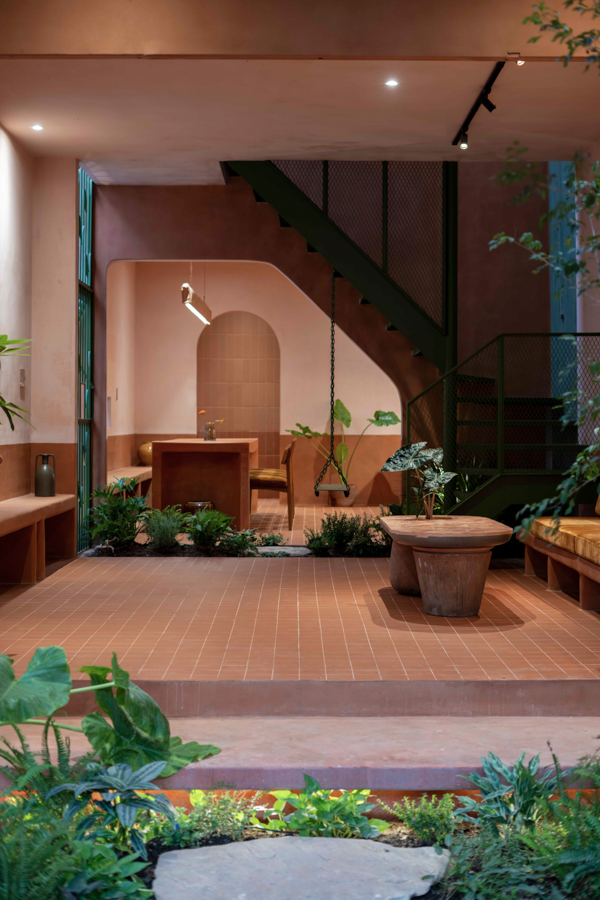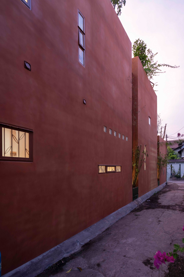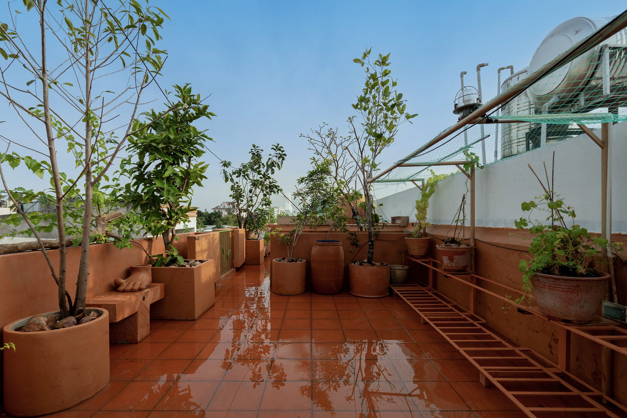 Ba khối nhà xếp liên tục như ba chậu đất nung, ôm lấy nhau trong một tổng thể hài hòa, vừa vững chãi vừa thấm đẫm hơi thở thổ nhưỡng. Khối ‘chậu đất’ đầu tiên được thiết kế làm sân hiên thoáng đãng, giúp tạo lớp đệm trước khi bước vào không gian sống bên trong. Chúng tôi cơi nới thêm một phần mái làm sân thượng để gia chủ có thể cùng bạn bè quây quần, tận hưởng những bữa ăn dưới bầu trời rộng mở – một lối sinh hoạt dân dã của người dân vùng này. Các phòng sử dụng chính như phòng khách, phòng ngủ, bếp…được đẩy lùi vào khối ‘chậu đất’ thứ 2 và khối ‘chậu đất’ thứ 3. Cây xanh được đưa vào tự nhiên như thể nhà được “trồng lên từ đất”.