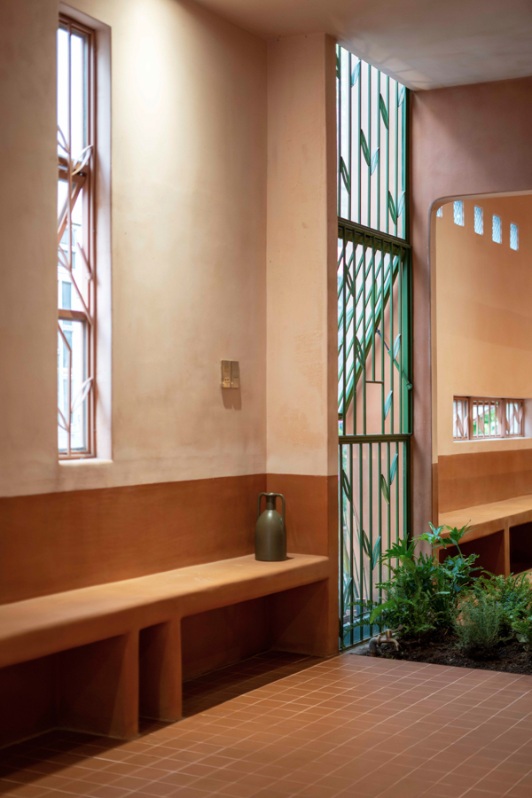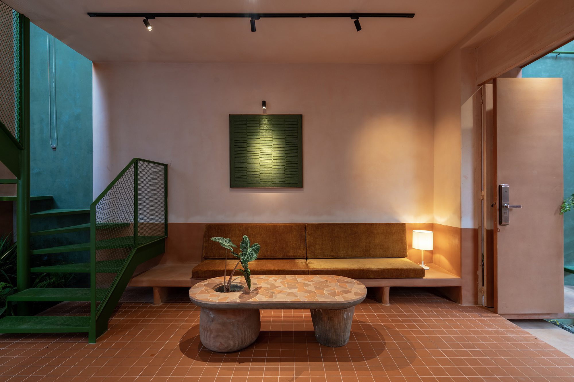 Để diễn đạt lại cảm xúc vật liệu đất nung địa phương, chúng tôi chọn các vật liệu như gạch gốm, gỗ tái chế, sắt thô, đất sét trộn xi măng… Tất cả đều có bề mặt mộc, mang tông màu của đất, của lửa, của nắng cháy và cảnh quan miền quê. Ban đầu, chúng tôi định dùng đất sét thuần làm lớp hoàn thiện bề mặt tường. Nhưng khi gặp khí hậu khắc nghiệt của miền Nam – mưa dầm, nắng gắt – lớp trát này rất dễ nứt và thấm. Thế là chúng tôi thử trộn thêm xi măng, phụ gia và tinh màu vào để tăng độ bền cho đất sét, rồi phủ một lớp sơn bảo vệ trong suốt bên ngoài để chống thấm – giống như bước cuối cùng phủ men lên sản phẩm của nghệ nhân gốm. Vậy là tạo ra được một vật liệu mới: có chất cảm giống đất nung, nhưng bền hơn, phù hợp khí hậu địa phương.