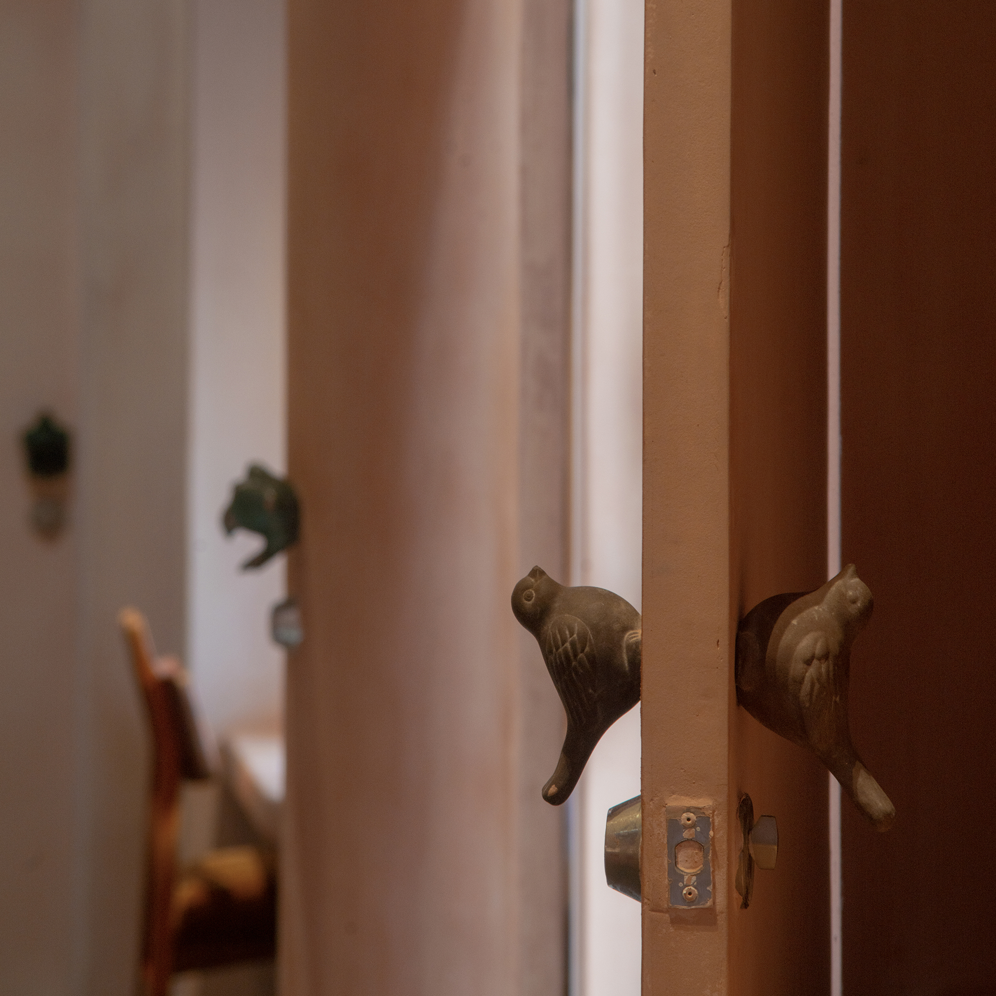Nhà Chậu Đất là sự hòa quyện giữa quá khứ và hiện tại, giữa bàn tay con người và chất cảm của thiên nhiên. Những tay nắm cửa gốm hình thú – cá, rùa, ếch, chim – không chỉ là chi tiết trang trí mà còn là câu chuyện của sông nước, của ruộng vườn. Những ô cửa sổ song sắt mô phỏng hình dáng bụi tre, vừa che chắn vừa mở lối cho ánh sáng, mang bóng dáng của những hàng tre quê nhà vào không gian sống. Chủ nhà đã tự tay làm gần như toàn bộ đồ nội thất từ gạch vỡ, đất nung, sắt thô, gốm hỏng. Những chi tiết như bàn trà xếp gạch, đèn trần bàn ăn, chân bàn được tái sử dụng từ ống cống, hay tranh kết cấu nổi treo tường… như một cuộc đối thoại với vật liệu, với không gian, phản ánh tinh thần sống chậm, trân quý từng khoảnh khắc, pha vào đó chất ‘chơi’ của gia chủ.