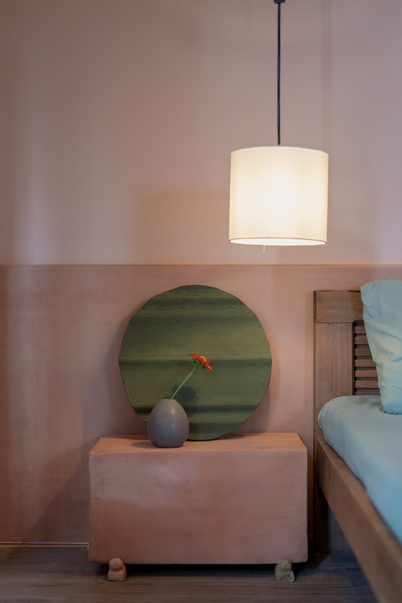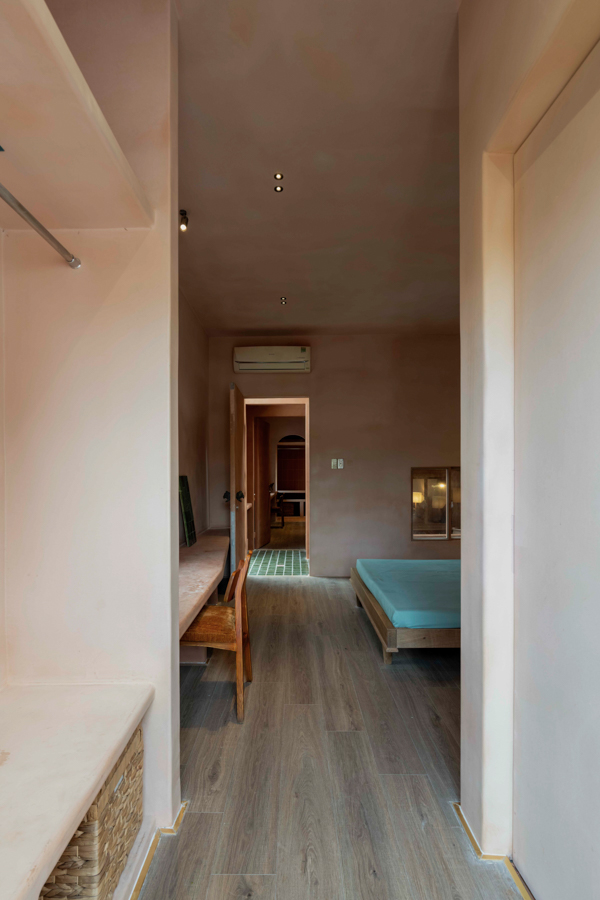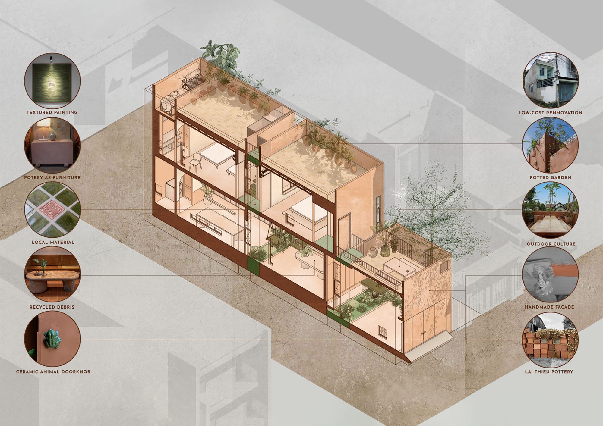 Cách chúng tôi tiếp cận khi thiết kế công trình này như một người thợ thủ công đang nặn một chậu đất nung. Chuỗi hoạt động đó bao gồm những cái chạm tay, sự hiểu về vật liệu, sự từ tốn, sự trao đổi với bối cảnh địa phương và lịch sự làng nghề. Cấu trúc căn nhà hiện trạng được tôn trọng phần khung có sẵn để tối ưu chi phí. Vẫn là một chuỗi liền mạch gắn kết và mở các không gian sinh hoạt với nhau, nhưng chúng được tổ chức và như được chứa trọn trong 3 chiếc chậu đất lớn. Ở giữa chúng là những đoạn ngắt để ánh sáng lọt vào, gió có thể đi qua và màu xanh của cây được len lỏi. Cạnh của 3 khối chậu được nắn lại, bo tròn mặt tường cong. Trong khi đó, không gian bên trong được ngăn chia mềm, thoáng đãng thay vì những vách phòng cứng ngắc.