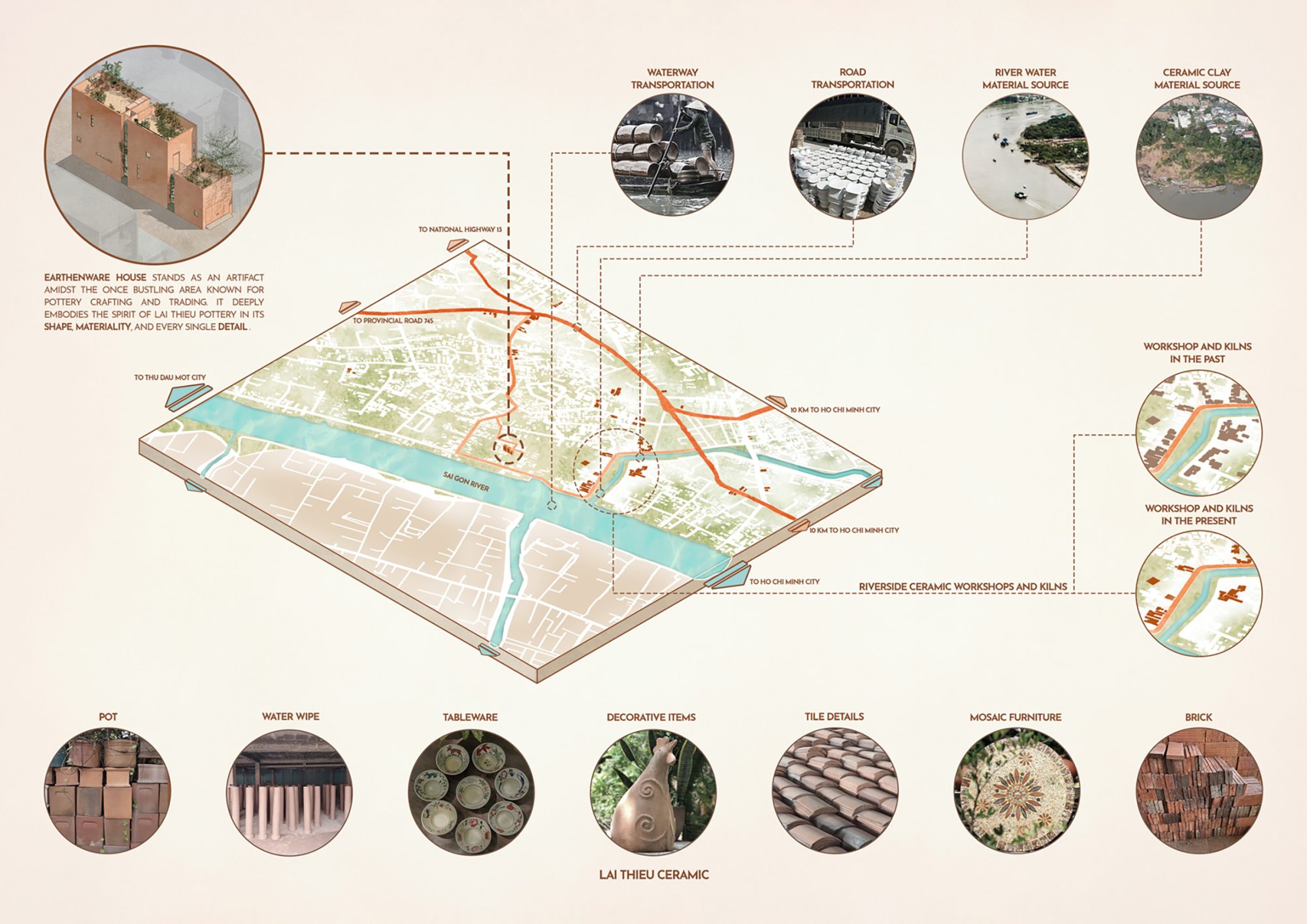 Khu đất nằm trên một con hẻm nhỏ ở miệt Lái Thiêu, vùng đất nổi tiếng với truyền thống Gốm Lái Thiêu – một tạo tác hỏa biến men mộc, khởi nguyên từ thế kỷ 18, là chứng nhân cho dòng chảy văn hóa miền Nam. Những món đồ gốm từng theo ghe thương hồ, len lỏi trong đời sống Nam Bộ, giờ đây trở thành linh hồn của công trình Nhà Chậu Đất. Trong ngôi nhà nhỏ này, chúng tôi đưa chất liệu gốm vào trong cả kiến trúc và nội thất, để mỗi cái nắm tay, mỗi bước chân chạm đất đều gợi về một vùng đất hào sảng, mộc mạc.