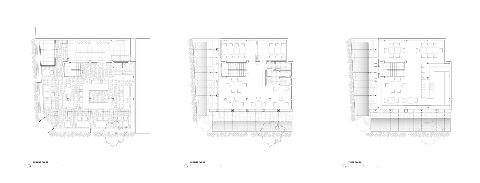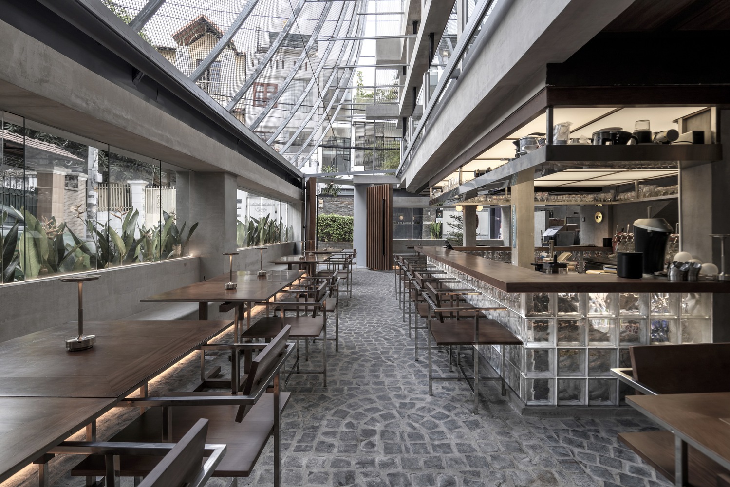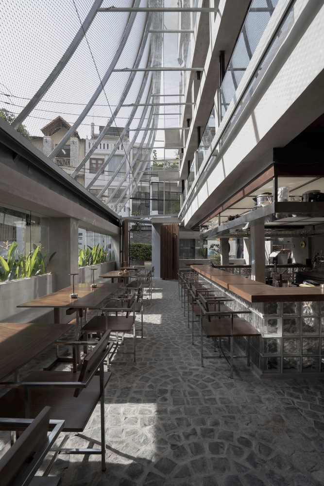 Khi kết hợp với nhau, tấm màn che và nội thất tạo thành một chiến lược hai lớp giúp định hình lại mối quan hệ giữa đường phố và không gian, làm mờ ranh giới giữa bên trong và bên ngoài, giữa sự bao bọc và sự phơi bày.