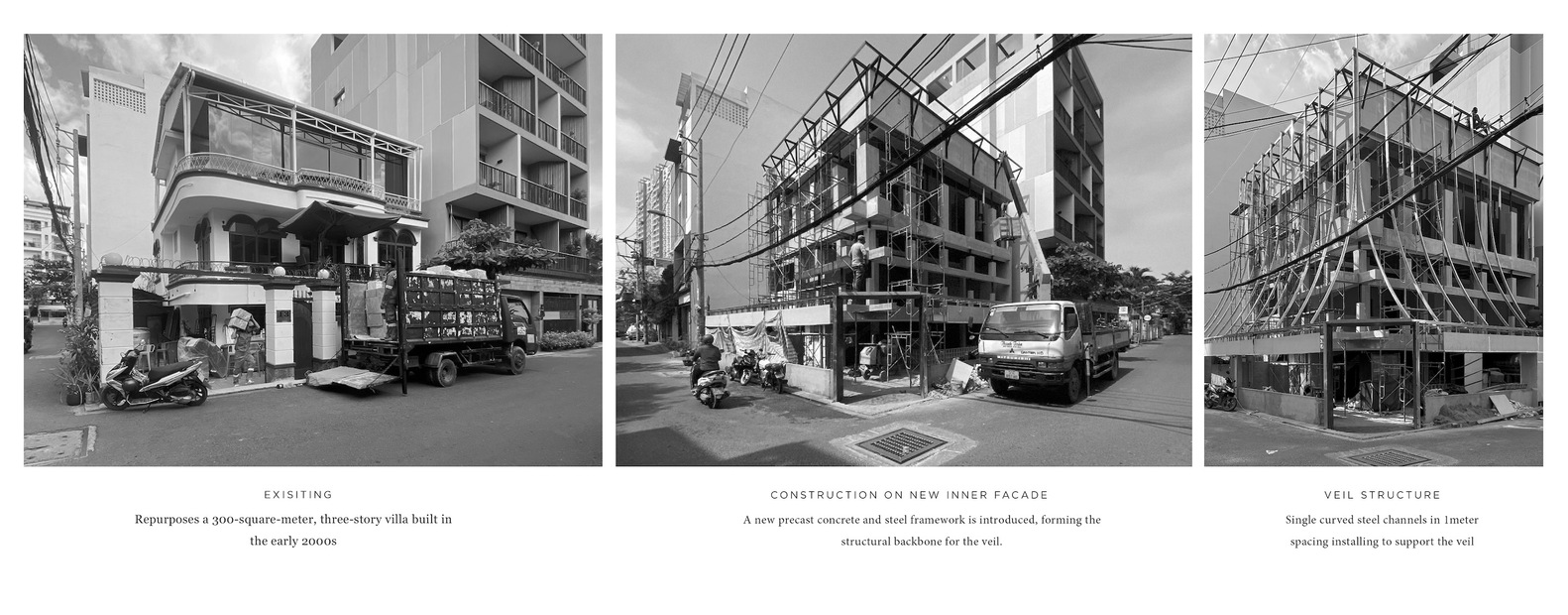 Ts VEIL là dự án cải tạo một biệt thự ba tầng rộng 300 mét vuông tại trung tâm Quận 2 (cũ), TPHCM – một khu vực đang phát triển nhanh chóng với sự kết hợp dày đặc của nhà ở, cửa hàng nhỏ và quán ăn địa phương. Thay vì lựa chọn phá dỡ và xây dựng mới, dự án cẩn thận bảo tồn khung kết cấu cốt lõi của tòa nhà, bao gồm khung bê tông, cầu thang, sàn và mái, đồng thời tái hiện cả sự hiện diện về mặt kiến trúc và hiệu suất không gian thông qua một hệ thống lớp vỏ mới – bên ngoài và bên trong.