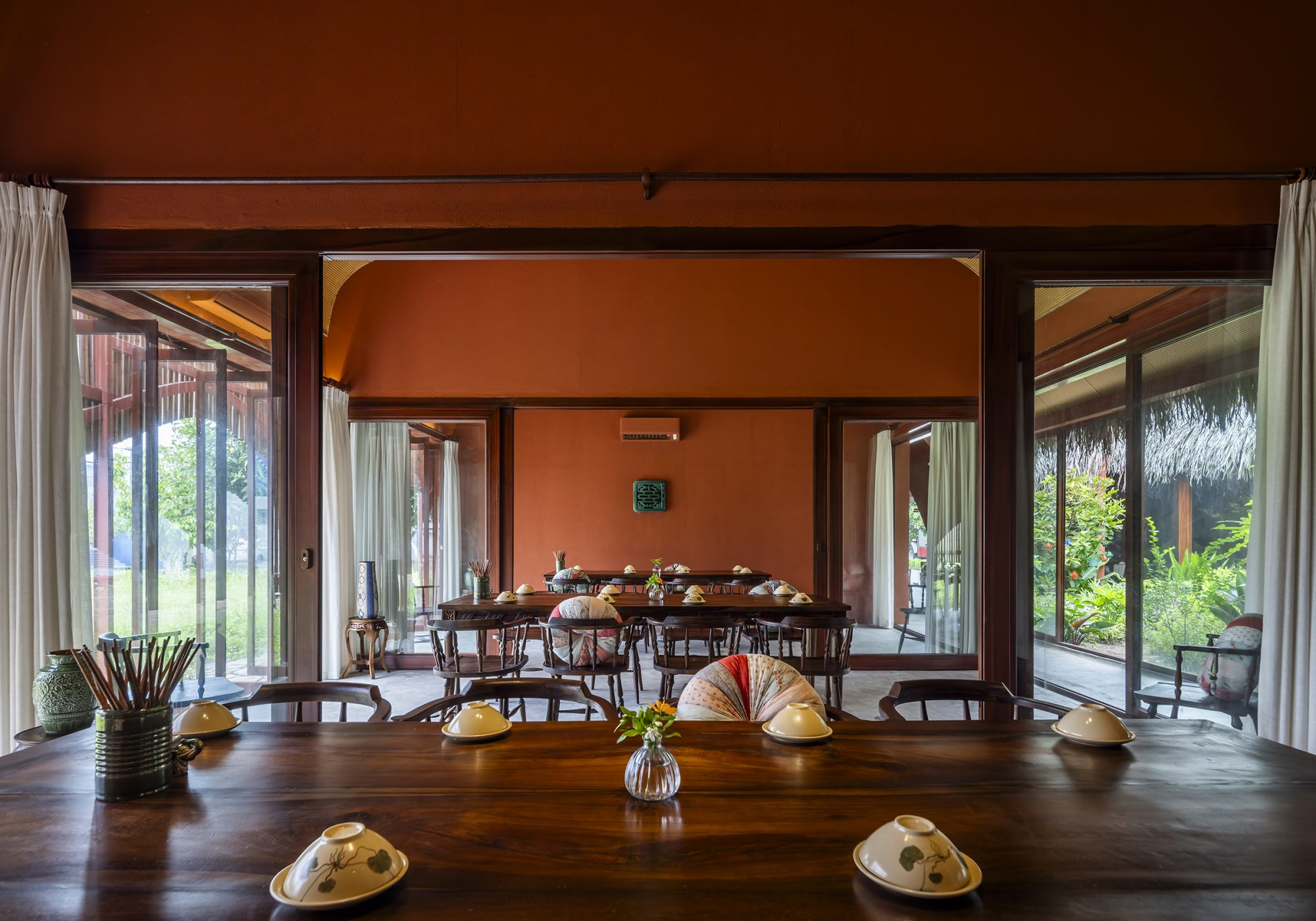 Không gian ẩm thực bên ngoài sử dụng “hàng ba” (không gian quen thuộc trong kiến trúc nhà Nam Bộ) giúp cách âm và cách nhiệt cho không gian chính bên trong, tiếp nối là hào nước và khoảng trống làm lớp không khí đệm bao quanh khối nhà chính. Khu vực ẩm thực bên trong với cách bố trí chỗ ngồi hướng tâm, đảm bảo mọi góc trong nhà hàng đều tiếp cận được với khu vườn.