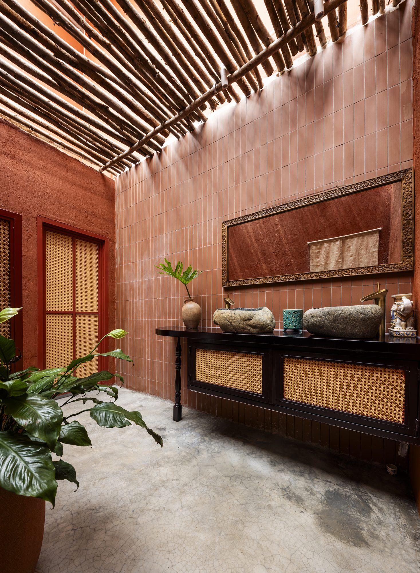 Phương án thi công kết hợp kỹ thuật công nghiệp mới và biện pháp thủ công lâu đời của thợ địa phương. Kết cấu chính được sử dụng là khung thép tiền chế, giải pháp thi công của các nhà xưởng công nghiệp lân cận. Tường xây gạch và hoàn thiện sơn bằng chổi gai. Sàn bê tông hoàn thiện xi măng cán nền và đánh bóng bằng chổi, tạo nên bề mặt tự nhiên. Trần khung thép định hình và hoàn thiện bằng tấm mây đan, được ghép nối thủ công lại với nhau. Các khu vực quầy bar và toilet sử dụng gạch nung cổ làm điểm nhấn.