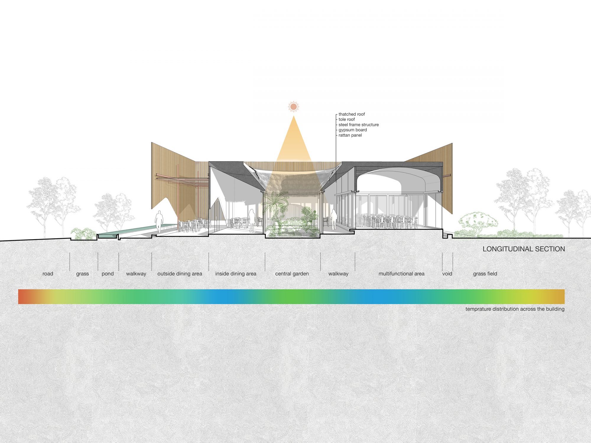 Hồ nước vô cực kéo dài hết chiều ngang mặt tiền có vai trò điều tiết, giảm bức xạ nhiệt từ mặt đường vào công trình. Bốn mặt đứng công trình đều làm cấu trúc hai lớp. Lớp ngoài cùng là hệ bao che bằng trúc, lớp đệm (khoảng trống, sân, hàng hiên,…) và tường bao.