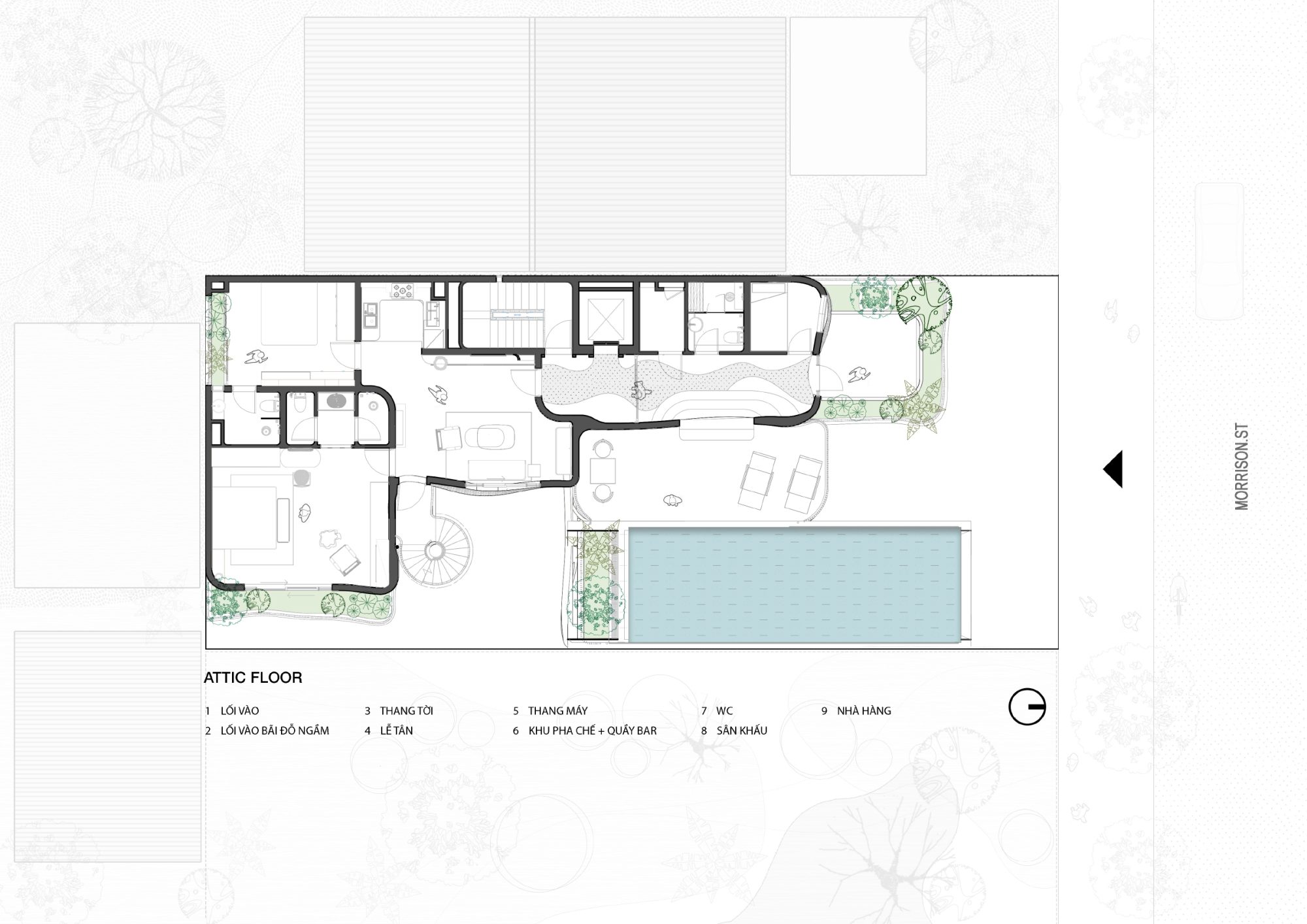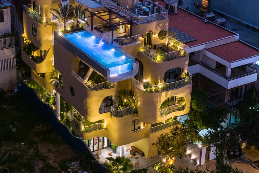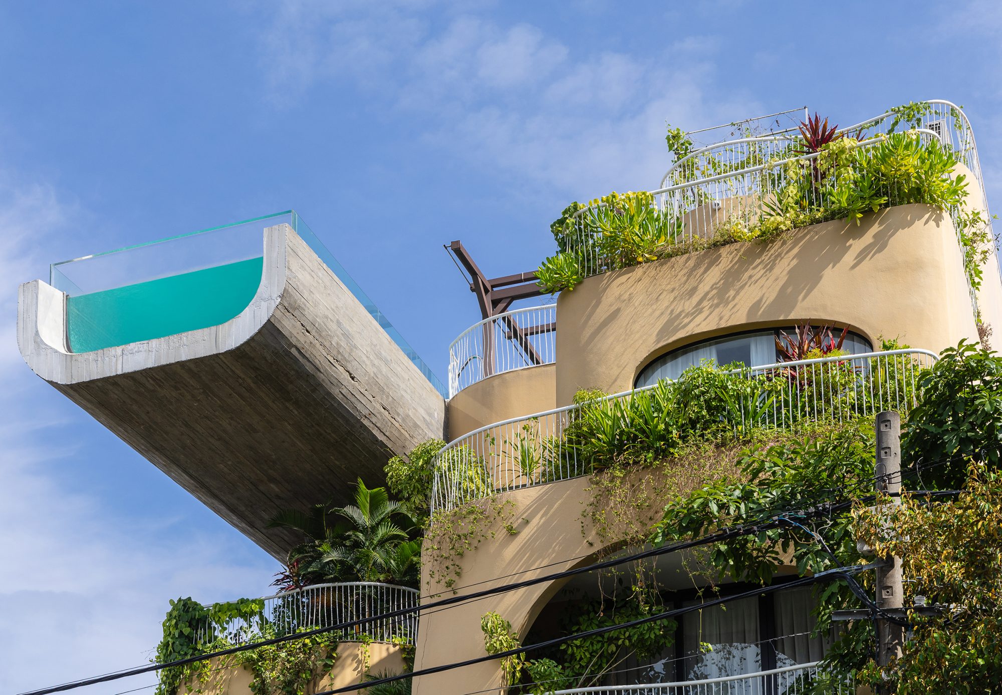 Nổi bật hơn cả là hồ bơi kính trên tầng thượng, một chi tiết táo bạo và đầy ngẫu hứng. Với khẩu độ kết cấu vươn ra 6 mét, hồ bơi lơ lửng như một con thuyền trôi giữa trời, mang lại cảm giác “nghẹt thở” đầy phấn khích cho người sử dụng. Mặt kính thành trước hồ bơi sử dụng tấm acrylic đặc biệt, mang đến tầm nhìn bao quát và một trải nghiệm bơi lội độc đáo.