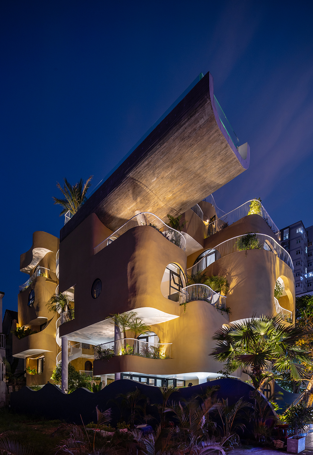 Bản thân công trình là một cuộc đối thoại đầy táo bạo với cảnh quan xung quanh. Trong bối cảnh phố biển tràn ngập những khối kính và màu sắc trầm mặc, Saha Casa Boutique lại chọn một tông màu đá vàng mạnh mẽ, tương phản đầy ấn tượng với môi trường xung quanh. Sức hút của công trình đến từ đường nét kiến trúc phát triển dựa trên cấu trúc từ thiên nhiên. Lấy ý tưởng từ hình ảnh các hang động, công trình mang trong mình những không gian đóng mở linh hoạt, với các vòm cửa đi, cửa sổ mềm mại. Sự tương phản giữa khối và rỗng, giữa ánh sáng và bóng tối này tạo ra một hành trình khám phá liên tục, mở ra các hành lang, lối đi, khu vườn và không gian phòng với nhiều sắc thái cảm xúc khác nhau.