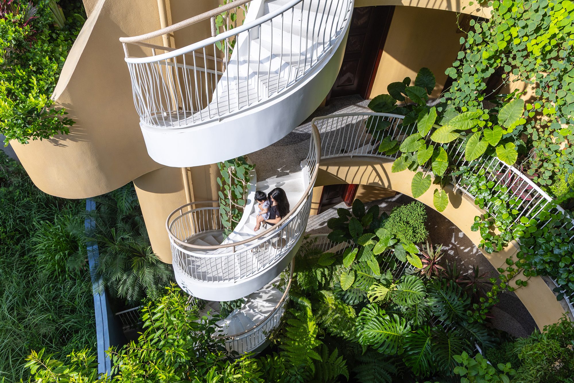 Điểm nhấn đầu tiên của công trình là không gian thông tầng tại tầng 1, nơi một hồ cá thơ mộng kết hợp với cảnh quan cây xanh, tạo nên một “giếng trời” đầy sức sống. Đây là trái tim của Saha Casa, với các hành lang dẫn về phòng nghỉ đều quay quanh khoảng không này. Các thảm cây xanh được bố trí khéo léo từ tầng này sang tầng khác, kết nối nhau tạo thành một khu vườn đứng, hòa quyện với những đường cong mềm mại và tông màu trầm ấm của công trình.