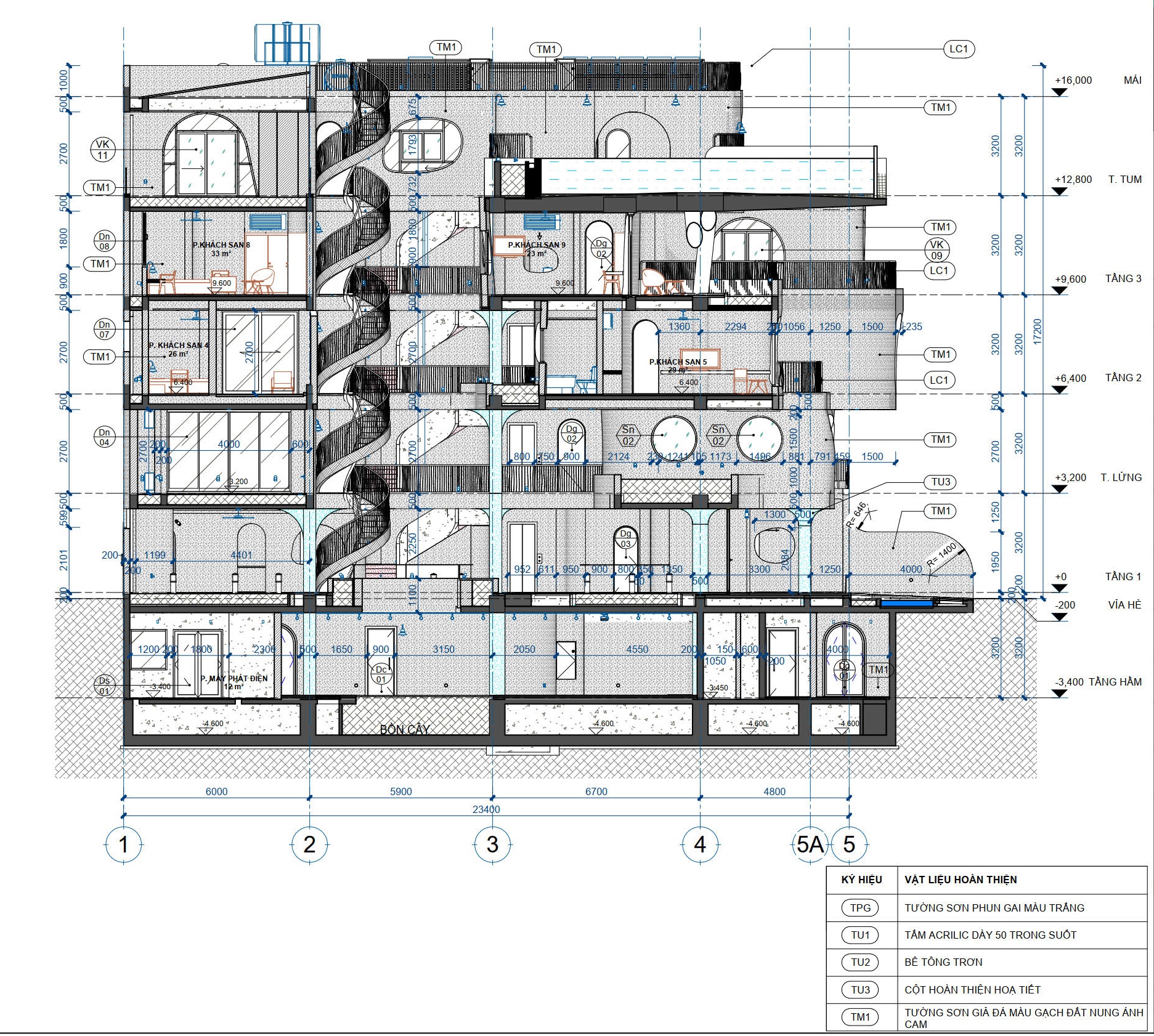 Sự tương phản ấy còn được thể hiện qua chính vật liệu của công trình. Thay vì sử dụng các vật liệu hiện đại, đội ngũ thiết kế đã tư vấn sử dụng đá mài granite tô – một vật liệu truyền thống, thân thiện với môi trường, mang lại cảm giác mộc mạc và gần gũi. Bề mặt sần thô của vật liệu này không chỉ tạo ra một lớp kết cấu có chiều sâu mà còn đóng vai trò như một “lớp áo” tinh tế, điều tiết ánh sáng và gió, tạo nên những mảng bóng đổ thay đổi liên tục theo từng khoảnh khắc trong ngày, khiến cho công trình luôn sống động.