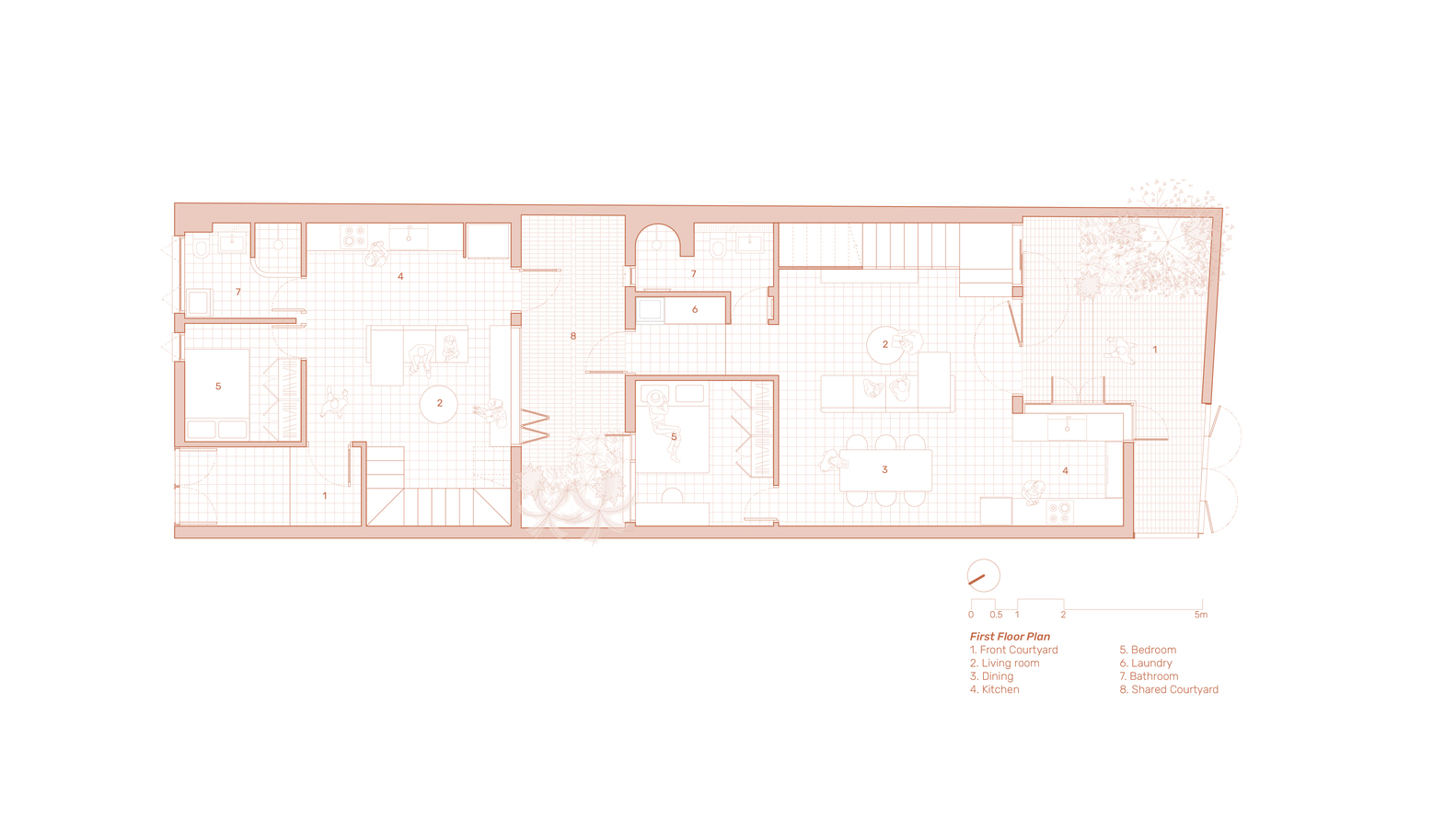 Terracotta Breath của live out studio là một ngôi nhà đa thế hệ thanh lịch nhưng khiêm tốn, nằm lặng lẽ trong một con hẻm nhỏ ở Đà Nẵng, Việt Nam. Được thiết kế cho hai hộ gia đình – nhà của bố mẹ ở phía trước và nhà của con gái ở phía sau – dự án nằm trên một khu đất đô thị khiêm tốn 7×22 mét. Giữa hai ngôi nhà, một khoảng sân nhỏ trồng cây vừa là ranh giới vừa là điểm kết nối: một không gian chung mang hơi thở cuộc sống, ánh sáng ban ngày và cộng đồng thân thiện vào cuộc sống thường nhật.