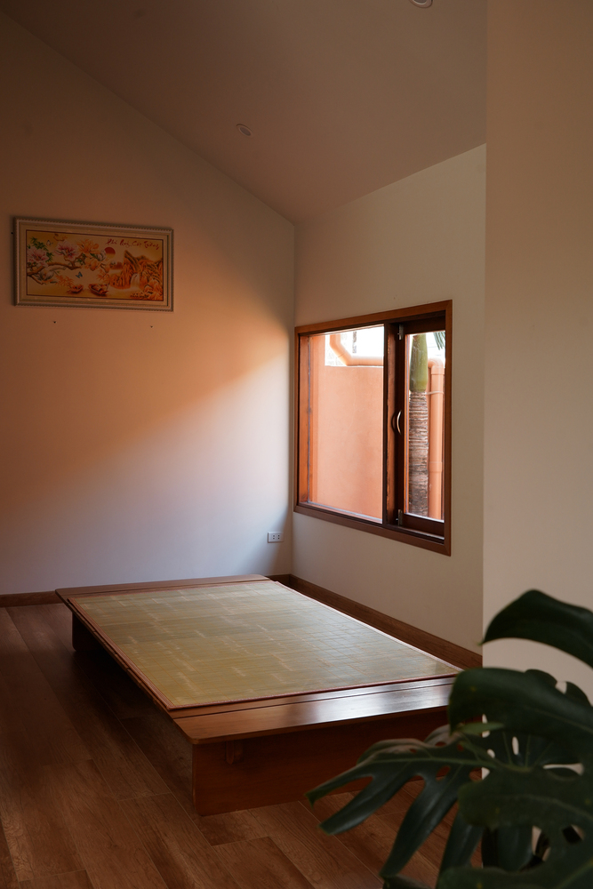 Ngôi nhà của cha mẹ: Truyền thống và nghi lễ – Nằm ngay mặt tiền đường, ngôi nhà của cha mẹ chào đón du khách bằng một khu vườn phía trước ngập tràn ánh nắng – một điểm dừng chân nhẹ nhàng trước khi bước vào. Mặt tiền bằng gạch có kết cấu, với các cửa sổ liên kết góc cạnh và xoay, cân bằng giữa sự riêng tư và sự thoáng đãng, trong khi bóng râm của tre và mái tôn màu đất sét có tuổi thọ duyên dáng theo thời gian. Bên trong, tầng một thông từ phòng khách đến phòng ăn và nhà bếp, mở thẳng ra khu vườn để sinh hoạt trong nhà và ngoài trời dễ dàng. Một cầu thang điêu khắc dẫn lên phòng cầu nguyện ở tầng hai, một hội trường nghi lễ yên bình cũng có chức năng là không gian tụ họp cộng đồng. Một góc đọc sách nhìn ra sân trong, đón gió và ánh sáng ban ngày. Khắp nơi, gạch, tre và gỗ tạo thành một phông nền ấm áp, xúc giác và vượt thời gian, với gạch ốp tường bằng đất nung trong nhà bếp và phòng tắm kết hợp với gạch lát sàn màu be để tăng thêm cảm giác thoải mái.