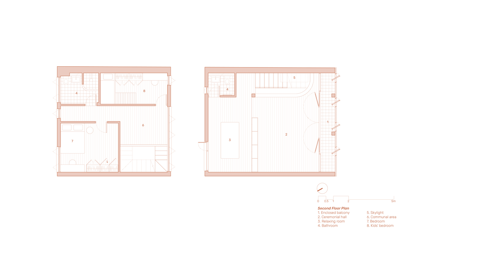 Hai phòng ngủ tràn ngập ánh sáng ở tầng trên, được thông gió qua các khe hở hẹp và giếng trời, luôn mát mẻ và thoáng đãng quanh năm. Vị trí cửa sổ được bố trí hợp lý đảm bảo sự riêng tư nhưng vẫn giữ được sự thông thoáng, tạo cảm giác ngôi nhà rộng rãi hơn so với diện tích thực tế. Thiết kế này minh chứng cho việc quy hoạch chu đáo và kết nối với không gian ngoài trời có thể mang lại cho cuộc sống nhỏ bé sự thoải mái và tự do.