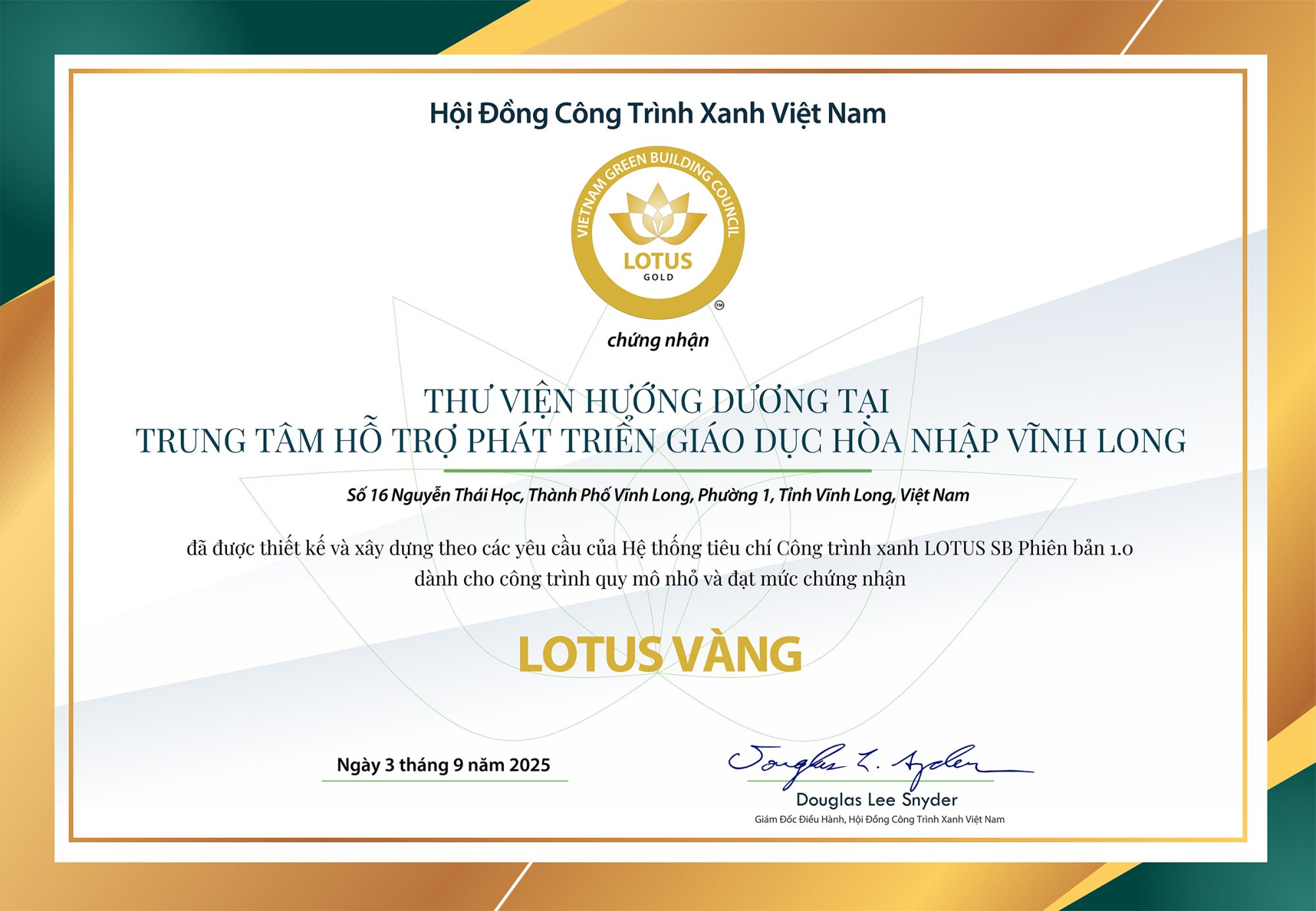 Với tổng kinh phí hợp lý (gần 500 triệu đồng) , Thư viện Hướng Dương đã đạt được chứng nhận Công trình Xanh LOTUS Hạng Vàng – một tiêu chuẩn quốc tế về thiết kế bền vững và vị nhân sinh. Điều này phá vỡ định kiến rằng các công trình chất lượng cao, xanh và hòa nhập đòi hỏi chi phí đầu tư khổng lồ. Dự án đã chứng minh rằng bằng cách áp dụng các nguyên tắc thiết kế thông minh và lựa chọn vật liệu phù hợp, có thể tạo ra những không gian vượt trội với ngân sách khiêm tốn.