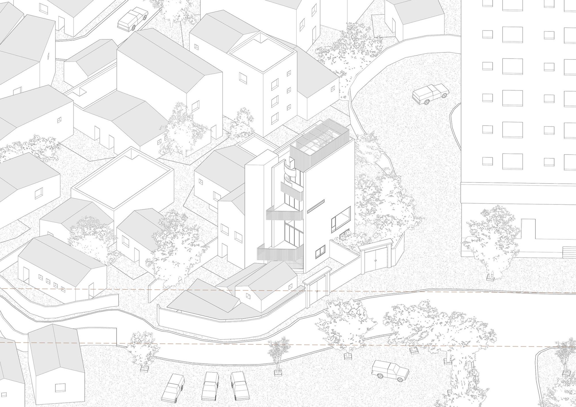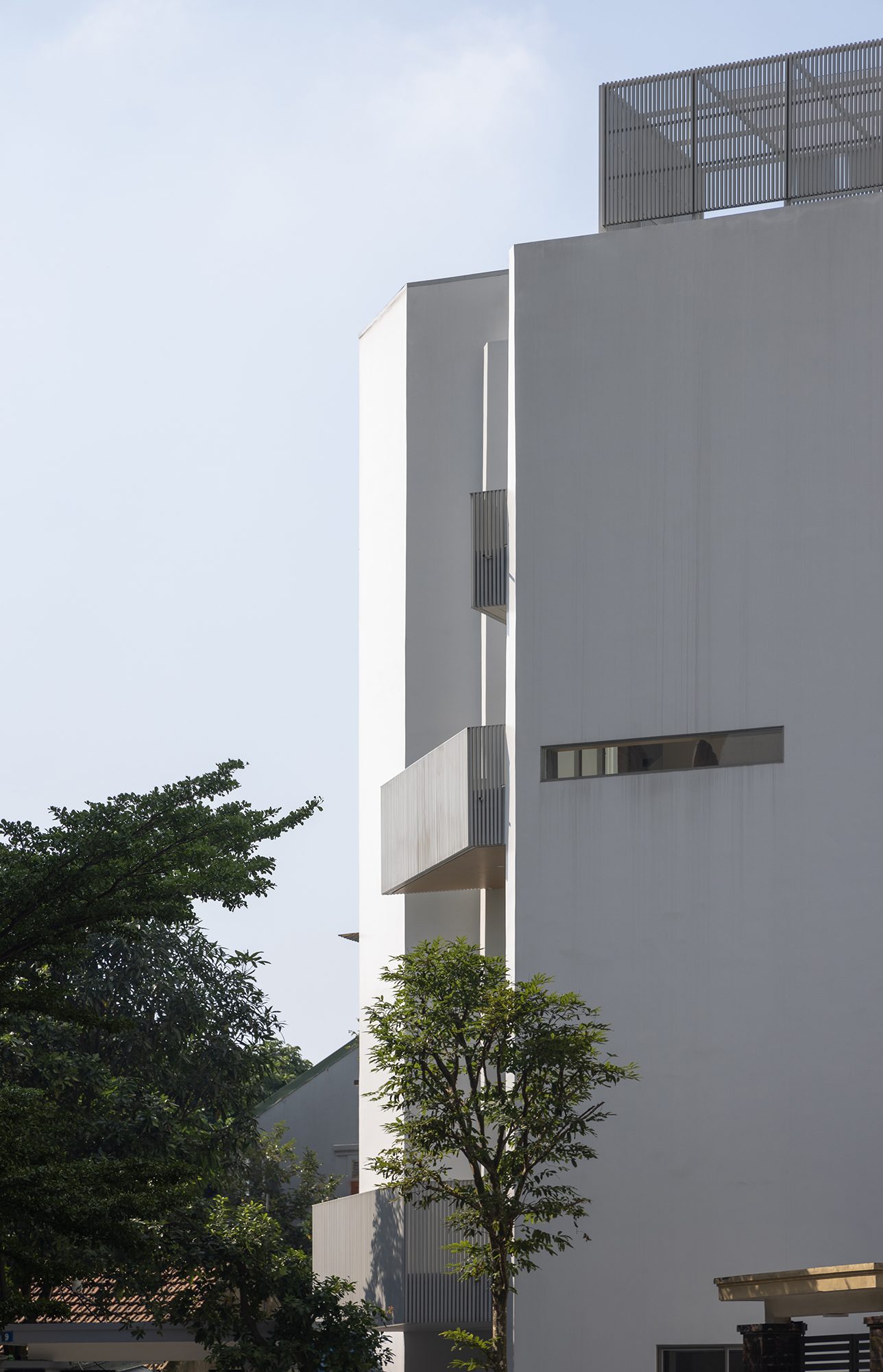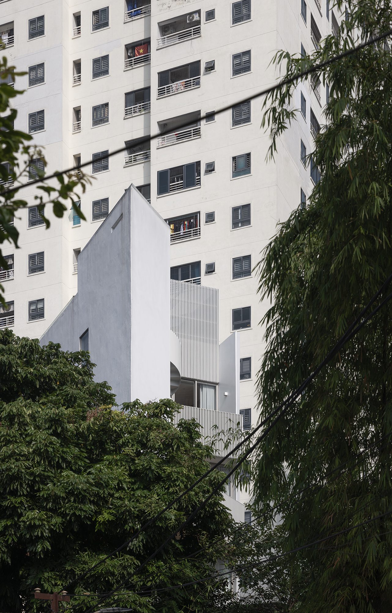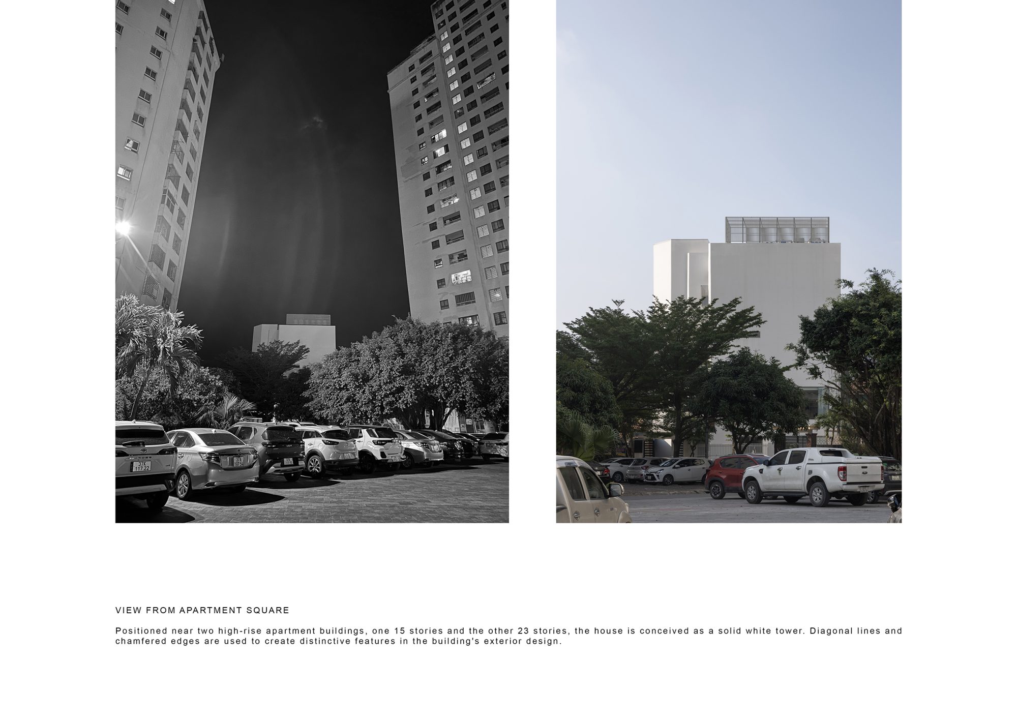 Đặt gần với hai toà chung cư 15 và 23 tầng, ngôi nhà được nhận biết như một khối tháp đặc với một màu trắng đồng nhất. Các đường chéo, vát cắt được sử dụng để tạo các đặc điểm riêng biệt trong thiết kế ngoại thất công trình.