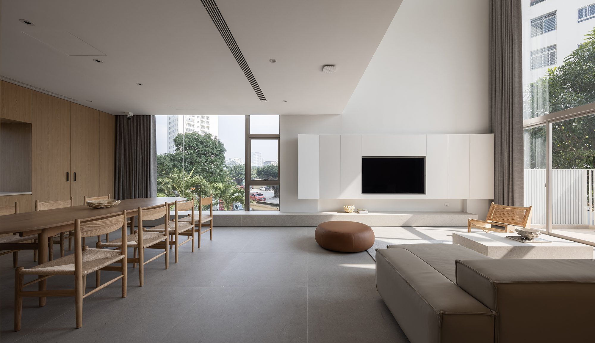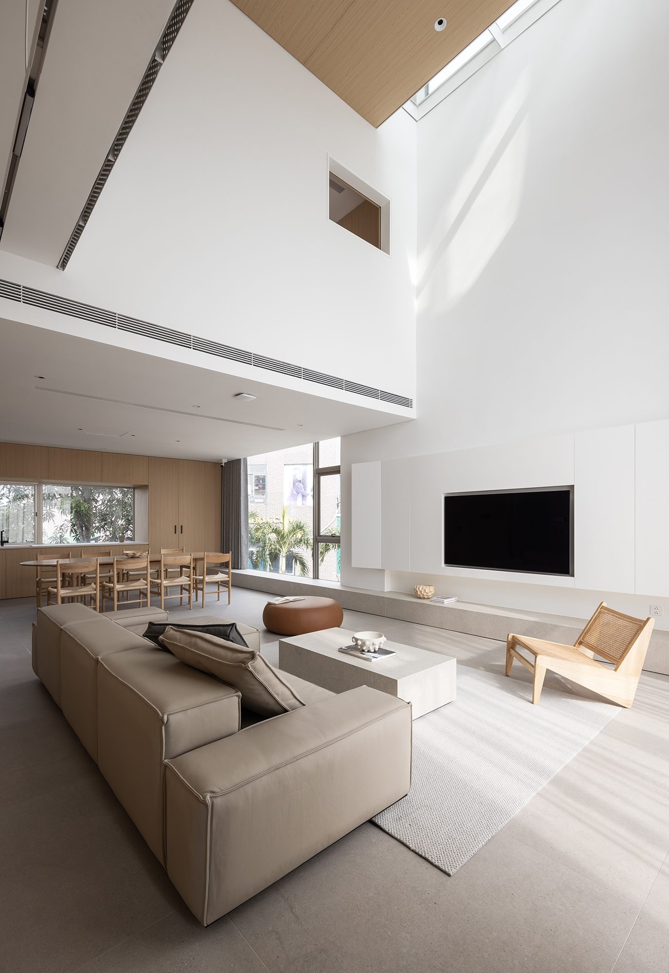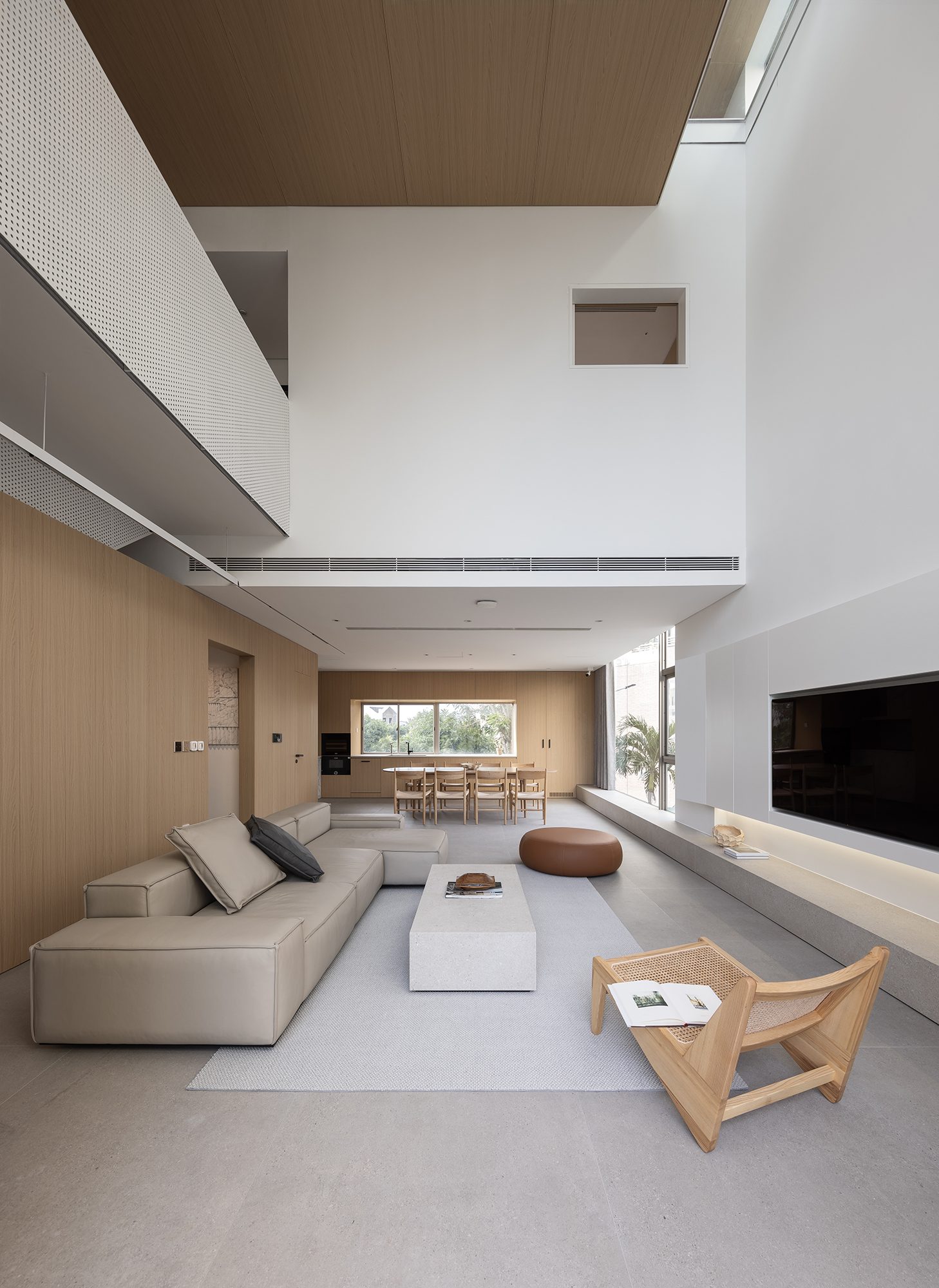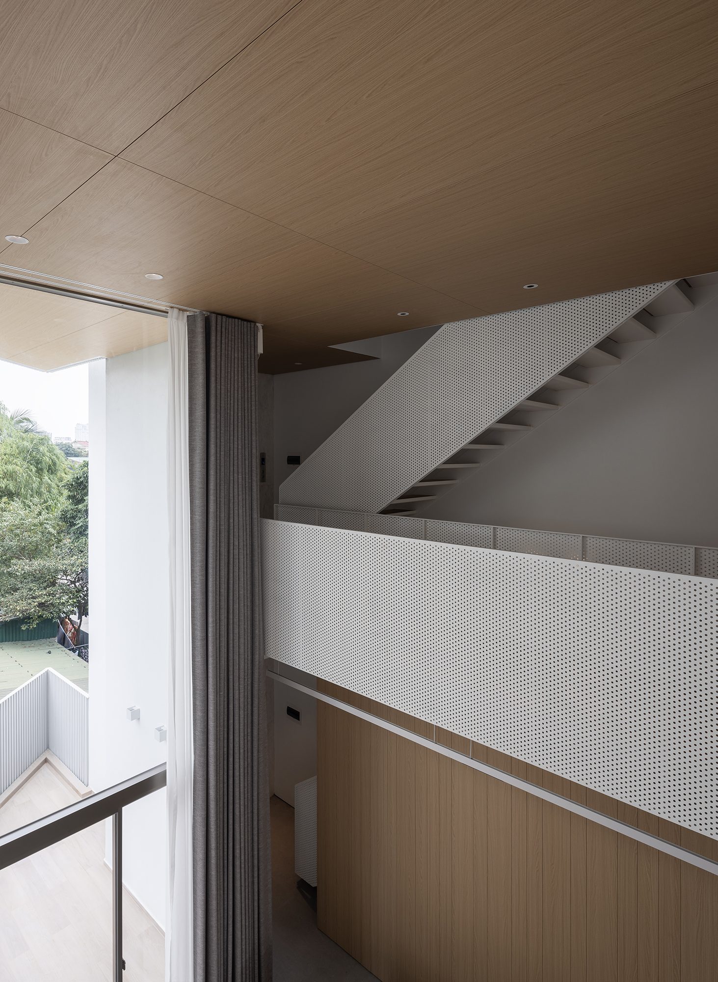 Không gian sinh hoạt của cả gia đình đặt tại tầng hai là nơi được quan tâm nhất với tầm nhìn lớn ra các tán cây trước và sau. Tại đây được bố trí một khoảng thông tầng cao hơn 5 mét mở ra một góc bầu trời không bị che chắn, cảm nhận được sự thay đổi của từng thời khắc trong ngày.