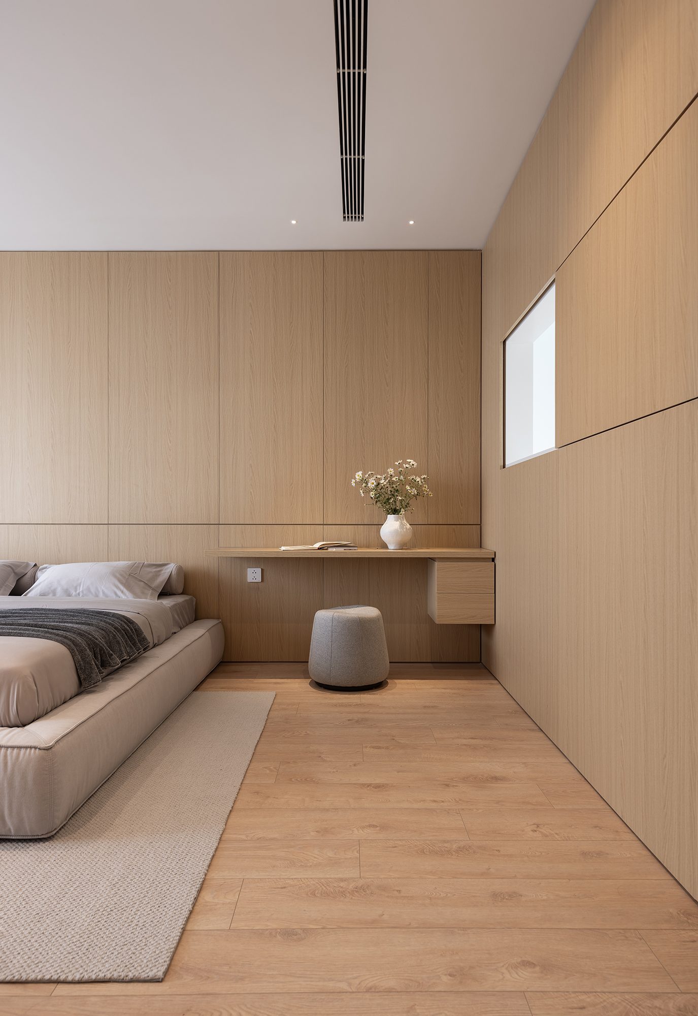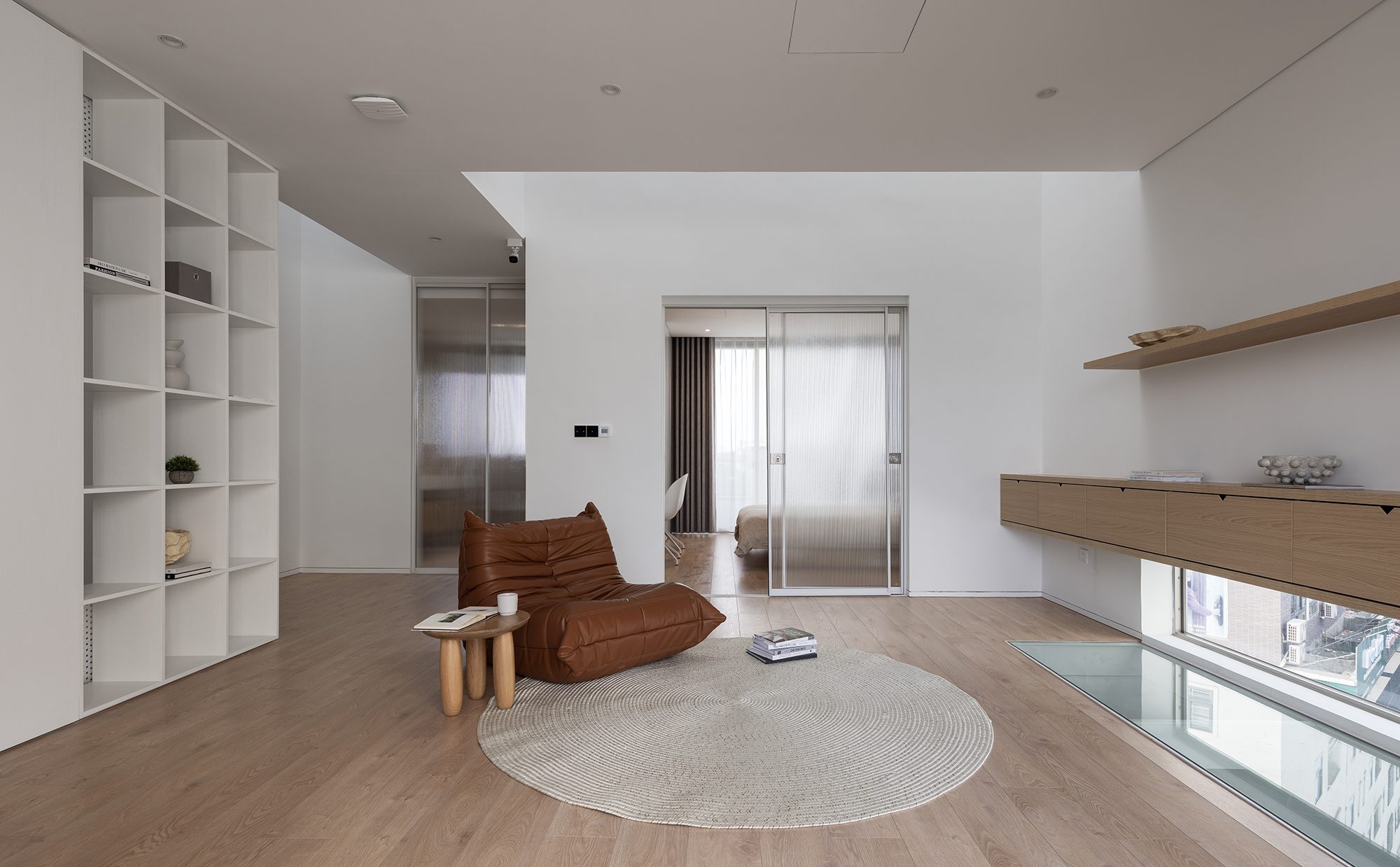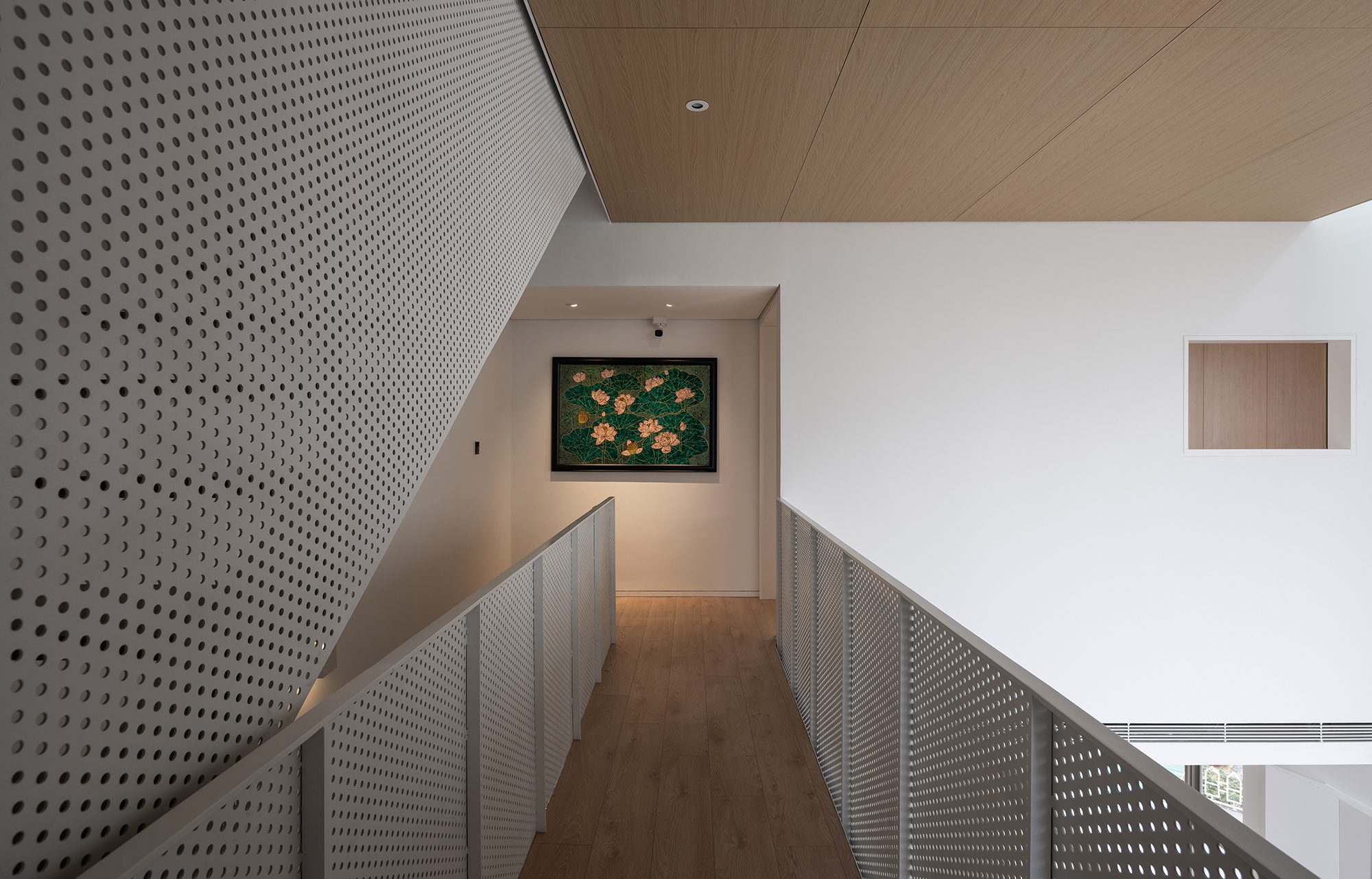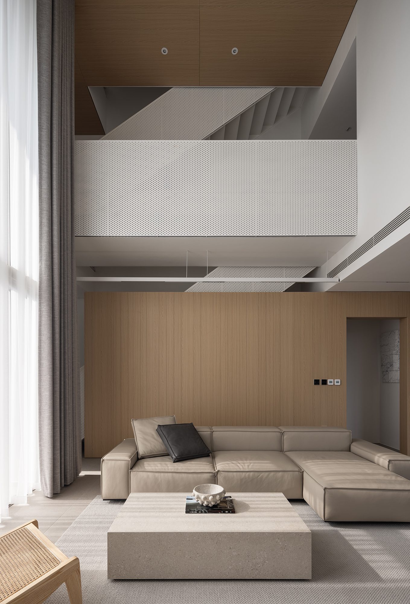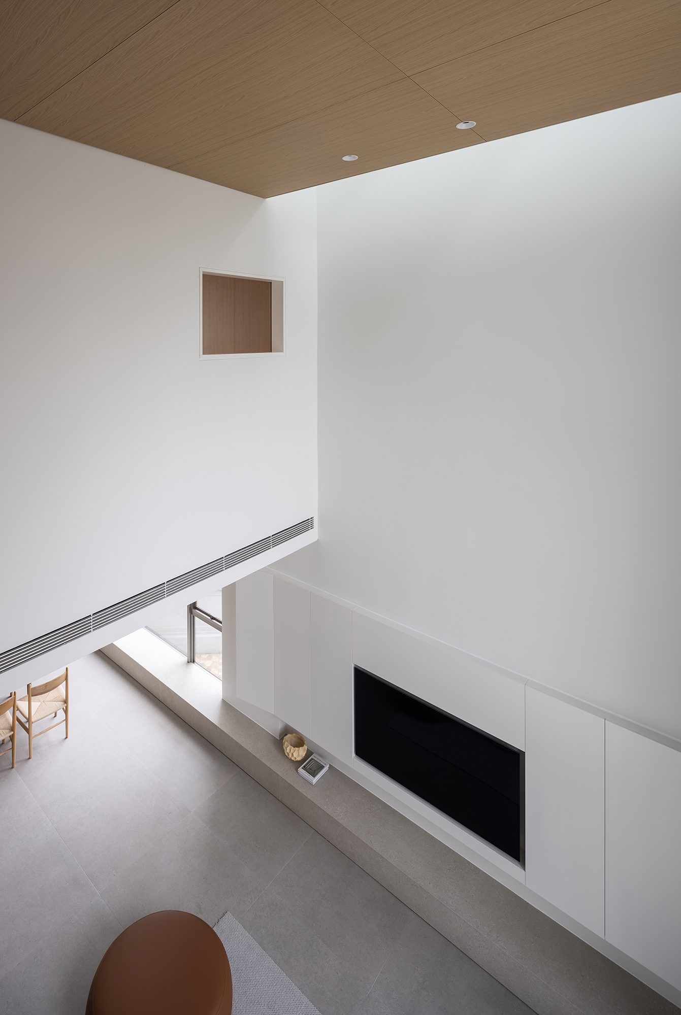 Không gian sinh hoạt của cả gia đình đặt tại tầng hai là nơi được quan tâm nhất với tầm nhìn lớn ra các tán cây trước và sau. Tại đây được bố trí một khoảng thông tầng cao hơn 5 mét mở ra một góc bầu trời không bị che chắn, cảm nhận được sự thay đổi của từng thời khắc trong ngày.