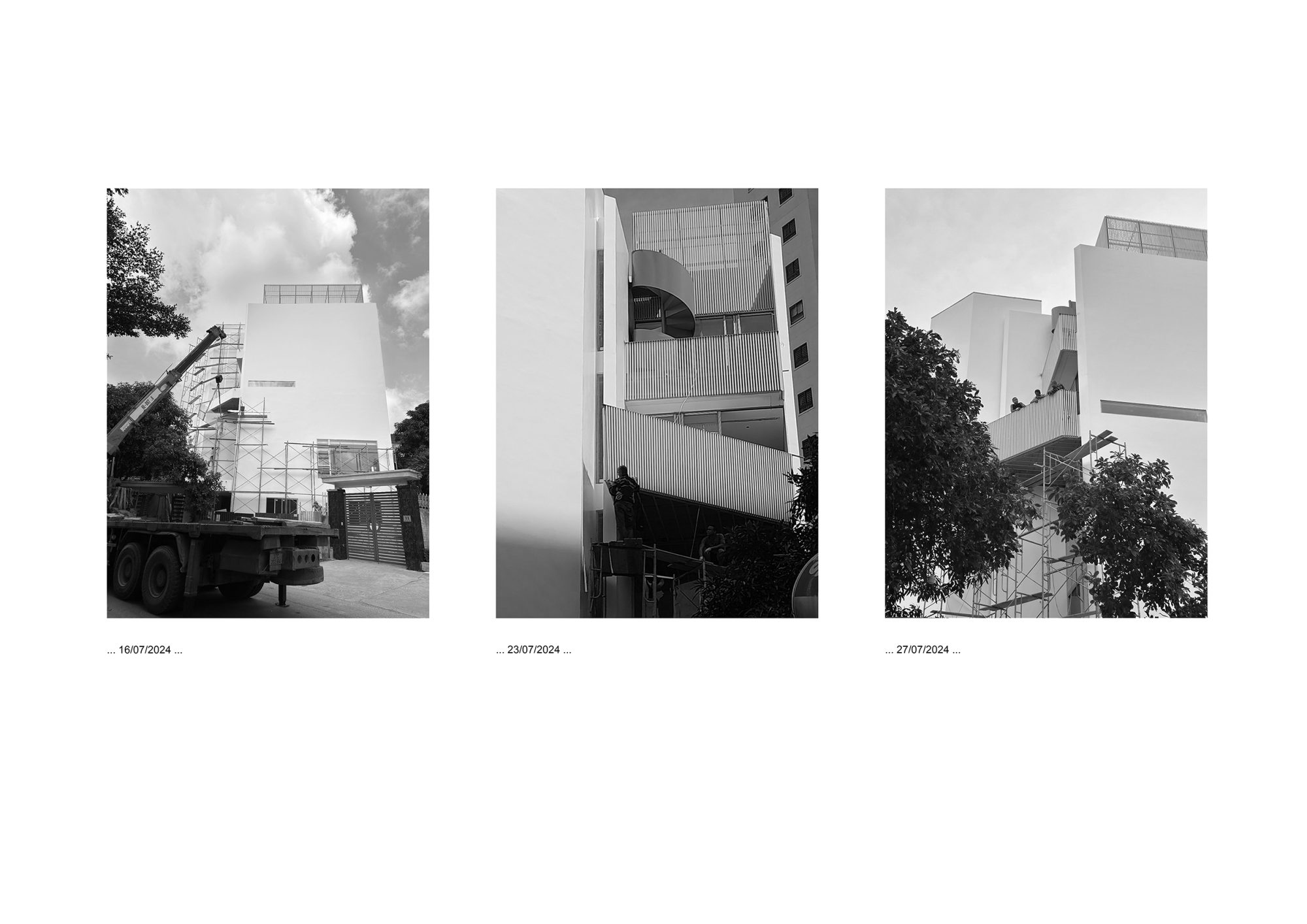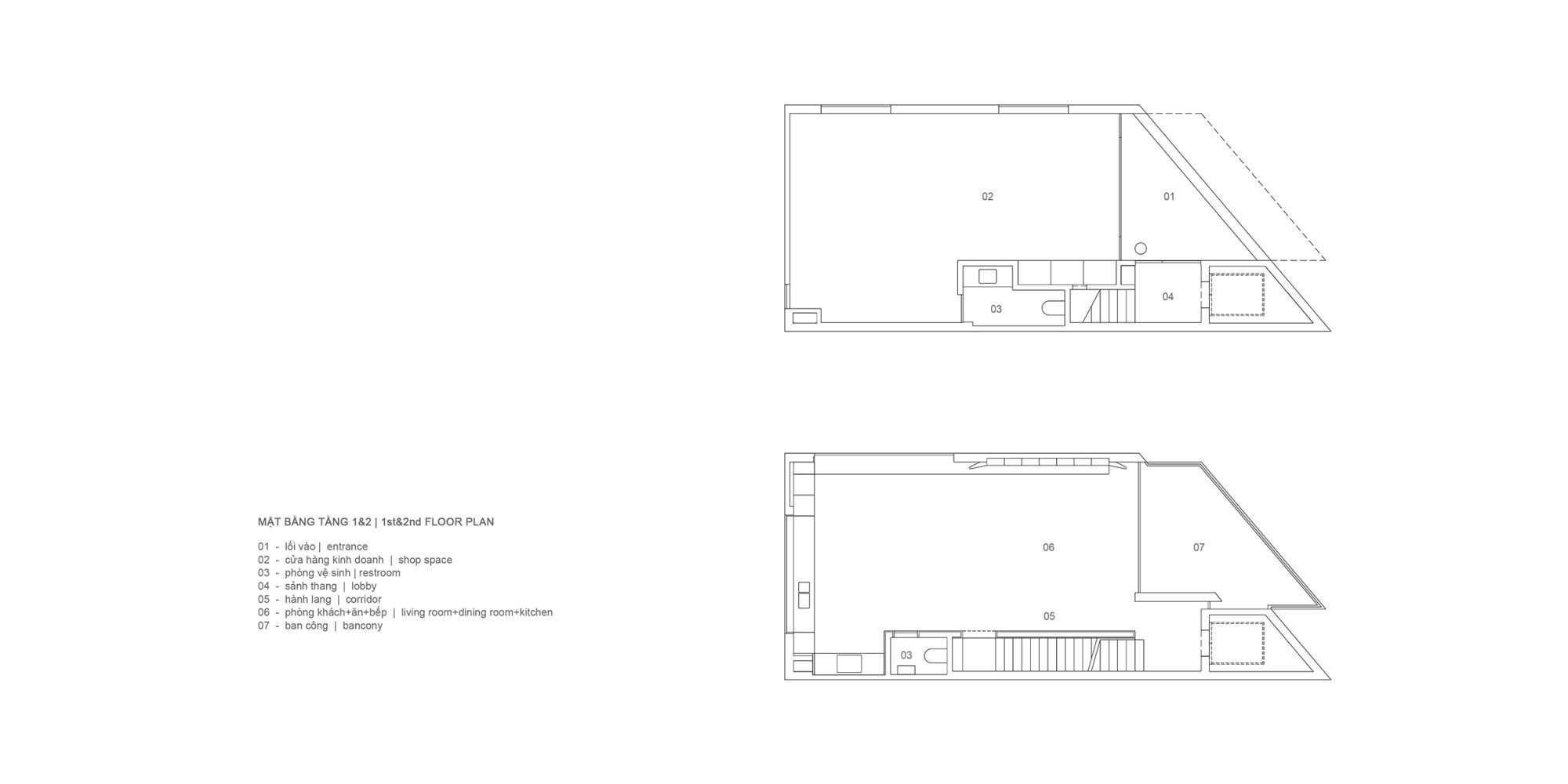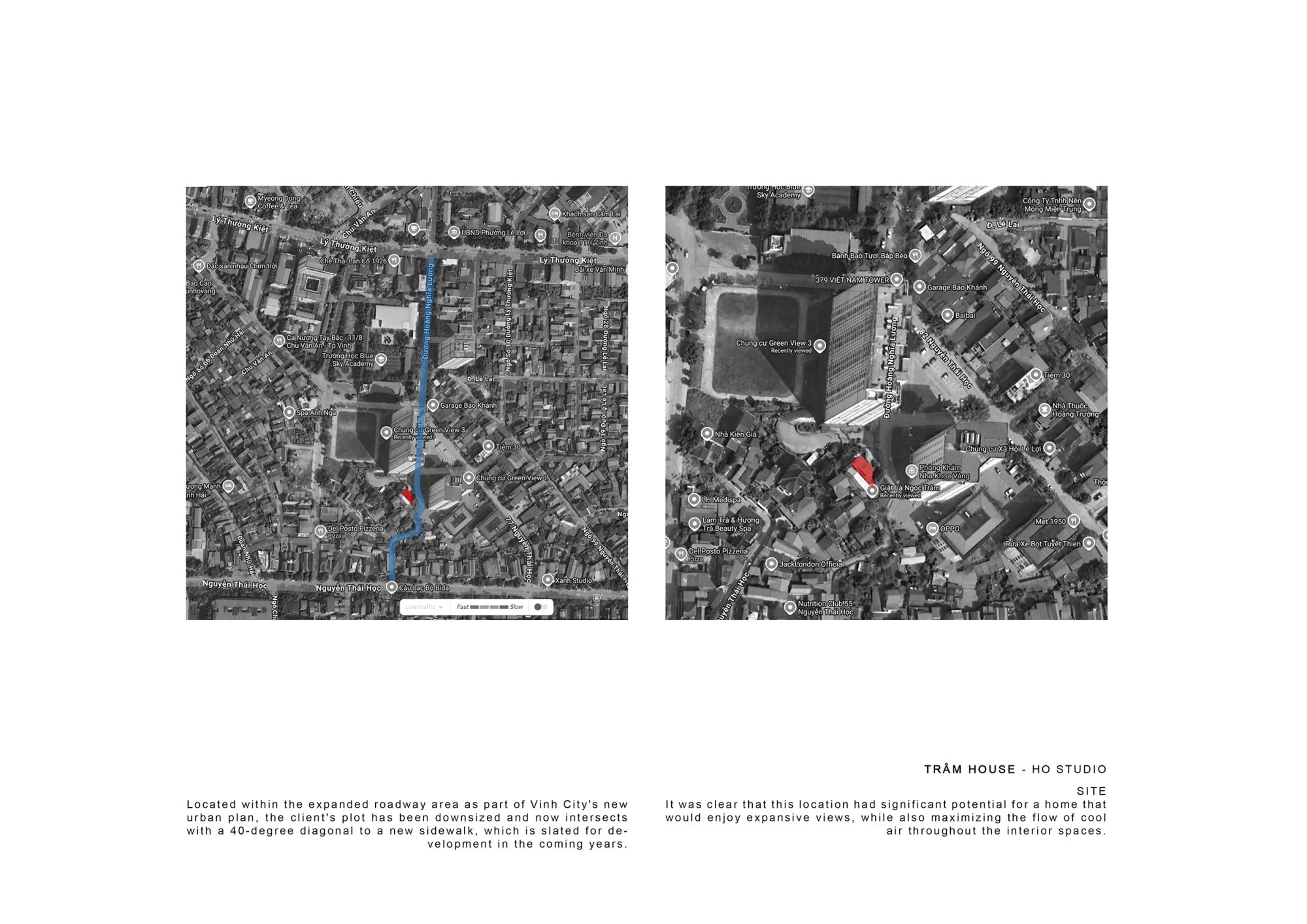 1. Nằm trong phạm vi mở rộng đường theo quy hoạch mới tại thành phố Vinh, khu đất của khách hàng vừa cắt giảm diện tích, vừa tạo ra một đường chéo 40 độ với vỉa hè mới-đang được lên kế hoạch thực hiện trong vài năm tới. Khi khảo sát khu đất vào năm 2023, lúc này đang là ngôi nhà một tầng khá khép kín, được sử dụng hơn hai mươi năm và có phần nền rất thấp. Lúc cùng khách hàng đứng trên mái ngôi nhà cũ chúng tôi ngay lập tức cảm nhận được nơi này rất mát bởi lượng gió dồi dào thổi qua, cảnh quan xung quanh rất thoáng và tồn tại khoảng trống đô thị ở ba mặt. Với chúng tôi, rõ ràng là vị trí này có tiềm năng lớn cho một ngôi nhà có tầm nhìn rộng mở, đồng thời tối đa hóa luồng không khí di chuyển qua toàn bộ không gian bên trong.
