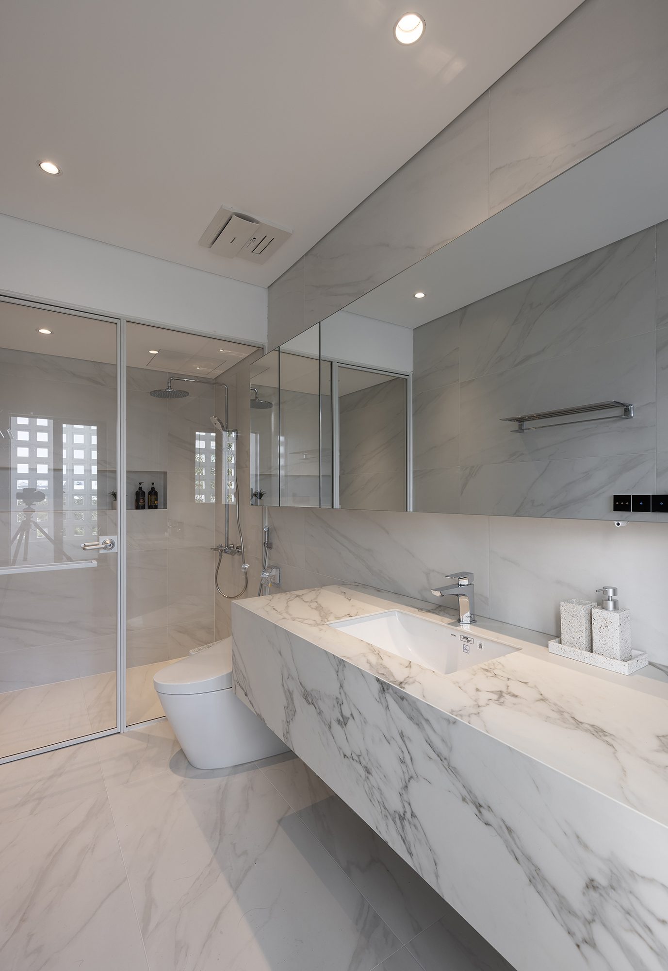 – Mở ra những mảng kính lớn hướng Đông-Nam, hướng có tòa nhà chung cứ 15 tầng che chắn phần lớn ánh sáng (tiêu cực). Bố trí cửa kính trượt với khoảng lùi có ban công, gạch thông gió ở hướng Tây-Bắc (phía sau).
