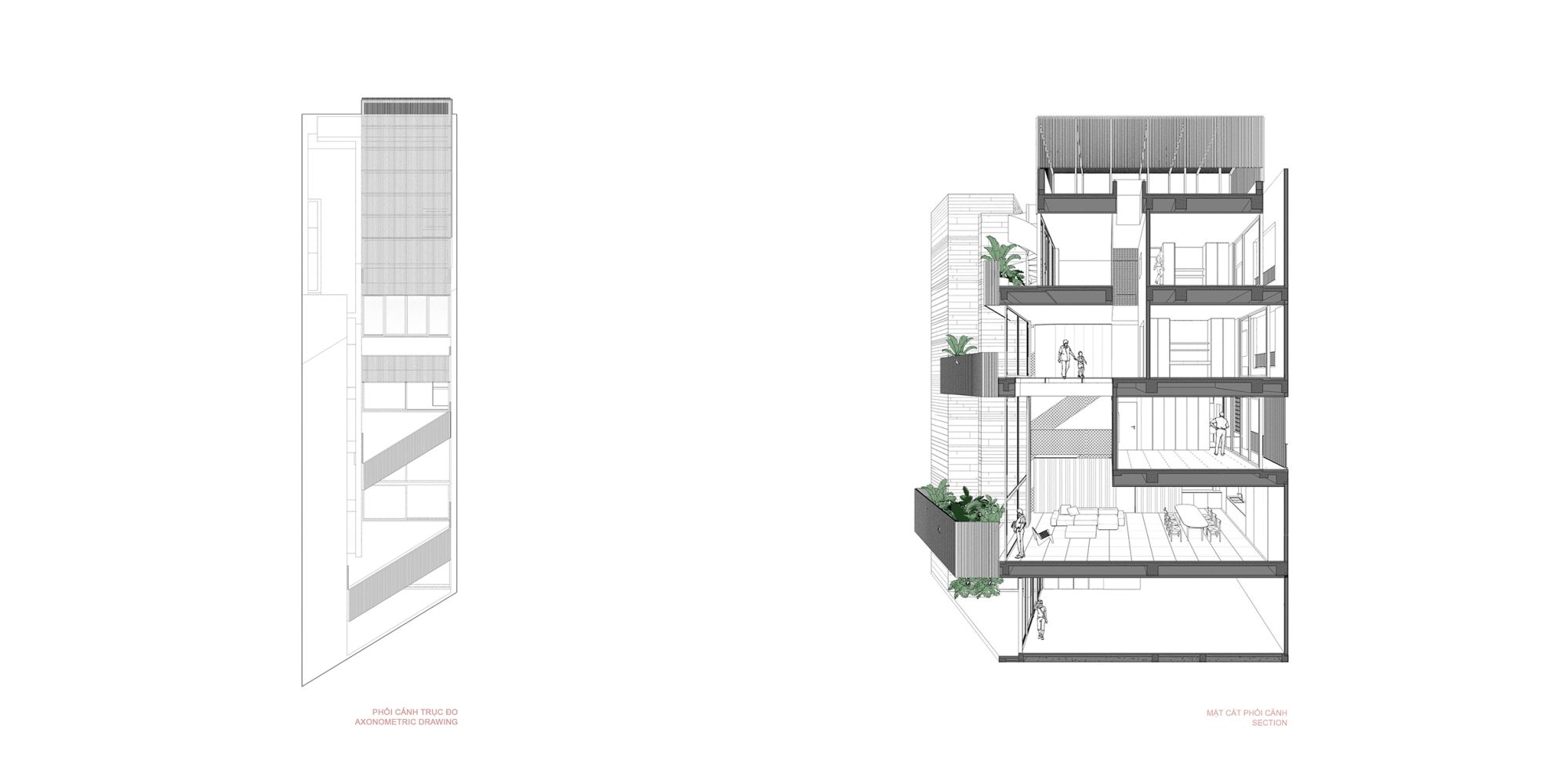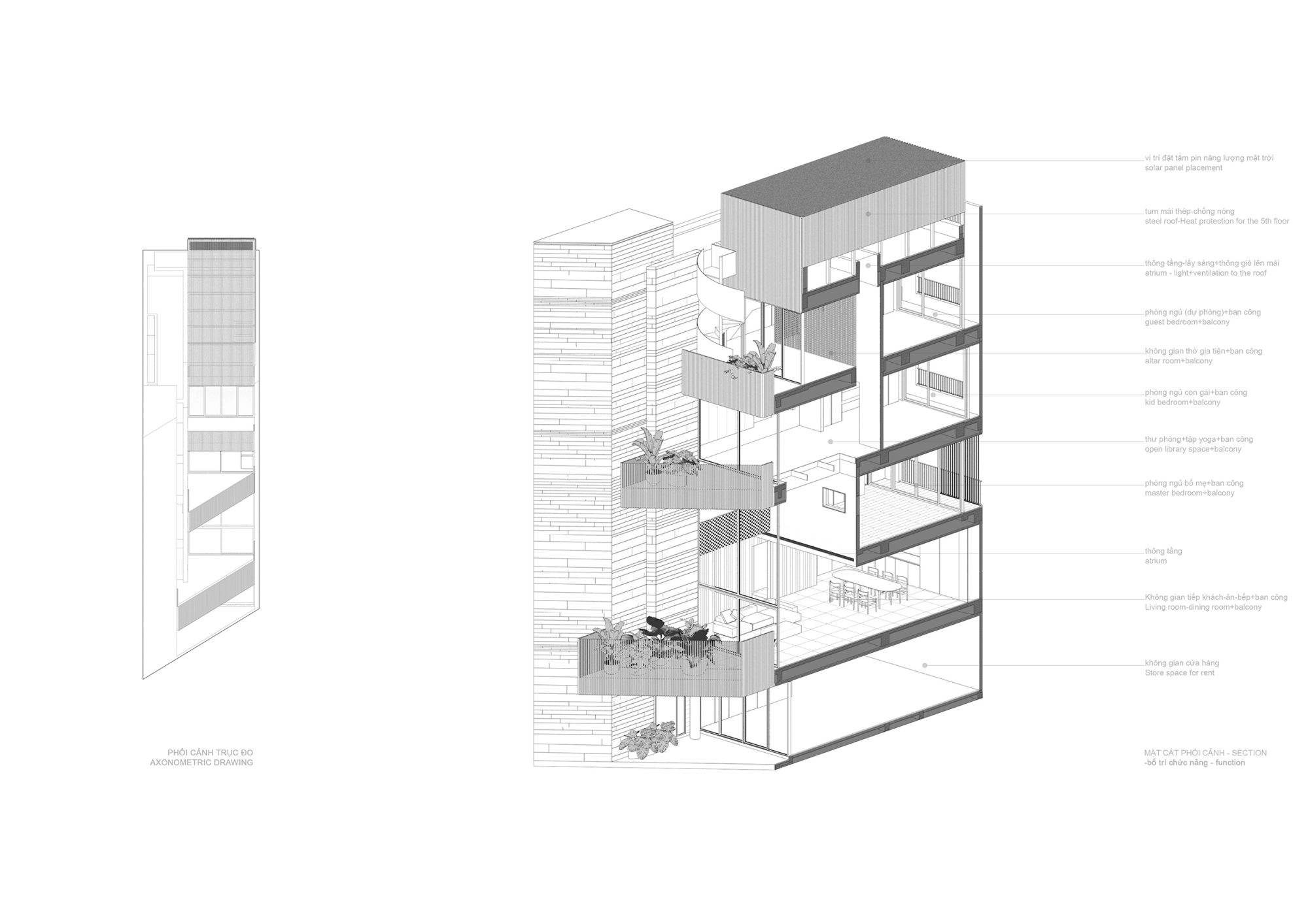 Ánh sáng tự nhiên được chào đón thông qua hình thể ngôi nhà, đường cắt, giếng trời và phần kính lớn. Cây xanh sẽ được phủ đầy suốt ba ban công giật bậc thang (to nhỏ khác nhau) như những khu vườn treo phía trước nhà, lúc này thảm thực vật tựa vào phần khối đặc phía tây hỗ trợ nâng cao chất lượng sống cho các không gian kế cận.