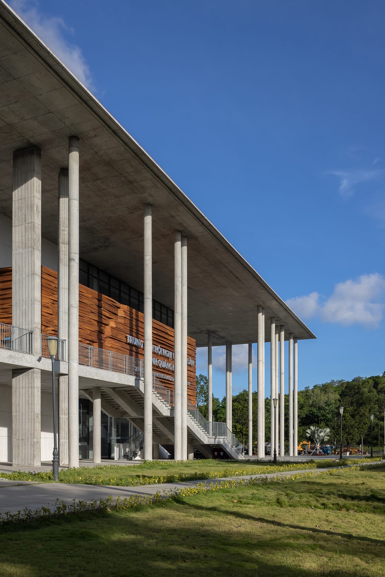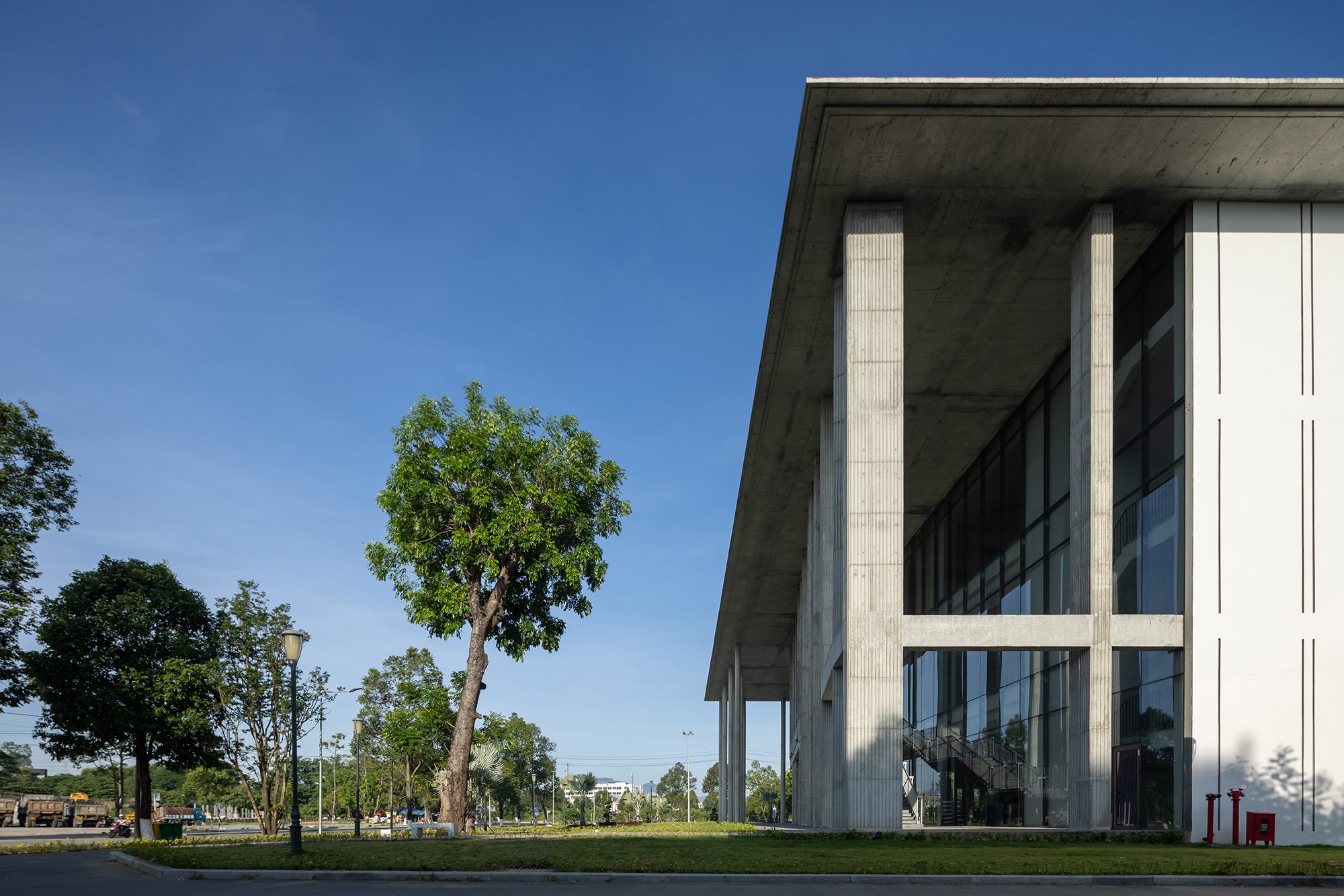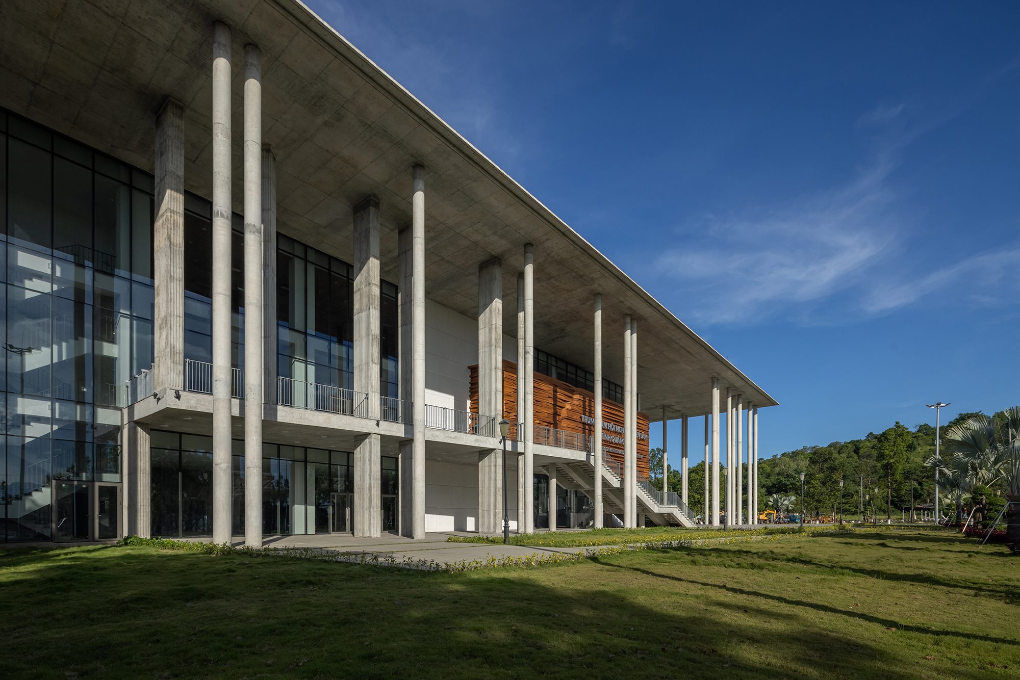 Toàn bộ kết cấu chính và lớp hoàn thiện bao che được thi công bằng bê tông trần tại chỗ, phù hợp với năng lực thi công của đội ngũ địa phương, giúp tối ưu chi phí và bảo đảm độ bền vững trước khí hậu khắc nghiệt với nắng nóng, mưa lớn và gió bão thường xuyên.