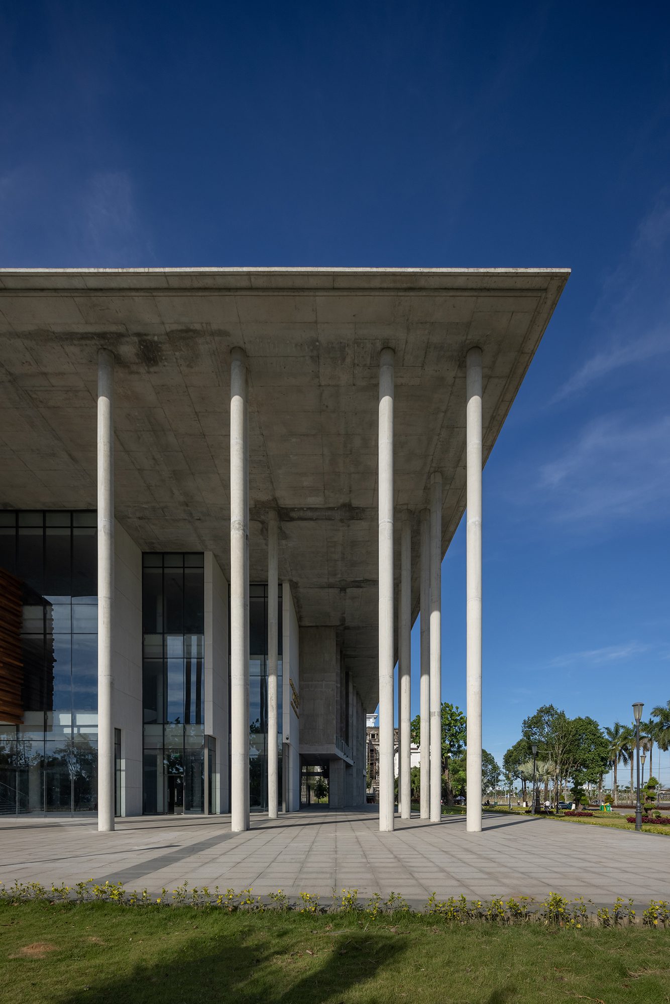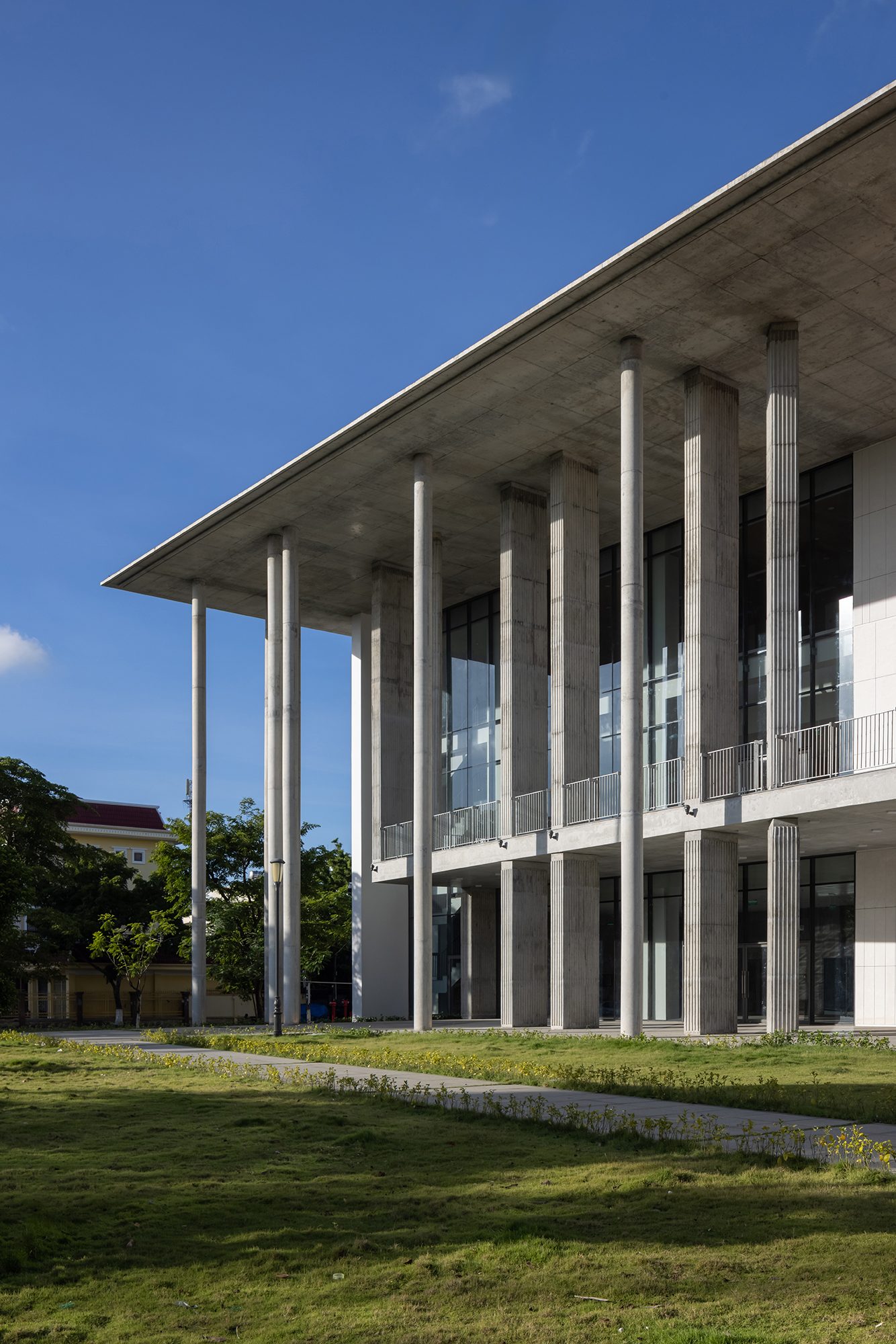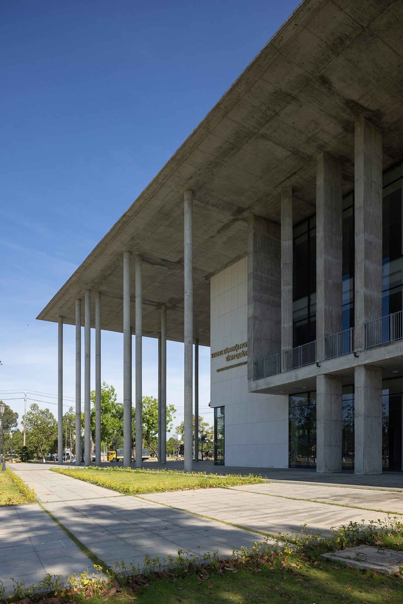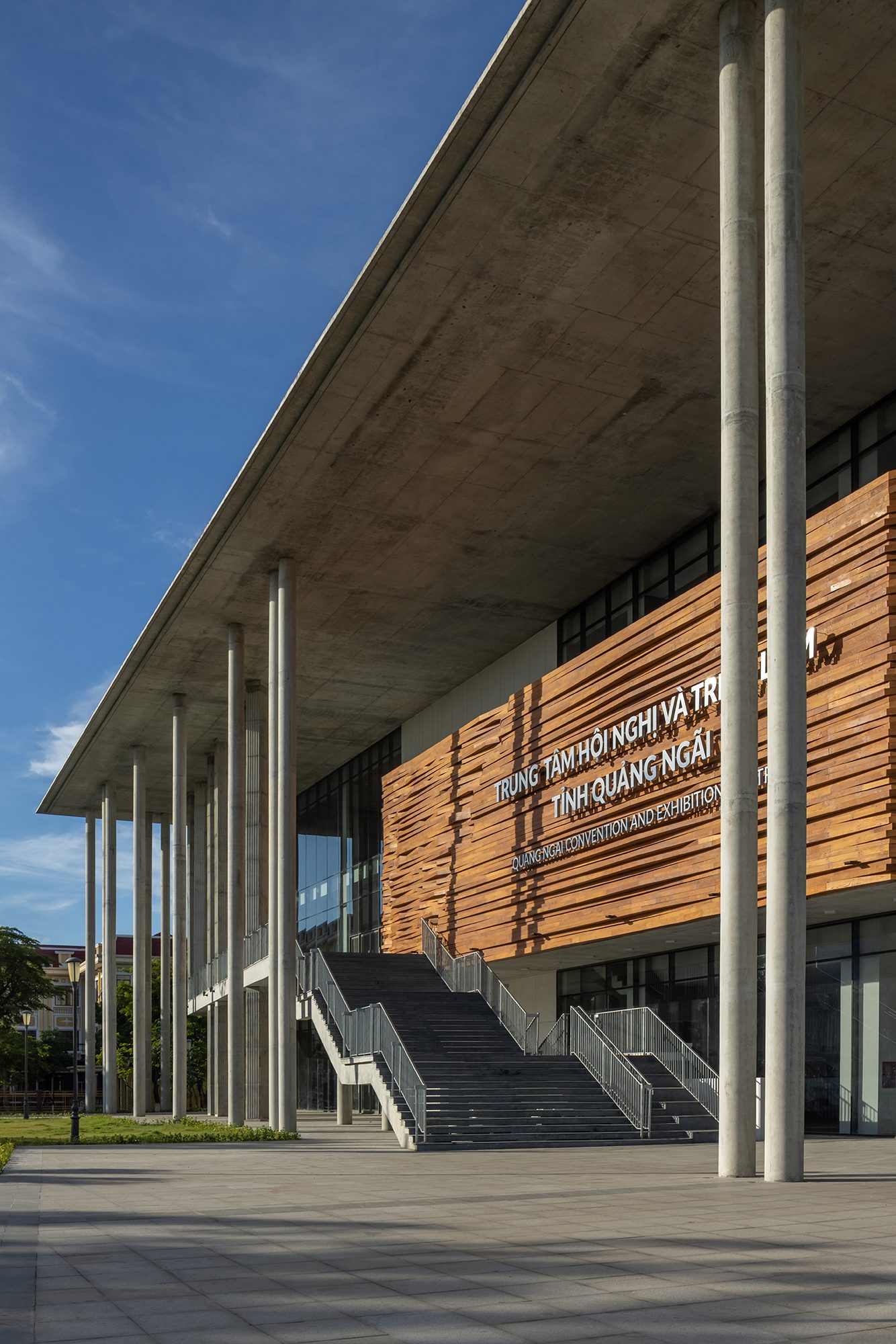 Sảnh đón được thiết kế với hệ cột cao rộng và mái vươn lớn, giúp che nắng hướng Tây, đồng thời tạo nên một không gian chào đón trang trọng và cởi mở. Lối vào bậc cấp mở rộng đóng vai trò điểm nhấn thị giác, mang lại sự cân đối và nét uy nghi cho tổng thể.