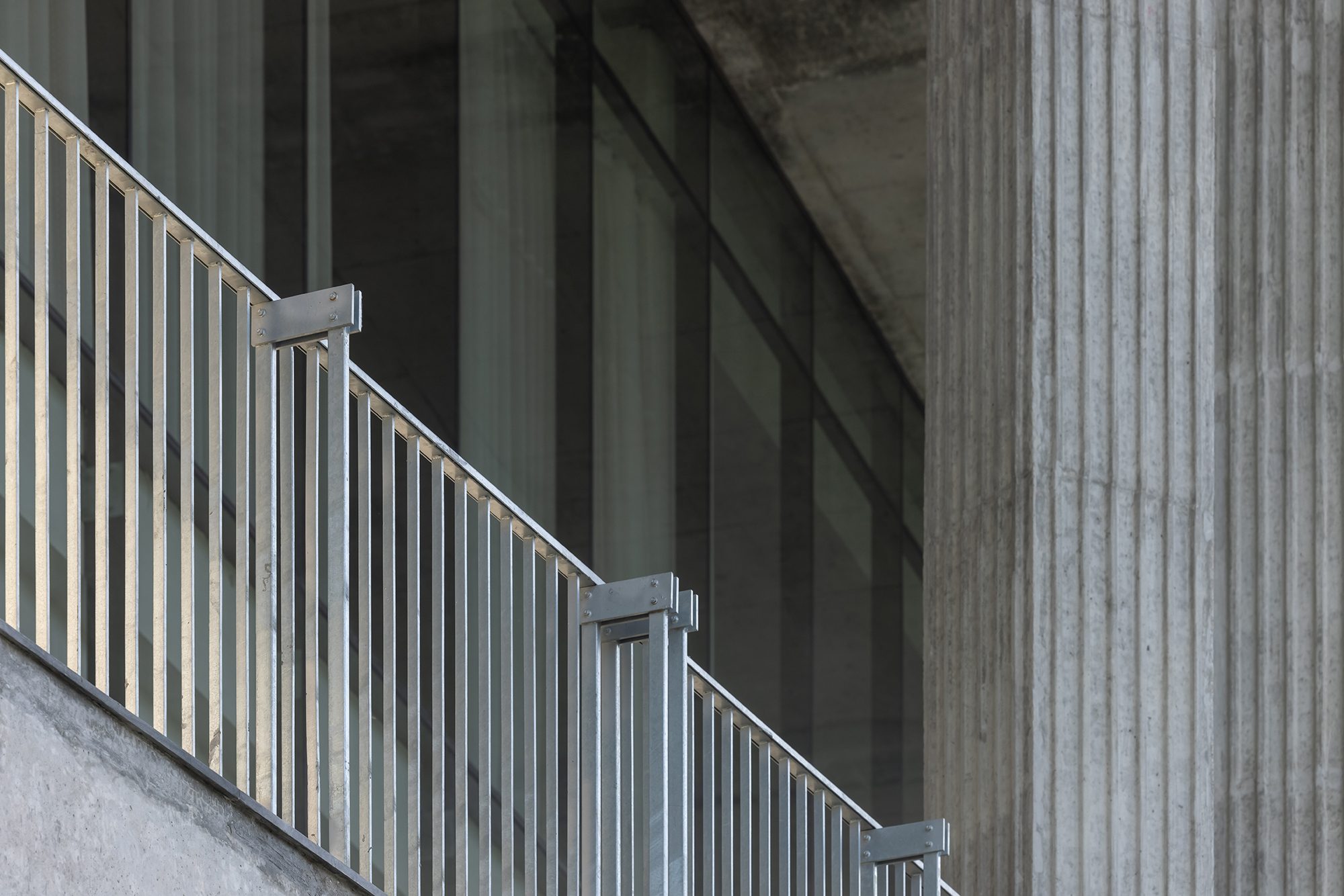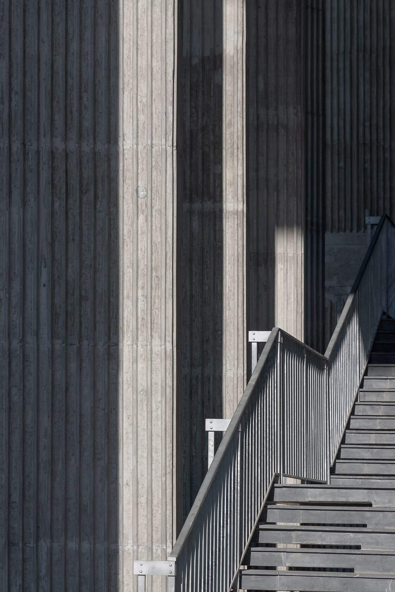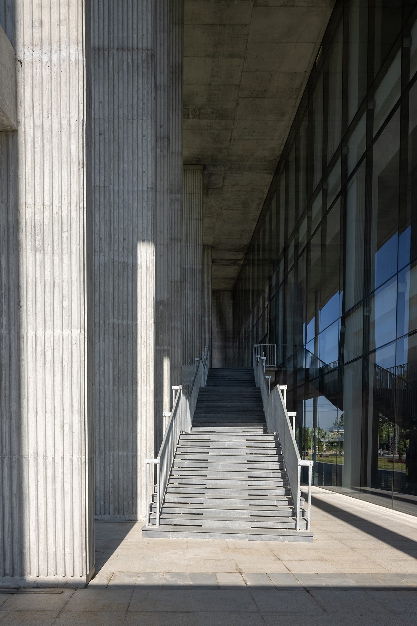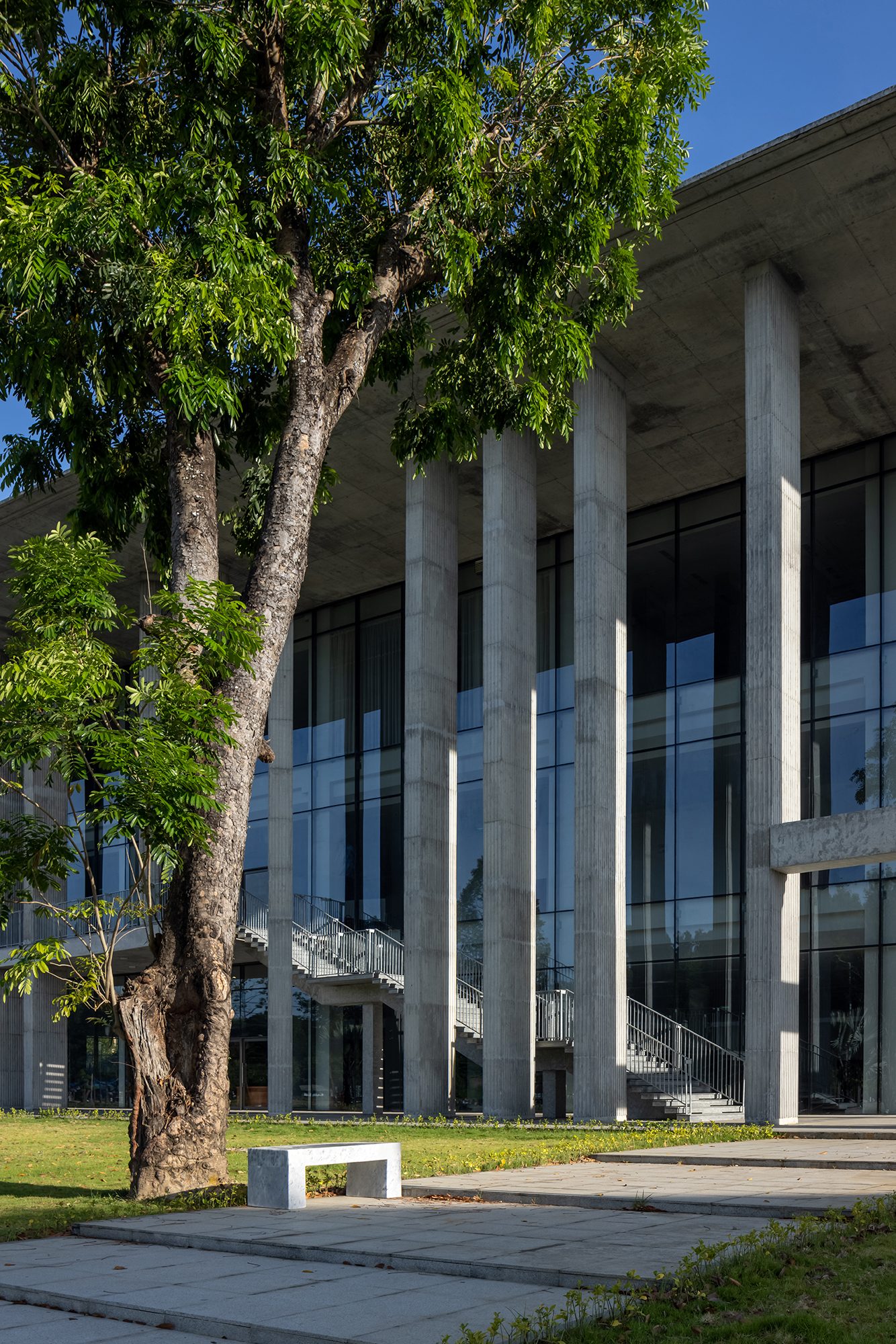 Sảnh đón được thiết kế với hệ cột cao rộng và mái vươn lớn, giúp che nắng hướng Tây, đồng thời tạo nên một không gian chào đón trang trọng và cởi mở. Lối vào bậc cấp mở rộng đóng vai trò điểm nhấn thị giác, mang lại sự cân đối và nét uy nghi cho tổng thể.