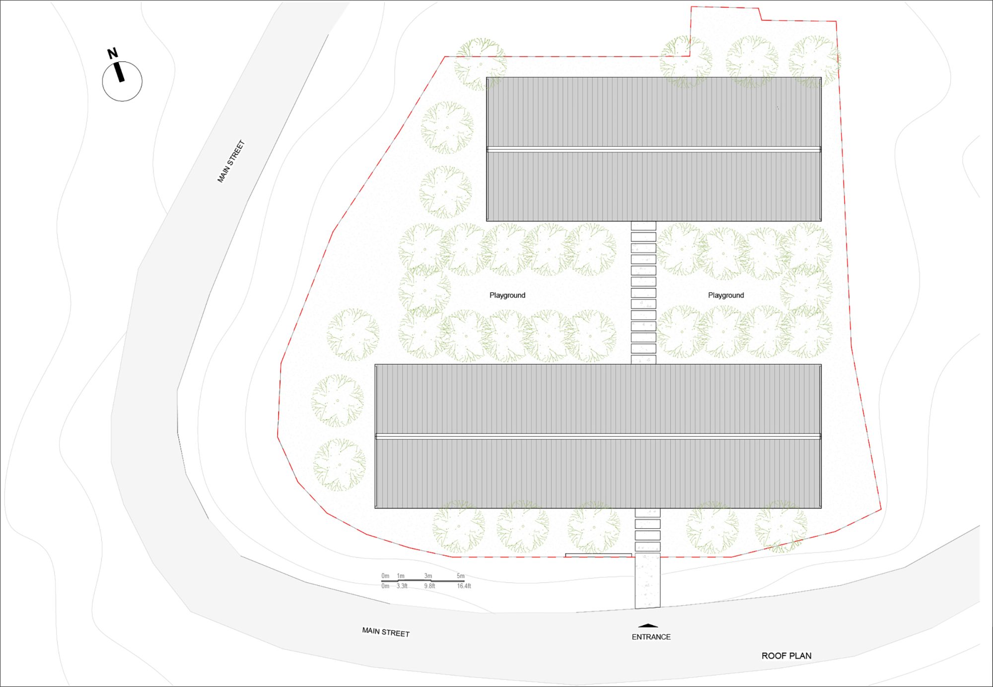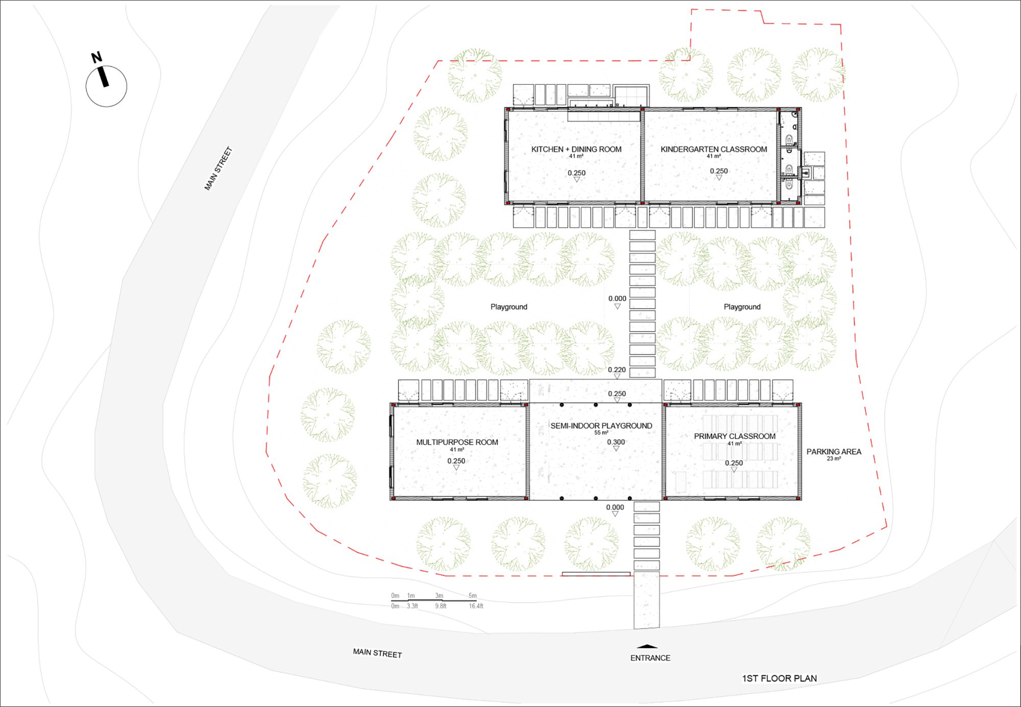 Với định hướng bảo tồn tối đa cảnh quan cây xanh hiện hữu và đưa công trình hòa mình vào thiên nhiên, các phòng học và dãy nhà được bố trí để cửa sổ mở tầm nhìn về phía các dãy núi phủ kín cây xanh, đồng thời sân giữa có hướng mở view nhìn toàn cảnh về phía thung lũng.
