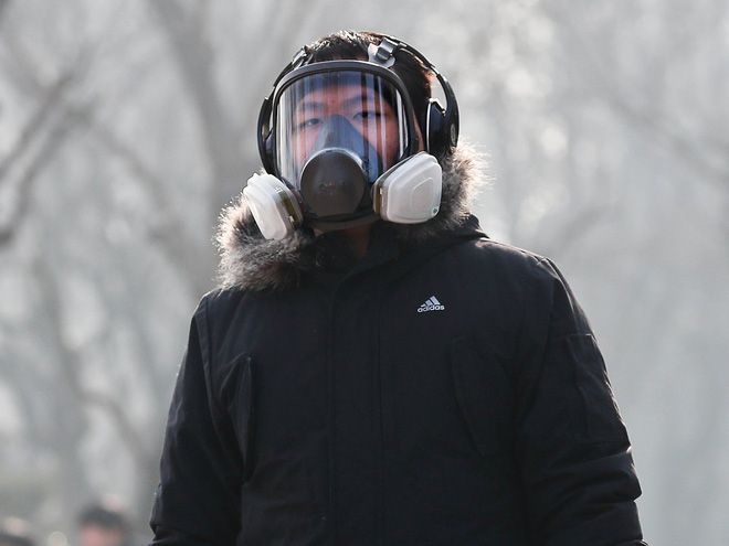 Một thanh niên đeo mặt nạ đặc biệt với mức độ bảo vệ được cho là cao để chống chọi với ô nhiễm không khí ở Bắc Kinh – Nguồn: Business Insider/AP.