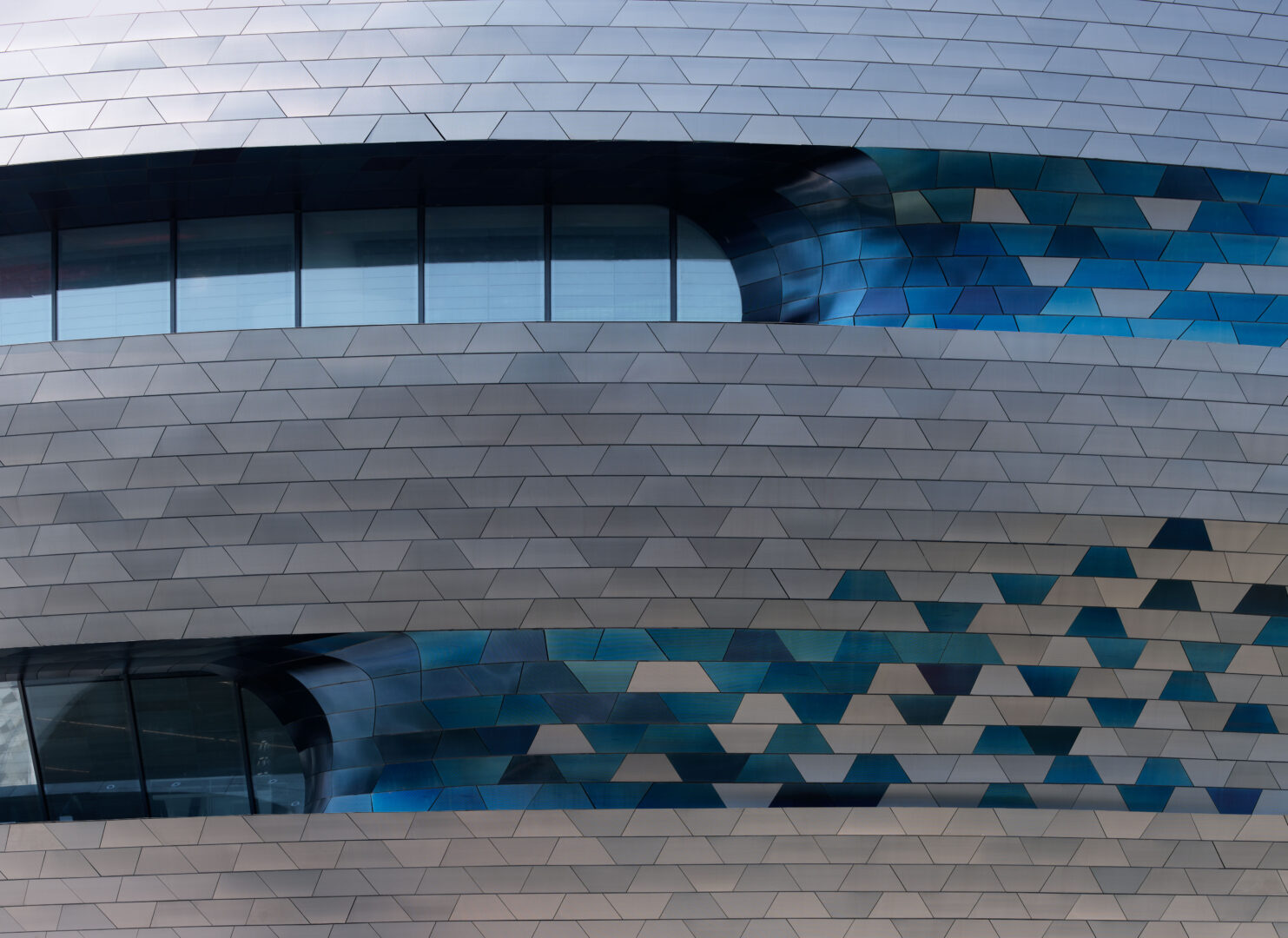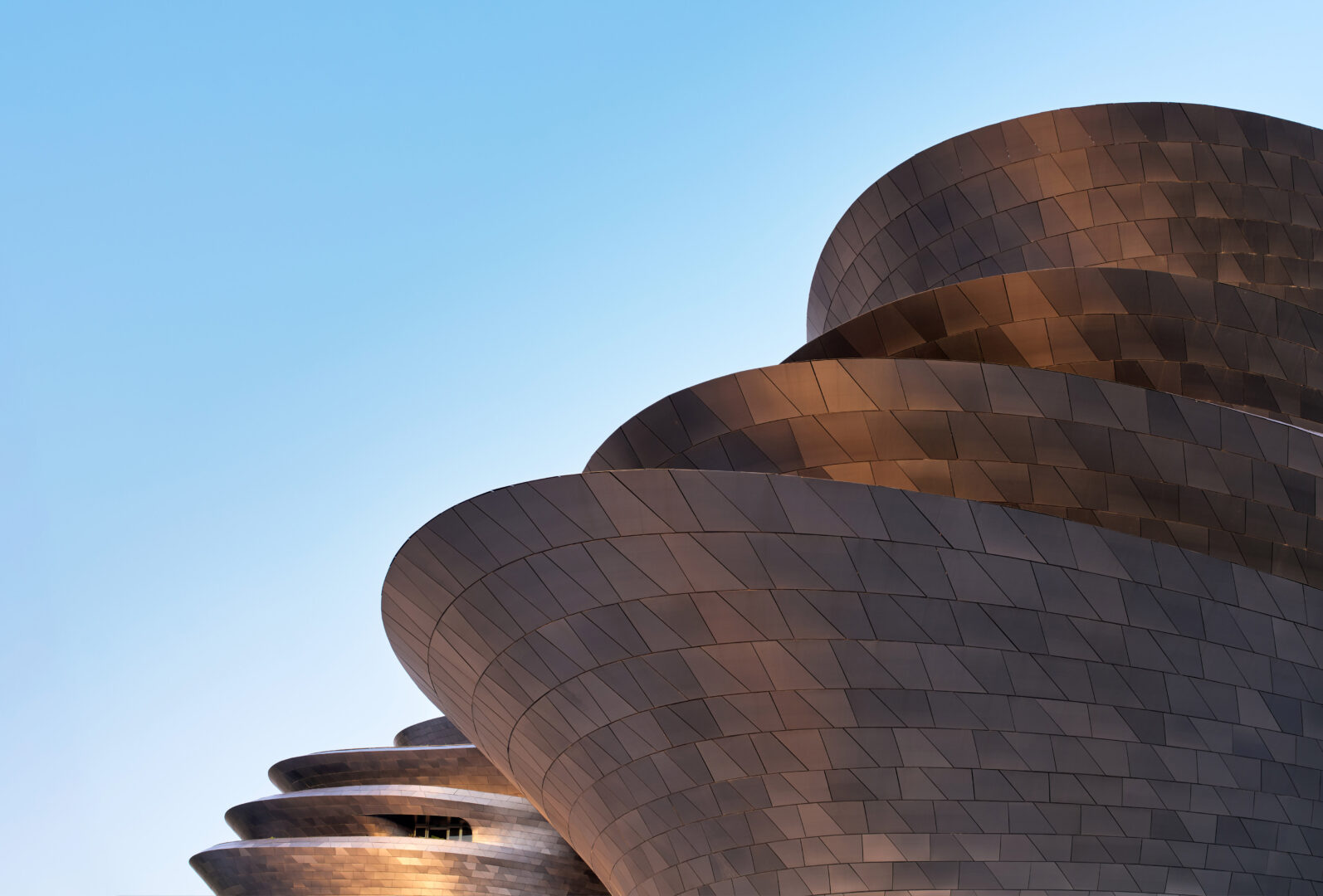 Nhìn từ xa, bảo tàng không khác gì một con tàu đồ sộ, dũng mãnh tiến tới tương lai. Toàn bộ khối nhà có tạo hình chữ U ấn tượng, khoác lên mình lớp vỏ bọc thép không gỉ “hai màu” từ việc ứng dụng công nghệ xử lý bề mặt INCO(1) tiên tiến, để tạo hiệu ứng chuyển màu tinh tế từ xanh đậm sang xám bạc, gợi liên tưởng đến sự chuyển động của các thiên thể trong không gian. Bên cạnh giá trị thẩm mỹ, lớp vỏ cũng đồng thời đóng vai trò là “lá chắn khí hậu”: Tạo lớp đệm thông gió, hạn chế hấp thụ nhiệt và bảo vệ công trình trước tác động khắc nghiệt của thời tiết.