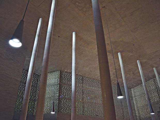 Phòng trưng bày với vật liệu chủ đạo: đá của nền móng cổ và một phần nhà nguyện, gỗ – vật liệu xuyên suốt thời gian, bêtông trần và gạch nung – vật liệu hiện đại.