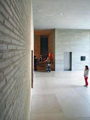 Lối vào bảo tàng lùi sâu vào, khiêm tốn trong tổng thể khối công trình / Sảnh đệm tràn ngập ánh sáng từ vườn, tường ngăn nội thất sử dụng vật liệu gạch nung nhắc lại của ngoại thất.