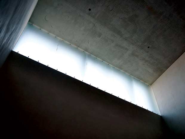Cũng từ phía trong của bảo tàng, chúng ta cũng sẽ tự lý giải được câu hỏi về bố cục và hình dáng của những ô cửa sổ lấy sáng trên mặt tiền. Những ô cửa lớn từ sàn đến trần, ngang tới tận tường ngăn, để không gian trong – ngoài chảy vào nhau và để ánh sáng tự nhiên có thể lùa sâu vào trong phòng, thay đổi theo từng thời điểm trong ngày.